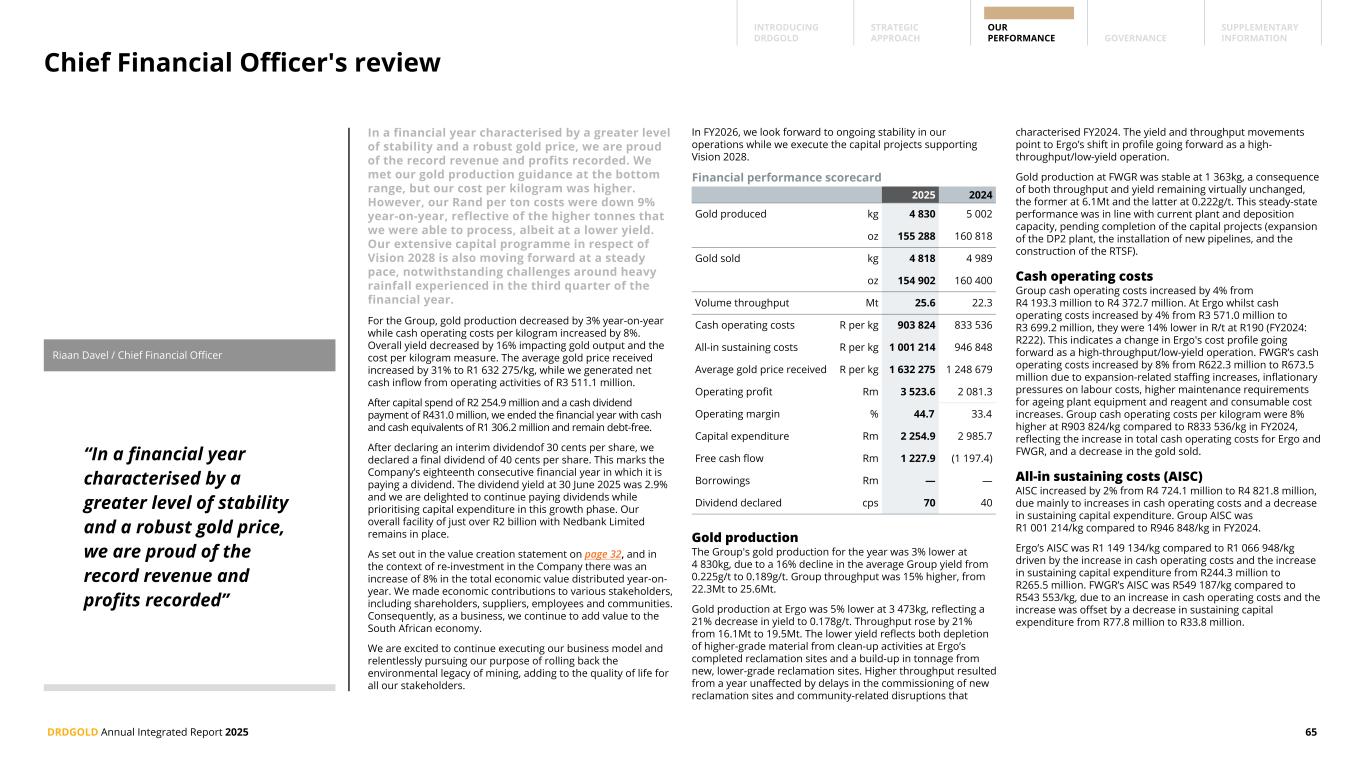 Riaan Davel / Chief Financial Officer “In a financial year characterised by a greater level of stability and a robust gold price, we are proud of the record revenue and profits recorded” In a financial year characterised by a greater level of stability and a robust gold price, we are proud of the record revenue and profits recorded. We met our gold production guidance at the bottom range, but our cost per kilogram was higher. However, our Rand per ton costs were down 9% year-on-year, reflective of the higher tonnes that we were able to process, albeit at a lower yield. Our extensive capital programme in respect of Vision 2028 is also moving forward at a steady pace, notwithstanding challenges around heavy rainfall experienced in the third quarter of the financial year. For the Group, gold production decreased by 3% year-on-year while cash operating costs per kilogram increased by 8%. Overall yield decreased by 16% impacting gold output and the cost per kilogram measure. The average gold price received increased by 31% to R1 632 275/kg, while we generated net cash inflow from operating activities of R3 511.1 million. After capital spend of R2 254.9 million and a cash dividend payment of R431.0 million, we ended the financial year with cash and cash equivalents of R1 306.2 million and remain debt-free. After declaring an interim dividendof 30 cents per share, we declared a final dividend of 40 cents per share. This marks the Company’s eighteenth consecutive financial year in which it is paying a dividend. The dividend yield at 30 June 2025 was 2.9% and we are delighted to continue paying dividends while prioritising capital expenditure in this growth phase. Our overall facility of just over R2 billion with Nedbank Limited remains in place. As set out in the value creation statement on page 32, and in the context of re-investment in the Company there was an increase of 8% in the total economic value distributed year-on- year. We made economic contributions to various stakeholders, including shareholders, suppliers, employees and communities. Consequently, as a business, we continue to add value to the South African economy. We are excited to continue executing our business model and relentlessly pursuing our purpose of rolling back the environmental legacy of mining, adding to the quality of life for all our stakeholders. In FY2026, we look forward to ongoing stability in our operations while we execute the capital projects supporting Vision 2028. Financial performance scorecard 2025 2024 Gold produced kg 4 830 5 002 oz 155 288 160 818 Gold sold kg 4 818 4 989 oz 154 902 160 400 Volume throughput Mt 25.6 22.3 Cash operating costs R per kg 903 824 833 536 All-in sustaining costs R per kg 1 001 214 946 848 Average gold price received R per kg 1 632 275 1 248 679 Operating profit Rm 3 523.6 2 081.3 Operating margin % 44.7 33.4 Capital expenditure Rm 2 254.9 2 985.7 Free cash flow Rm 1 227.9 (1 197.4) Borrowings Rm — — Dividend declared cps 70 40 Gold production The Group's gold production for the year was 3% lower at 4 830kg, due to a 16% decline in the average Group yield from 0.225g/t to 0.189g/t. Group throughput was 15% higher, from 22.3Mt to 25.6Mt. Gold production at Ergo was 5% lower at 3 473kg, reflecting a 21% decrease in yield to 0.178g/t. Throughput rose by 21% from 16.1Mt to 19.5Mt. The lower yield reflects both depletion of higher-grade material from clean-up activities at Ergo’s completed reclamation sites and a build-up in tonnage from new, lower-grade reclamation sites. Higher throughput resulted from a year unaffected by delays in the commissioning of new reclamation sites and community-related disruptions that characterised FY2024. The yield and throughput movements point to Ergo’s shift in profile going forward as a high- throughput/low-yield operation. Gold production at FWGR was stable at 1 363kg, a consequence of both throughput and yield remaining virtually unchanged, the former at 6.1Mt and the latter at 0.222g/t. This steady-state performance was in line with current plant and deposition capacity, pending completion of the capital projects (expansion of the DP2 plant, the installation of new pipelines, and the construction of the RTSF). Cash operating costs Group cash operating costs increased by 4% from R4 193.3 million to R4 372.7 million. At Ergo whilst cash operating costs increased by 4% from R3 571.0 million to R3 699.2 million, they were 14% lower in R/t at R190 (FY2024: R222). This indicates a change in Ergo's cost profile going forward as a high-throughput/low-yield operation. FWGR’s cash operating costs increased by 8% from R622.3 million to R673.5 million due to expansion-related staffing increases, inflationary pressures on labour costs, higher maintenance requirements for ageing plant equipment and reagent and consumable cost increases. Group cash operating costs per kilogram were 8% higher at R903 824/kg compared to R833 536/kg in FY2024, reflecting the increase in total cash operating costs for Ergo and FWGR, and a decrease in the gold sold. All-in sustaining costs (AISC) AISC increased by 2% from R4 724.1 million to R4 821.8 million, due mainly to increases in cash operating costs and a decrease in sustaining capital expenditure. Group AISC was R1 001 214/kg compared to R946 848/kg in FY2024. Ergo’s AISC was R1 149 134/kg compared to R1 066 948/kg driven by the increase in cash operating costs and the increase in sustaining capital expenditure from R244.3 million to R265.5 million. FWGR’s AISC was R549 187/kg compared to R543 553/kg, due to an increase in cash operating costs and the increase was offset by a decrease in sustaining capital expenditure from R77.8 million to R33.8 million. INTRODUCING DRDGOLD STRATEGIC APPROACH OUR PERFORMANCE GOVERNANCE SUPPLEMENTARY INFORMATION Chief Financial Officer's review DRDGOLD Annual Integrated Report 2025 65