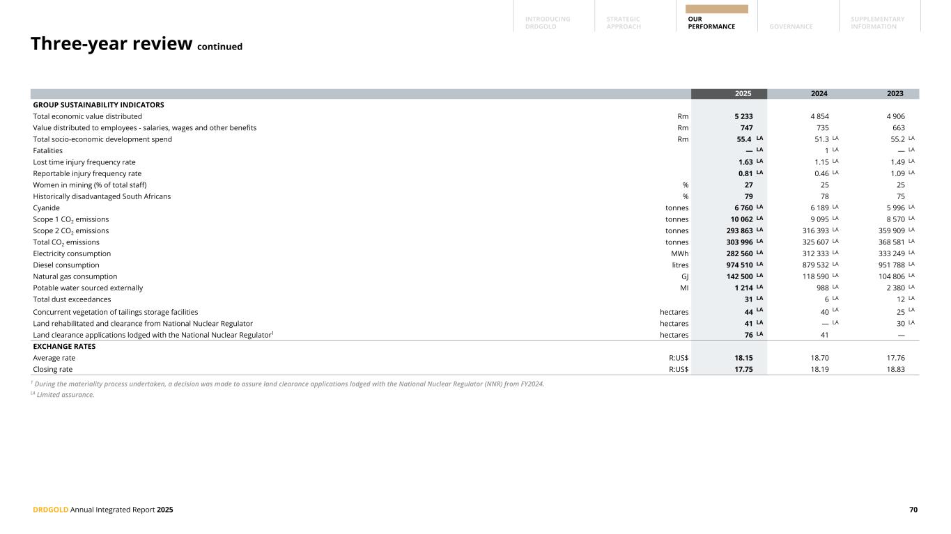 2025 2024 2023 GROUP SUSTAINABILITY INDICATORS Total economic value distributed Rm 5 233 4 854 4 906 Value distributed to employees - salaries, wages and other benefits Rm 747 735 663 Total socio-economic development spend Rm 55.4 LA 51.3 LA 55.2 LA Fatalities — LA 1 LA — LA Lost time injury frequency rate 1.63 LA 1.15 LA 1.49 LA Reportable injury frequency rate 0.81 LA 0.46 LA 1.09 LA Women in mining (% of total staff) % 27 25 25 Historically disadvantaged South Africans % 79 78 75 Cyanide tonnes 6 760 LA 6 189 LA 5 996 LA Scope 1 CO2 emissions tonnes 10 062 LA 9 095 LA 8 570 LA Scope 2 CO2 emissions tonnes 293 863 LA 316 393 LA 359 909 LA Total CO2 emissions tonnes 303 996 LA 325 607 LA 368 581 LA Electricity consumption MWh 282 560 LA 312 333 LA 333 249 LA Diesel consumption litres 974 510 LA 879 532 LA 951 788 LA Natural gas consumption GJ 142 500 LA 118 590 LA 104 806 LA Potable water sourced externally MI 1 214 LA 988 LA 2 380 LA Total dust exceedances 31 LA 6 LA 12 LA Concurrent vegetation of tailings storage facilities hectares 44 LA 40 LA 25 LA Land rehabilitated and clearance from National Nuclear Regulator hectares 41 LA — LA 30 LA Land clearance applications lodged with the National Nuclear Regulator1 hectares 76 LA 41 — EXCHANGE RATES Average rate R:US$ 18.15 18.70 17.76 Closing rate R:US$ 17.75 18.19 18.83 1 During the materiality process undertaken, a decision was made to assure land clearance applications lodged with the National Nuclear Regulator (NNR) from FY2024. LA Limited assurance. INTRODUCING DRDGOLD STRATEGIC APPROACH OUR PERFORMANCE GOVERNANCE SUPPLEMENTARY INFORMATION Three-year review continued DRDGOLD Annual Integrated Report 2025 70