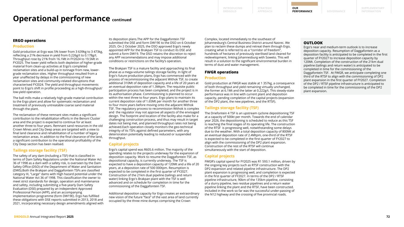 ERGO operations Production Gold production at Ergo was 5% lower from 3 639kg to 3 473kg, reflecting a 21% decrease in yield from 0.226g/t to 0.178g/t. Throughput rose by 21% from 16.1Mt in FY2024 to 19.5Mt in FY2025. The lower yield reflects both depletion of higher-grade material from clean-up activities at Ergo’s completed reclamation sites and a build-up in tonnage from new, lower- grade reclamation sites. Higher throughput resulted from a year unaffected by delays in the commissioning of new reclamation sites and community-related disruptions that characterised FY2024. The yield and throughput movements point to Ergo’s shift in profile proceeding as a high-throughput/ low-yield operation. The ball mills make a relatively high-grade material contribution to the Ergo plant and allow for systematic reclamation and treatment of previously untreatable coarse sand material through the plant. The reclamation of these remnant sites makes a significant contribution to the rehabilitation efforts in the Benoni Cluster area and the project is expected to continue for at least another three to four years. Remnant sand resources in the old Crown Mines and City Deep areas are targeted with a view to final land clearance and rehabilitation of a number of legacy reclamation areas. In addition to the final clearance of the land, a significant contribution to the operational profitability of the City Deep section has been realised. Tailings storage facility (TSF) The safety of any dam (including a TSF) that is classified in terms of Dam Safety Regulations under the National Water Act 36 of 1998 as a dam with a safety risk, is overseen by the Dam Safety Office (DSO) of the Department of Water and Sanitation (DWS).Both the Brakpan and Daggafontein TSFs are classified category III, "Large" dams with High hazard potential under the National Water Act 36 of 1998. This classification the owner to meet strict standards for design, operation and maintenance and safety, including submitting a five-yearly Dam Safety Evaluation (DSE) prepared by an independent Approved Professional Person (APP), and an accompanying implementation programme (form DW19E). Ergo has fulfilled these obligations with DSE reports submitted in 2013, 2018 and 2021, incorporating necessary design amendments aligned with its deposition plans.The APP for the Daggafontein TSF submitted the DSE and form DW19E to the DSO on 6 October 2025. On 2 October 2025, the DSO approved Ergo’s newly appointed APP for the Brakpan TSF to conduct its DSE and submit a form DW19. The DSO retains the discretion to reject any APP recommendations and may impose additional conditions or restrictions on the facility’s operation. The Brakpan TSF is a mature facility and approaching its final phase as a mega-volume tailings storage facility. In light of Ergo's future production plans, Ergo has commenced with the process of recommissioning the adjacent Withok TSF, to create additional 310Mt of deposition capacity and a life of 20 years at an eventual deposition rate of 1.3Mtpm. The requisite public participation process has been completed, and the project is in its authorisation phase. Commissioning is planned to occur within the next three to four years. Ergo plans to maintain its current deposition rate of 1.65Mt per month for another three to four more years before moving onto the adjacent Withok TSF. The regulatory process to recommission Withok is complex and the regulator may not approve all aspects of the envisaged design. The footprint and location of the facility also make for a challenging construction process, and thus may result in target dates not being met, and planned throughput rates not being achieved.Each operation closely monitors the geo-technical integrity of its TSFs against defined parameters, with any deterioration potentially leading to reduced or suspended throughput. Capital projects Ergo’s capital spend was R605.6 million. The majority of the spending relates to the projects underway for the expansion of deposition capacity. Work to resume the Daggafontein TSF, as depositional capacity, is currently underway. The TSF is expected to have a deposition capacity of 120Mt and a life of 20 years, at a deposition rate of 500 000tpm. Resumption is expected to be completed in the first quarter of FY2027. Construction of the 21km dual pipeline (tailings and return water) linking Ergo's Brakpan plant with the TSF is well advanced and on schedule for completion in time for the commissioning of the Daggafontein TSF. Additional deposition capacity for Ergo creates an extraordinary new vision of the future “face” of the vast area of land currently occupied by the three mine dumps comprising the Crown Complex, located immediately to the southeast of Johannesburg’s Central Business District around Nasrec. We plan to reclaim these dumps and retreat them through Ergo, creating what is referred to as a “corridor of freedom”, hundreds of hectares of previously sterilised land cleared for redevelopment, linking Johannesburg with Soweto. This will result in a solution to the significant environmental burden in terms of dust and water management. FWGR operations Production Gold production at FWGR was stable at 1 357kg, a consequence of both throughput and yield remaining virtually unchanged, the former at 6.1Mt and the latter at 0.222g/t. This steady-state performance was in line with current plant and deposition capacity, pending completion of the capital projects (expansion of the DP2 plant, the new pipelines, and the RTSF). Tailings storage facility (TSF) The Driefontein 4 TSF is an upstream cyclone depositioning TSF at a capacity of 500kt per month. Towards the end of calendar year 2026, the depositioning is scheduled to reduce as this TSF is reaching the final stages of its operating life. The construction of the RTSF is progressing well, notwithstanding some delays due to the weather. With a total deposition capacity of 800Mt at an eventua