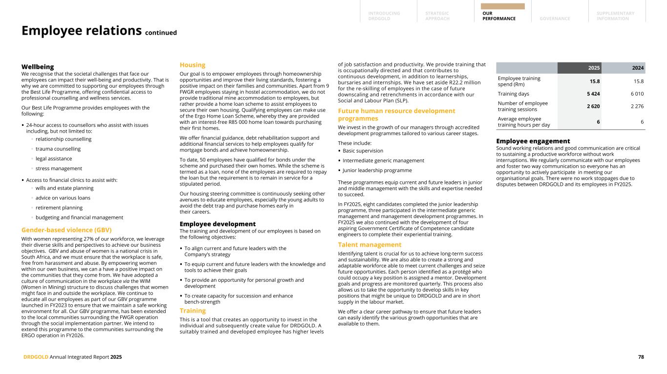 Wellbeing We recognise that the societal challenges that face our employees can impact their well-being and productivity. That is why we are committed to supporting our employees through the Best Life Programme, offering confidential access to professional counselling and wellness services. Our Best Life Programme provides employees with the following: • 24-hour access to counsellors who assist with issues including, but not limited to: • relationship counselling • trauma counselling • legal assistance • stress management • Access to financial clinics to assist with: • wills and estate planning • advice on various loans • retirement planning • budgeting and financial management Gender-based violence (GBV) With women representing 27% of our workforce, we leverage their diverse skills and perspectives to achieve our business objectives. GBV and abuse of women is a national crisis in South Africa, and we must ensure that the workplace is safe, free from harassment and abuse. By empowering women within our own business, we can a have a positive impact on the communities that they come from. We have adopted a culture of communication in the workplace via the WIM (Women in Mining) structure to discuss challenges that women might face in and outside the workplace. We continue to educate all our employees as part of our GBV programme launched in FY2023 to ensure that we maintain a safe working environment for all. Our GBV programme, has been extended to the local communities surrounding the FWGR operation through the social implementation partner. We intend to extend this programme to the communities surrounding the ERGO operation in FY2026. Housing Our goal is to empower employees through homeownership opportunities and improve their living standards, fostering a positive impact on their families and communities. Apart from 9 FWGR employees staying in hostel accommodation, we do not provide traditional mine accommodation to employees, but rather provide a home loan scheme to assist employees to secure their own housing. Qualifying employees can make use of the Ergo Home Loan Scheme, whereby they are provided with an interest-free R85 000 home loan towards purchasing their first homes. We offer financial guidance, debt rehabilitation support and additional financial services to help employees qualify for mortgage bonds and achieve homeownership. To date, 50 employees have qualified for bonds under the scheme and purchased their own homes. While the scheme is termed as a loan, none of the employees are required to repay the loan but the requirement is to remain in service for a stipulated period. Our housing steering committee is continuously seeking other avenues to educate employees, especially the young adults to avoid the debt trap and purchase homes early in their careers. Employee development The training and development of our employees is based on the following objectives: • To align current and future leaders with the Company’s strategy • To equip current and future leaders with the knowledge and tools to achieve their goals • To provide an opportunity for personal growth and development • To create capacity for succession and enhance bench-strength Training This is a tool that creates an opportunity to invest in the individual and subsequently create value for DRDGOLD. A suitably trained and developed employee has higher levels of job satisfaction and productivity. We provide training that is occupationally directed and that contributes to continuous development, in addition to learnerships, bursaries and internships. We have set aside R22.2 million for the re-skilling of employees in the case of future downscaling and retrenchments in accordance with our Social and Labour Plan (SLP). Future human resource development programmes We invest in the growth of our managers through accredited development programmes tailored to various career stages. These include: • Basic supervision • Intermediate generic management • Junior leadership programme These programmes equip current and future leaders in junior and middle management with the skills and expertise needed to succeed. In FY2025, eight candidates completed the junior leadership programme, three participated in the intermediate generic management and management development programmes. In FY2025 we also continued with the development of four aspiring Government Certificate of Competence candidate engineers to complete their experiential training. Talent management Identifying talent is crucial for us to achieve long-term success and sustainability. We are also able to create a strong and adaptable workforce able to meet current challenges and seize future opportunities. Each person identified as a protégé who could occupy a key position is assigned a mentor. Development goals and progress are monitored quarterly. This process also allows us to take the opportunity to develop skills in key positions that might be unique to DRDGOLD and are in short supply in the labour market. We offer a clear career pathway to ensure that future leaders can easily identify the various growth opportunities that are available to them. 2025 2024 Employee training spend (Rm) 15.8 15.8 Training days 5 424 6 010 Number of employee training sessions 2 620 2 276 Average employee training hours per day 6 6 Employee engagement Sound working relations and good communication are critical to sustaining a productive workforce without work interruptions. We regularly communicate with our employees and foster two way communication so everyone has an opportunity to actively participate in meeting our organisational goals. There were no work stoppages due to disputes between DRDGOLD and its employees in FY2025. INTRODUCING DRDGOLD STRATEGIC APPROACH OUR PERFORMANCE GOVERNANCE SUPPLEMENTARY INFORMATION Employee relations continued DRDGOLD Annual Integrated Report 2025 78