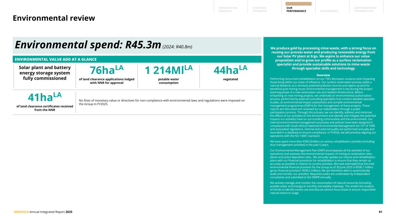 Environmental spend: R45.3m (2024: R40.8m) We produce gold by processing mine waste, with a strong focus on reusing our process water and producing renewable energy from our Solar PV plant at Ergo. We aspire to enhance our value proposition and to grow our profile as a surface reclamation specialist and provide sustainable solutions to mine waste through specialist skills and technology Overview Performing concurrent rehabilitation on our TSFs decreases nuisance dust impacting those living within our areas of influence. Our surface reclamation process yields a natural dividend, as it removes potential pollution sources and opens up land for beneficial post-mining reuse. Environmental management is key during the project planning phase of a new reclamation site and related infrastructure. Before embarking on new mining projects, we undertake an environmental authorisation process, performed by external consulting specialists that conduct detailed specialist studies, an environmental impact assessment and compile environmental management programmes (EMP's) for the management of these projects. These reports are discussed and reviewed by our stakeholders through a public participation process. Through this process, we can identify, address and minimise the effects of our activities on the environment and identify and mitigate the potential impacts our activities have on surrounding communities and the environment. Our internal environmental management processes and policies have been designed in compliance with South Africa’s National Environmental Management Act 107 of 1998 and associated regulations. Internal and external audits are performed annually and recorded in a database to ensure compliance. In FY2026, we will prioritise aligning our operations with the ISO 14001 standard. We have spent more than R395.0million on various rehabilitation activities (including dust management activities) in the past 5 years. Our Environmental Management Plan (EMP) encompasses all the activities of our operations and assesses the environmental impacts of mining at reclamation sites, plants and active deposition sites. We annually update our closure and rehabilitation plans with our financial provisions for rehabilitation to ensure that they remain as accurate as possible in relation to current activities. We have estimated that the total environmental financial provision for the Group as of 30 June 2025 is R558.7 million (gross financial provision: R930.2 million). We are therefore able to systematically audit and monitor our activities. Required audits are undertaken by independent consultants and submitted to the DMPR annually. We actively manage and monitor the consumption of natural resources (including potable water and energy) at monthly and weekly meetings. This entails the analysis of trends to identify excess use and discuss various focus areas to ensure responsible natural resource usage. ENVIRONMENTAL VALUE ADD AT A GLANCE Solar plant and battery energy storage system fully commissioned 76haLA 1 214MlLA 44haLA of land clearance applications lodged with NNR for approval potable water consumption vegetated 41haLA No fines of monetary value or directives for non-compliance with environmental laws and regulations were imposed on the Group in FY2025. of land clearance certificates received from the NNR INTRODUCING DRDGOLD STRATEGIC APPROACH OUR PERFORMANCE GOVERNANCE SUPPLEMENTARY INFORMATION Environmental review DRDGOLD Annual Integrated Report 2025 81
