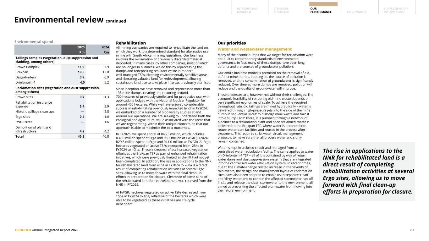 Environmental spend 2025 2024 Rm Rm Tailings complex (vegetation, dust suppression and cladding, among others) Crown Complex 11.9 7.9 Brakpan 19.8 12.0 Daggafontein 0.9 0.9 Driefontein 4 4.0 5.2 Reclamation sites (vegetation and dust suppression, among others) Crown sites 0.7 1.3 Rehabilitation insurance expense 3.4 3.9 Historic spillage clean ups — 2.8 Ergo sites 0.4 1.0 FWGR sites — 1.6 Demolition of plant and infrastructure 4.2 4.2 Total 45.3 40.8 Rehabilitation All mining companies are required to rehabilitate the land on which they work to a determined standard for alternative use in line with South African mining legislation. Our business involves the reclamation of previously discarded material deposited, in many cases, by other companies, most of which are no longer in business. We do this by reprocessing the dumps and redepositing resultant waste in modern, well-managed TSFs, cleaning environmentally sensitive areas and liberating valuable land for redevelopment, allowing sustainable land use to take place in areas previously sterilised. Since inception, we have removed and reprocessed more than 138 mine dumps, clearing and restoring around 700 hectares of previously sterile land for productive use, with applications lodged with the National Nuclear Regulator for around 400 hectares. While we have enjoyed considerable success in rehabilitating previously impacted land, in FY2024, we embarked on a number of biodiversity studies at and around our operations. We are seeking to understand both the ecological and agricultural value associated with the areas that we are regenerating, within their unique contexts, so that our approach is able to maximise the best outcomes. In FY2025, we spent a total of R45.3 million, which includes R37.0 million spent at Ergo and R8.3 million at FWGR (FY2024: R29.8 million spent at Ergo and R11.0 million at FWGR). At Ergo, hectares vegetated on active TSFs increased from 25ha in FY2024 to 40ha. These increases reflect increased vegetation efforts at the Brakpan TSF as part of enhanced rehabilitation initiatives, which were previously limited as the lift had not yet been completed. In addition, the rise in applications to the NNR for rehabilitated land from 41ha in FY2024 to 76ha is a direct result of completing rehabilitation activities at several Ergo sites, allowing us to move forward with the final clean-up efforts in preparation for closure. Clearance of some 41ha of the rehabilitated land for redevelopment was received from the NNR in FY2025. At FWGR, hectares vegetated on active TSFs decreased from 15ha in FY2024 to 4ha, reflective of the hectares which were able to be vegetated as these initiatives are life-cycle dependent. Our priorities Water and wastewater management Many of the historic dumps that we target for reclamation were not built to contemporary standards of environmental governance. In fact, many of these dumps have been long defunct and are sources of groundwater pollution. Our entire business model is premised on the removal of old, defunct mine dumps. In doing so, the source of pollution is removed, and the contamination of groundwater is significantly reduced. Over time as more dumps are removed, pollution will reduce and the quality of groundwater will improve. These processes are, however not without their challenges. The economic feasibility of retreating old mine waste depends on very significant economies of scale. To achieve the required throughput rate, old tailings are mined hydraulically – water is delivered through high-pressure jets into the side of the mine dump in sequential ‘slices’ to dislodge mine waste and turn it into a slurry. From there, it is pumped through a network of pipelines to a reclamation plant and once reclaimed, waste is delivered to the Brakpan TSF, where water is decanted into return water dam facilities and reused in the process after treatment. This requires strict water circuit management protocols to make sure that all process water and slurry remain contained. Water is kept in a closed circuit and managed from a centralised water reticulation facility. The same applies to water on Driefontein 4 TSF – all of it is contained by way of return water dams and dust suppression systems that are integrated into the centralised water reticulation system. In recent times, due to the climate-change related increase in the severity of rain events, the design and management layout of reclamation sites have also been adapted to enable us to separate ‘clean’ and ‘dirty’ water and to contain the affected stormwater run-off in situ and release the clean stormwater to the environment, all aimed at preventing the affected stormwater from flowing into the natural environment. The rise in applications to the NNR for rehabilitated land is a direct result of completing rehabilitation activities at several Ergo sites, allowing us to move forward with final clean-up efforts in preparation for closure. INTRODUCING DRDGOLD STRATEGIC APPROACH OUR PERFORMANCE GOVERNANCE SUPPLEMENTARY INFORMATION Environmental review continued DRDGOLD Annual Integrated Report 2025 82