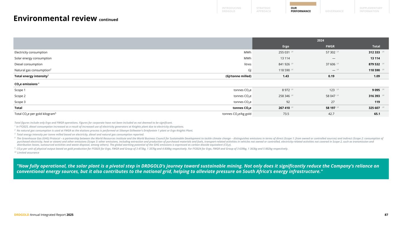 overall business and its ESG approach and achievements in particular. The DMPR has recognised the work that we do in respect of dust containment around Johannesburg and pollution remediation of the Russell Stream, a water course traversing several communities west and south west of Johannesburg’s CBD. Total dust exceedances 2025 2024 Total samples for the year 1 473 LA 1 326 LA Total dust exceedances 31 LA 6 LA Percentage % 2.10 0.45 LA Limited assurance Energy consumption As Eskom generates electricity primarily from coal-fired power stations, our indirect emissions are significant, although, as with our use of materials, we strive continuously to reduce consumption. Our electricity consumption from Eskom and municipalities fell by 10% from 312 333Mwh in FY2024 to 282 560Mwh, reflecting the positive impact of our solar photovoltaic (PV) plant and BESS at Ergo. Ergo’s Solar PV plant and BESS (60MW solar PV plant and 160MWh BESS), commissioned in November 2024, was functioning at 97% of designed capacity at year-end and now largely meets the daytime power needs of the operation’s reclamation sites, plant and the Brakpan TSF. The cost saving was approximately R108 million at year-end, which is significant, given that electricity is Ergo’s fourth-largest operating cost item after labour, contractors and reagents. Surplus electricity delivered into the grid of power utility Eskom at year-end was 41 791 804kWh. Credits for this ‘wheeling’ of surplus power to Eskom were finally realised in October 2025 offsetting the power other sections of the Ergo operation currently draw from the Eskom grid, further reducing the cost of electricity. Our carbon footprint has been reduced by the solar PV plant; an application for carbon credits has been made and we expect to be able to also report on the positive impact on our carbon footprint in due course. Greenhouse gas (GHG) emissions Our scope 1 carbon emissions relate mostly to the consumption of diesel by machinery and equipment, as well as the combustion of natural gas during our elution process. Indirect emissions are a result of the use of Eskom power (Scope 2 carbon emissions). We base travel emissions (Scope 3 carbon emissions) on reported kilometres claimed by our employees during the financial year. In the current year, we engaged an external consultant to conduct a comprehensive energy and carbon footprint assessment across all our operations. The purpose of this exercise was to verify the completeness and accuracy of our Scope 1 and Scope 2 emissions reporting as well as revisiting the basis of reporting for our Scope 3 emissions to ensure greater relevance and alignment with our value chain activities. This process not only strengthens the credibility and transparency of our disclosures but also provides deeper insights into our carbon footprint, enabling us to identify opportunities for efficiency improvements, emission reductions, and long-term decarbonisation planning. The outcomes of this assessment will be presented in our next report. The pie chart indicates how dominant electricity use continues to be in our overall emission profile. During the financial year, an external independent expert performed an assessment of our GHG emissions for the 2024 calendar year. The assessment was conducted on those GHG emissions that result from diesel use by on-site vehicles or stationary industrial equipment and natural gas consumed through two Sasol pipelines to the Ergo plant. The assessment was conducted in accordance with the following: • The National GHG Emission Reporting Regulations (the regulations) • The Methodological Guidelines for Quantification of GHG Emissions (Methodological Guidelines) The Scope 1 GHG emissions for the 2024 calendar year were determined to be 7 189 tCO2e (2023: 5 975 tCO2e) which attracted a carbon tax of R390 640 (2023: R294 402). FWGR is currently below the capacity threshold and thus does not pay carbon tax. Our carbon footprint has been reduced by the solar PV plant, an application for carbon credits has been made and we expect to be able to also report on the positive impact on our carbon footprint in due course. Refer to page 62 for the Climate change and renewable energy section for more information. Emissions by scope 3% 97% 0% Scope 1 Scope 2 Scope 3 CO2e by power source 96% 3% 1% 0% Electricity Gas Diesel Petrol INTRODUCING DRDGOLD STRATEGIC APPROACH OUR PERFORMANCE GOVERNANCE SUPPLEMENTARY INFORMATION Environmental review continued DRDGOLD Annual Integrated Report 2025 85 CO2e by po rce