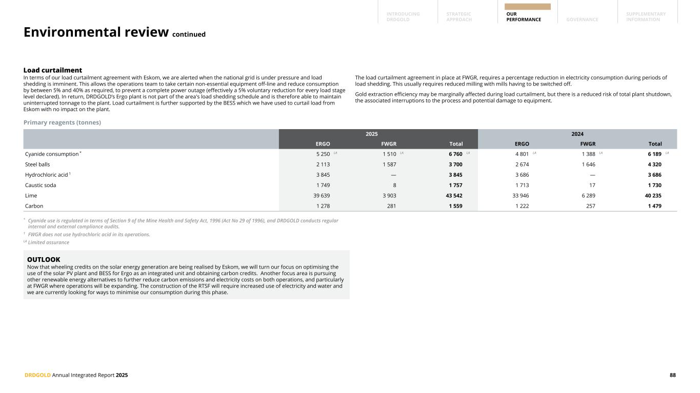 Load curtailment In terms of our load curtailment agreement with Eskom, we are alerted when the national grid is under pressure and load shedding is imminent. This allows the operations team to take certain non-essential equipment off-line and reduce consumption by between 5% and 40% as required, to prevent a complete power outage (effectively a 5% voluntary reduction for every load stage level declared). In return, DRDGOLD’s Ergo plant is not part of the area's load shedding schedule and is therefore able to maintain uninterrupted tonnage to the plant. Load curtailment is further supported by the BESS which we have used to curtail load from Eskom with no impact on the plant. The load curtailment agreement in place at FWGR, requires a percentage reduction in electricity consumption during periods of load shedding. This usually requires reduced milling with mills having to be switched off. Gold extraction efficiency may be marginally affected during load curtailment, but there is a reduced risk of total plant shutdown, the associated interruptions to the process and potential damage to equipment. Primary reagents (tonnes) 2025 2024 ERGO FWGR Total ERGO FWGR Total Cyanide consumption * 5 250 LA 1 510 LA 6 760 LA 4 801 LA 1 388 LA 6 189 LA Steel balls 2 113 1 587 3 700 2 674 1 646 4 320 Hydrochloric acid 1 3 845 — 3 845 3 686 — 3 686 Caustic soda 1 749 8 1 757 1 713 17 1 730 Lime 39 639 3 903 43 542 33 946 6 289 40 235 Carbon 1 278 281 1 559 1 222 257 1 479 * Cyanide use is regulated in terms of Section 9 of the Mine Health and Safety Act, 1996 (Act No 29 of 1996), and DRDGOLD conducts regular internal and external compliance audits. 1 FWGR does not use hydrochloric acid in its operations. LA Limited assurance OUTLOOK Now that wheeling credits on the solar energy generation are being realised by Eskom, we will turn our focus on optimising the use of the solar PV plant and BESS for Ergo as an integrated unit and obtaining carbon credits. Another focus area is pursuing other renewable energy alternatives to further reduce carbon emissions and electricity costs on both operations, and particularly at FWGR where operations will be expanding. The construction of the RTSF will require increased use of electricity and water and we are currently looking for ways to minimise our consumption during this phase. INTRODUCING DRDGOLD STRATEGIC APPROACH OUR PERFORMANCE GOVERNANCE SUPPLEMENTARY INFORMATION Environmental review continued DRDGOLD Annual Integrated Report 2025 88