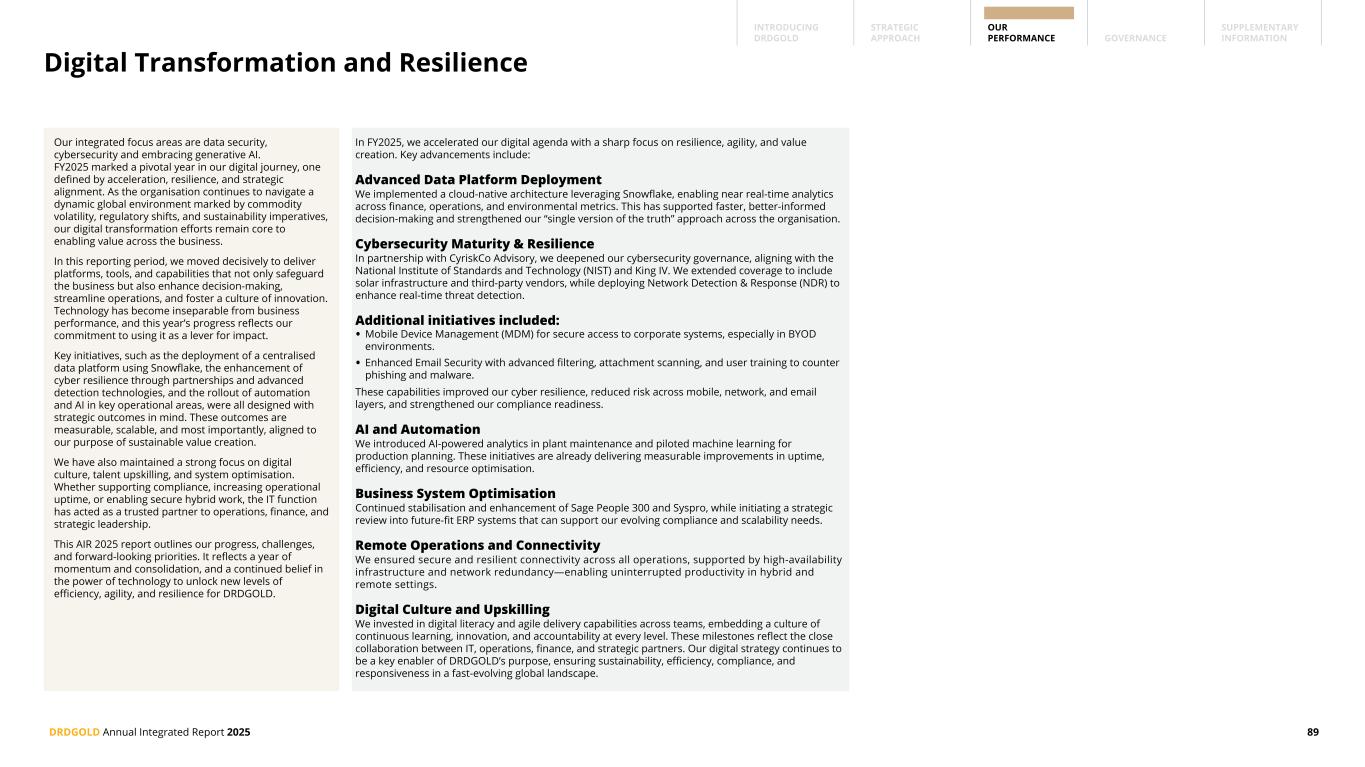 Our integrated focus areas are data security, cybersecurity and embracing generative AI. FY2025 marked a pivotal year in our digital journey, one defined by acceleration, resilience, and strategic alignment. As the organisation continues to navigate a dynamic global environment marked by commodity volatility, regulatory shifts, and sustainability imperatives, our digital transformation efforts remain core to enabling value across the business. In this reporting period, we moved decisively to deliver platforms, tools, and capabilities that not only safeguard the business but also enhance decision-making, streamline operations, and foster a culture of innovation. Technology has become inseparable from business performance, and this year’s progress reflects our commitment to using it as a lever for impact. Key initiatives, such as the deployment of a centralised data platform using Snowflake, the enhancement of cyber resilience through partnerships and advanced detection technologies, and the rollout of automation and AI in key operational areas, were all designed with strategic outcomes in mind. These outcomes are measurable, scalable, and most importantly, aligned to our purpose of sustainable value creation. We have also maintained a strong focus on digital culture, talent upskilling, and system optimisation. Whether supporting compliance, increasing operational uptime, or enabling secure hybrid work, the IT function has acted as a trusted partner to operations, finance, and strategic leadership. This AIR 2025 report outlines our progress, challenges, and forward-looking priorities. It reflects a year of momentum and consolidation, and a continued belief in the power of technology to unlock new levels of efficiency, agility, and resilience for DRDGOLD. In FY2025, we accelerated our digital agenda with a sharp focus on resilience, agility, and value creation. Key advancements include: Advanced Data Platform Deployment We implemented a cloud-native architecture leveraging Snowflake, enabling near real-time analytics across finance, operations, and environmental metrics. This has supported faster, better-informed decision-making and strengthened our “single version of the truth” approach across the organisation. Cybersecurity Maturity & Resilience In partnership with CyriskCo Advisory, we deepened our cybersecurity governance, aligning with the National Institute of Standards and Technology (NIST) and King IV. We extended coverage to include solar infrastructure and third-party vendors, while deploying Network Detection & Response (NDR) to enhance real-time threat detection. Additional initiatives included: • Mobile Device Management (MDM) for secure access to corporate systems, especially in BYOD environments. • Enhanced Email Security with advanced filtering, attachment scanning, and user training to counter phishing and malware. These capabilities improved our cyber resilience, reduced risk across mobile, network, and email layers, and strengthened our compliance readiness. AI and Automation We introduced AI-powered analytics in plant maintenance and piloted machine learning for production planning. These initiatives are already delivering measurable improvements in uptime, efficiency, and resource optimisation. Business System Optimisation Continued stabilisation and enhancement of Sage People 300 and Syspro, while initiating a strategic review into future-fit ERP systems that can support our evolving compliance and scalability needs. Remote Operations and Connectivity We ensured secure and resilient connectivity across all operations, supported by high-availability infrastructure and network redundancy—enabling uninterrupted productivity in hybrid and remote settings. Digital Culture and Upskilling We invested in digital literacy and agile delivery capabilities across teams, embedding a culture of continuous learning, innovation, and accountability at every level. These milestones reflect the close collaboration between IT, operations, finance, and strategic partners. Our digital strategy continues to be a key enabler of DRDGOLD’s purpose, ensuring sustainability, efficiency, compliance, and responsiveness in a fast-evolving global landscape. INTRODUCING DRDGOLD STRATEGIC APPROACH OUR PERFORMANCE GOVERNANCE SUPPLEMENTARY INFORMATION Digital Transformation and Resilience DRDGOLD Annual Integrated Report 2025 89