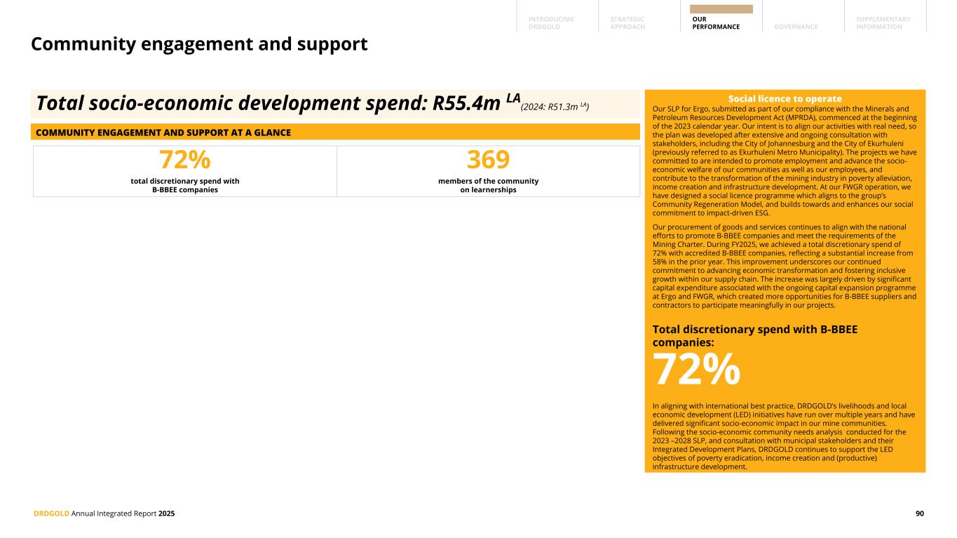 Total socio-economic development spend: R55.4m LA (2024: R51.3m LA) Social licence to operate Our SLP for Ergo, submitted as part of our compliance with the Minerals and Petroleum Resources Development Act (MPRDA), commenced at the beginning of the 2023 calendar year. Our intent is to align our activities with real need, so the plan was developed after extensive and ongoing consultation with stakeholders, including the City of Johannesburg and the City of Ekurhuleni (previously referred to as Ekurhuleni Metro Municipality). The projects we have committed to are intended to promote employment and advance the socio- economic welfare of our communities as well as our employees, and contribute to the transformation of the mining industry in poverty alleviation, income creation and infrastructure development. At our FWGR operation, we have designed a social licence programme which aligns to the group’s Community Regeneration Model, and builds towards and enhances our social commitment to impact-driven ESG. Our procurement of goods and services continues to align with the national efforts to promote B-BBEE companies and meet the requirements of the Mining Charter. During FY2025, we achieved a total discretionary spend of 72% with accredited B-BBEE companies, reflecting a substantial increase from 58% in the prior year. This improvement underscores our continued commitment to advancing economic transformation and fostering inclusive growth within our supply chain. The increase was largely driven by significant capital expenditure associated with the ongoing capital expansion programme at Ergo and FWGR, which created more opportunities for B-BBEE suppliers and contractors to participate meaningfully in our projects. Total discretionary spend with B-BBEE companies: 72% In aligning with international best practice, DRDGOLD’s livelihoods and local economic development (LED) initiatives have run over multiple years and have delivered significant socio-economic impact in our mine communities. Following the socio-economic community needs analysis conducted for the 2023 –2028 SLP, and consultation with municipal stakeholders and their Integrated Development Plans, DRDGOLD continues to support the LED objectives of poverty eradication, income creation and (productive) infrastructure development. COMMUNITY ENGAGEMENT AND SUPPORT AT A GLANCE 72% 369 total discretionary spend with B-BBEE companies members of the community on learnerships INTRODUCING DRDGOLD STRATEGIC APPROACH OUR PERFORMANCE GOVERNANCE SUPPLEMENTARY INFORMATION Community engagement and support DRDGOLD Annual Integrated Report 2025 90