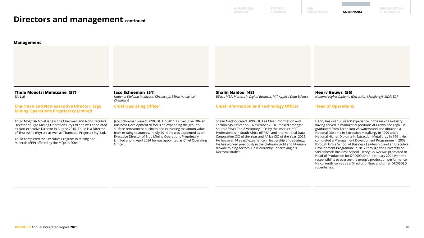 Management Thulo Mogotsi Moletsane (57) Jaco Schoeman (51) BA, LLB National Diploma (Analytical Chemistry), BTech (Analytical Chemistry) Chairman and Non-executive Director: Ergo Mining Operations Proprietary Limited Chief Operating Officer Thulo Mogotsi- Moletsane is the Chairman and Non-Executive Director of Ergo Mining Operations Pty Ltd and was appointed as Non-executive Director in August 2010. Thulo is a Director of Thureskho (Pty) Ltd as well as Thumadui Projects ( Pty) Ltd. Thulo completed the Executive Program in Mining and Minerals (EPP) offered by the MQA in 2004. Jaco Schoeman joined DRDGOLD in 2011 as Executive Officer: Business Development to focus on expanding the group’s surface retreatment business and extracting maximum value from existing resources. In July 2014, he was appointed as an Executive Director of Ergo Mining Operations Proprietary Limited and in April 2024 he was appointed as Chief Operating Officer. Shalin Naidoo (48) Henry Gouws (56) BTech, MBA, Masters in Digital Business, MIT Applied Data Science National Higher Diploma (Extraction Metallurgy), MDP. EDP Chief Information and Technology Officer Head of Operations Shalin Naidoo joined DRDGOLD as Chief Information and Technology Officer on 2 November 2020. Ranked amongst South Africa’s Top 8 Visionary CIOs by the institute of IT Professionals in South Africa (IITPSA) and International Data Corporation CIO of the Year and Africa CIO of the Year, 2025. He has over 14 years’ experience in leadership and strategy. He has worked previously in the platinum, gold and titanium dioxide mining sectors. He is currently undertaking his Doctoral studies. Henry has over 36 years’ experience in the mining industry having served in managerial positions at Crown and Ergo. He graduated from Technikon Witwatersrand and obtained a National Diploma in Extraction Metallurgy in 1990 and a National Higher Diploma in Extraction Metallurgy in 1991. He completed a Management Development Programme in 2003 through Unisa School of Business Leadership and an Executive Development Programme in 2012 through the University of Stellenbosch Business School. Henry Gouws was promoted to Head of Production for DRDGOLD on 1 January 2024 with the responsibility to oversee the group’s production performance. He currently serves as a Director of Ergo and other DRDGOLD subsidiaries. INTRODUCING DRDGOLD STRATEGIC APPROACH OUR PERFORMANCE GOVERNANCE SUPPLEMENTARY INFORMATION Directors and management continued DRDGOLD Annual Integrated Report 2025 98