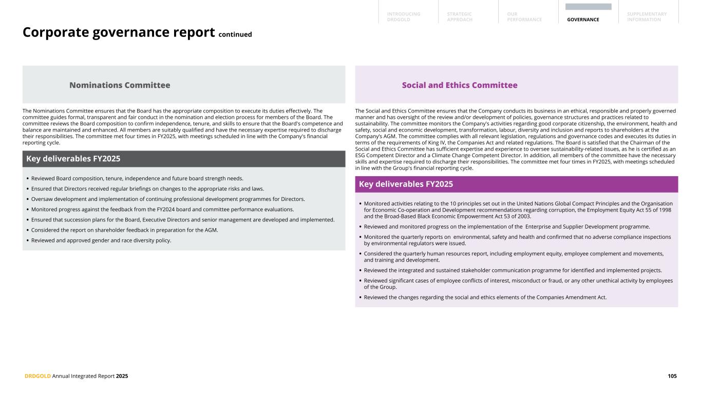 Nominations Committee The Nominations Committee ensures that the Board has the appropriate composition to execute its duties effectively. The committee guides formal, transparent and fair conduct in the nomination and election process for members of the Board. The committee reviews the Board composition to confirm independence, tenure, and skills to ensure that the Board's competence and balance are maintained and enhanced. All members are suitably qualified and have the necessary expertise required to discharge their responsibilities. The committee met four times in FY2025, with meetings scheduled in line with the Company's financial reporting cycle. Key deliverables FY2025 • Reviewed Board composition, tenure, independence and future board strength needs. • Ensured that Directors received regular briefings on changes to the appropriate risks and laws. • Oversaw development and implementation of continuing professional development programmes for Directors. • Monitored progress against the feedback from the FY2024 board and committee performance evaluations. • Ensured that succession plans for the Board, Executive Directors and senior management are developed and implemented. • Considered the report on shareholder feedback in preparation for the AGM. • Reviewed and approved gender and race diversity policy. Social and Ethics Committee The Social and Ethics Committee ensures that the Company conducts its business in an ethical, responsible and properly governed manner and has oversight of the review and/or development of policies, governance structures and practices related to sustainability. The committee monitors the Company's activities regarding good corporate citizenship, the environment, health and safety, social and economic development, transformation, labour, diversity and inclusion and reports to shareholders at the Company’s AGM. The committee complies with all relevant legislation, regulations and governance codes and executes its duties in terms of the requirements of King IV, the Companies Act and related regulations. The Board is satisfied that the Chairman of the Social and Ethics Committee has sufficient expertise and experience to oversee sustainability-related issues, as he is certified as an ESG Competent Director and a Climate Change Competent Director. In addition, all members of the committee have the necessary skills and expertise required to discharge their responsibilities. The committee met four times in FY2025, with meetings scheduled in line with the Group's financial reporting cycle. Key deliverables FY2025 • Monitored activities relating to the 10 principles set out in the United Nations Global Compact Principles and the Organisation for Economic Co-operation and Development recommendations regarding corruption, the Employment Equity Act 55 of 1998 and the Broad-Based Black Economic Empowerment Act 53 of 2003. • Reviewed and monitored progress on the implementation of the Enterprise and Supplier Development programme. • Monitored the quarterly reports on environmental, safety and health and confirmed that no adverse compliance inspections by environmental regulators were issued. • Considered the quarterly human resources report, including employment equity, employee complement and movements, and training and development. • Reviewed the integrated and sustained stakeholder communication programme for identified and implemented projects. • Reviewed significant cases of employee conflicts of interest, misconduct or fraud, or any other unethical activity by employees of the Group. • Reviewed the changes regarding the social and ethics elements of the Companies Amendment Act. INTRODUCING DRDGOLD STRATEGIC APPROACH OUR PERFORMANCE GOVERNANCE SUPPLEMENTARY INFORMATION Corporate governance report continued DRDGOLD Annual Integrated Report 2025 105