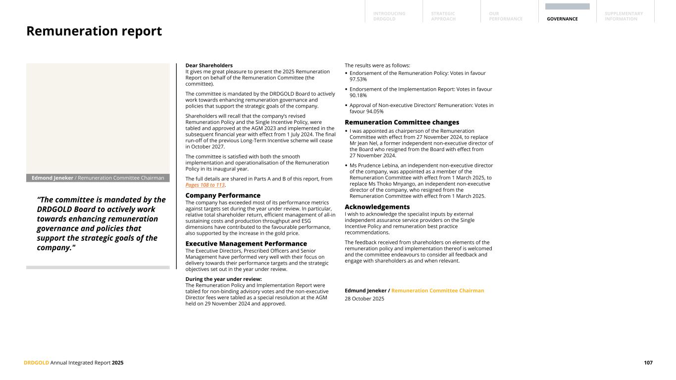 Edmond Jeneker / Remuneration Committee Chairman “The committee is mandated by the DRDGOLD Board to actively work towards enhancing remuneration governance and policies that support the strategic goals of the company." Dear Shareholders It gives me great pleasure to present the 2025 Remuneration Report on behalf of the Remuneration Committee (the committee). The committee is mandated by the DRDGOLD Board to actively work towards enhancing remuneration governance and policies that support the strategic goals of the company. Shareholders will recall that the company’s revised Remuneration Policy and the Single Incentive Policy, were tabled and approved at the AGM 2023 and implemented in the subsequent financial year with effect from 1 July 2024. The final run-off of the previous Long-Term Incentive scheme will cease in October 2027. The committee is satisfied with both the smooth implementation and operationalisation of the Remuneration Policy in its inaugural year. The full details are shared in Parts A and B of this report, from Pages 108 to 113. Company Performance The company has exceeded most of its performance metrics against targets set during the year under review. In particular, relative total shareholder return, efficient management of all-in sustaining costs and production throughput and ESG dimensions have contributed to the favourable performance, also supported by the increase in the gold price. Executive Management Performance The Executive Directors, Prescribed Officers and Senior Management have performed very well with their focus on delivery towards their performance targets and the strategic objectives set out in the year under review. During the year under review: The Remuneration Policy and Implementation Report were tabled for non-binding advisory votes and the non-executive Director fees were tabled as a special resolution at the AGM held on 29 November 2024 and approved. The results were as follows: • Endorsement of the Remuneration Policy: Votes in favour 97.53% • Endorsement of the Implementation Report: Votes in favour 90.18% • Approval of Non-executive Directors’ Remuneration: Votes in favour 94.05% Remuneration Committee changes • I was appointed as chairperson of the Remuneration Committee with effect from 27 November 2024, to replace Mr Jean Nel, a former independent non-executive director of the Board who resigned from the Board with effect from 27 November 2024. • Ms Prudence Lebina, an independent non-executive director of the company, was appointed as a member of the Remuneration Committee with effect from 1 March 2025, to replace Ms Thoko Mnyango, an independent non-executive director of the company, who resigned from the Remuneration Committee with effect from 1 March 2025. Acknowledgements I wish to acknowledge the specialist inputs by external independent assurance service providers on the Single Incentive Policy and remuneration best practice recommendations. The feedback received from shareholders on elements of the remuneration policy and implementation thereof is welcomed and the committee endeavours to consider all feedback and engage with shareholders as and when relevant. Edmund Jeneker / Remuneration Committee Chairman 28 October 2025 INTRODUCING DRDGOLD STRATEGIC APPROACH OUR PERFORMANCE GOVERNANCE SUPPLEMENTARY INFORMATION Remuneration report DRDGOLD Annual Integrated Report 2025 107