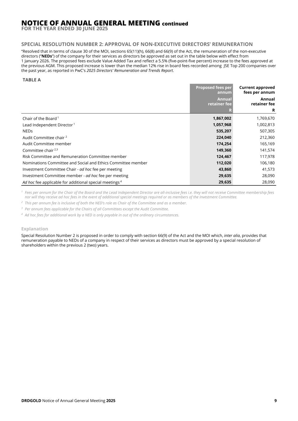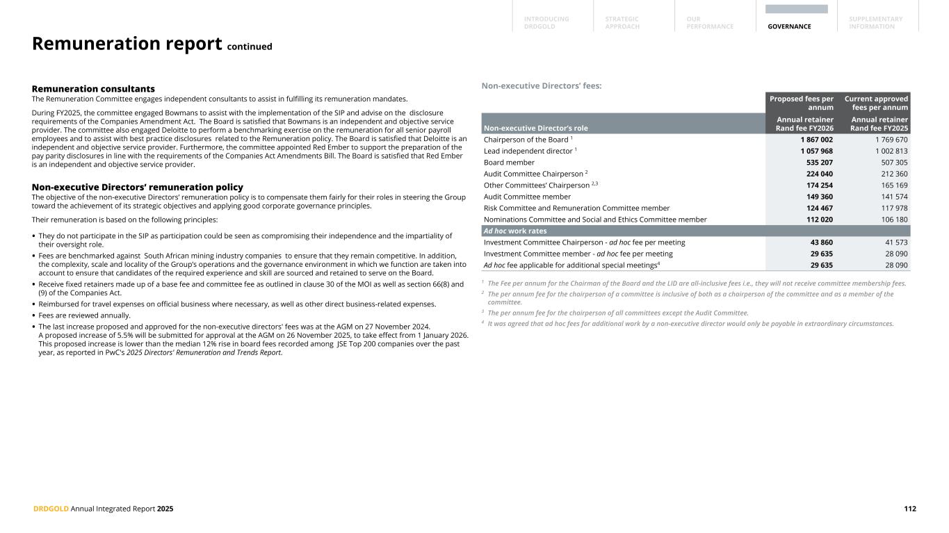 Remuneration consultants The Remuneration Committee engages independent consultants to assist in fulfilling its remuneration mandates. During FY2025, the committee engaged Bowmans to assist with the implementation of the SIP and advise on the disclosure requirements of the Companies Amendment Act. The Board is satisfied that Bowmans is an independent and objective service provider. The committee also engaged Deloitte to perform a benchmarking exercise on the remuneration for all senior payroll employees and to assist with best practice disclosures related to the Remuneration policy. The Board is satisfied that Deloitte is an independent and objective service provider. Furthermore, the committee appointed Red Ember to support the preparation of the pay parity disclosures in line with the requirements of the Companies Act Amendments Bill. The Board is satisfied that Red Ember is an independent and objective service provider. Non-executive Directors’ remuneration policy The objective of the non-executive Directors’ remuneration policy is to compensate them fairly for their roles in steering the Group toward the achievement of its strategic objectives and applying good corporate governance principles. Their remuneration is based on the following principles: • They do not participate in the SIP as participation could be seen as compromising their independence and the impartiality of their oversight role. • Fees are benchmarked against South African mining industry companies to ensure that they remain competitive. In addition, the complexity, scale and locality of the Group’s operations and the governance environment in which we function are taken into account to ensure that candidates of the required experience and skill are sourced and retained to serve on the Board. • Receive fixed retainers made up of a base fee and committee fee as outlined in clause 30 of the MOI as well as section 66(8) and (9) of the Companies Act. • Reimbursed for travel expenses on official business where necessary, as well as other direct business-related expenses. • Fees are reviewed annually. • The last increase proposed and approved for the non-executive directors' fees was at the AGM on 27 November 2024. A proposed increase of 5.5% will be submitted for approval at the AGM on 26 November 2025, to take effect from 1 January 2026. This proposed increase is lower than the median 12% rise in board fees recorded among JSE Top 200 companies over the past year, as reported in PwC's 2025 Directors' Remuneration and Trends Report. Non-executive Directors’ fees: Proposed fees per annum Current approved fees per annum Non-executive Director’s role Annual retainer Rand fee FY2026 Annual retainer Rand fee FY2025 Chairperson of the Board 1 1 867 002 1 769 670 Lead independent director 1 1 057 968 1 002 813 Board member 535 207 507 305 Audit Committee Chairperson 2 224 040 212 360 Other Committees’ Chairperson 2,3 174 254 165 169 Audit Committee member 149 360 141 574 Risk Committee and Remuneration Committee member 124 467 117 978 Nominations Committee and Social and Ethics Committee member 112 020 106 180 Ad hoc work rates Investment Committee Chairperson - ad hoc fee per meeting 43 860 41 573 Investment Committee member - ad hoc fee per meeting 29 635 28 090 Ad hoc fee applicable for additional special meetings4 29 635 28 090 1 The Fee per annum for the Chairman of the Board and the LID are all-inclusive fees i.e., they will not receive committee membership fees. 2 The per annum fee for the chairperson of a committee is inclusive of both as a chairperson of the committee and as a member of the committee. 3 The per annum fee for the chairperson of all committees except the Audit Committee. 4 It was agreed that ad hoc fees for additional work by a non-executive director would only be payable in extraordinary circumstances. INTRODUCING DRDGOLD STRATEGIC APPROACH OUR PERFORMANCE GOVERNANCE SUPPLEMENTARY INFORMATION Remuneration report continued DRDGOLD Annual Integrated Report 2025 112