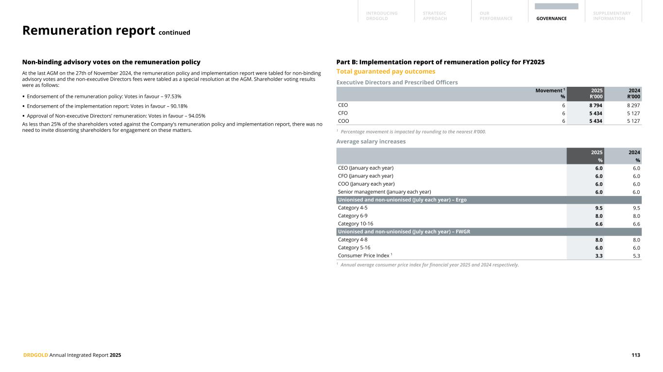 Non-binding advisory votes on the remuneration policy At the last AGM on the 27th of November 2024, the remuneration policy and implementation report were tabled for non-binding advisory votes and the non-executive Directors fees were tabled as a special resolution at the AGM. Shareholder voting results were as follows: • Endorsement of the remuneration policy: Votes in favour – 97.53% • Endorsement of the implementation report: Votes in favour – 90.18% • Approval of Non-executive Directors’ remuneration: Votes in favour – 94.05% As less than 25% of the shareholders voted against the Company's remuneration policy and implementation report, there was no need to invite dissenting shareholders for engagement on these matters. Part B: Implementation report of remuneration policy for FY2025 Total guaranteed pay outcomes Executive Directors and Prescribed Officers Movement 1 % 2025 R’000 2024 R’000 CEO 6 8 794 8 297 CFO 6 5 434 5 127 COO 6 5 434 5 127 1 Percentage movement is impacted by rounding to the nearest R’000. Average salary increases 2025 % 2024 % CEO (January each year) 6.0 6.0 CFO (January each year) 6.0 6.0 COO (January each year) 6.0 6.0 Senior management (January each year) 6.0 6.0 Unionised and non-unionised (July each year) – Ergo Category 4-5 9.5 9.5 Category 6-9 8.0 8.0 Category 10-16 6.6 6.6 Unionised and non-unionised (July each year) – FWGR Category 4-8 8.0 8.0 Category 5-16 6.0 6.0 Consumer Price Index 1 3.3 5.3 1 Annual average consumer price index for financial year 2025 and 2024 respectively. INTRODUCING DRDGOLD STRATEGIC APPROACH OUR PERFORMANCE GOVERNANCE SUPPLEMENTARY INFORMATION Remuneration report continued DRDGOLD Annual Integrated Report 2025 113