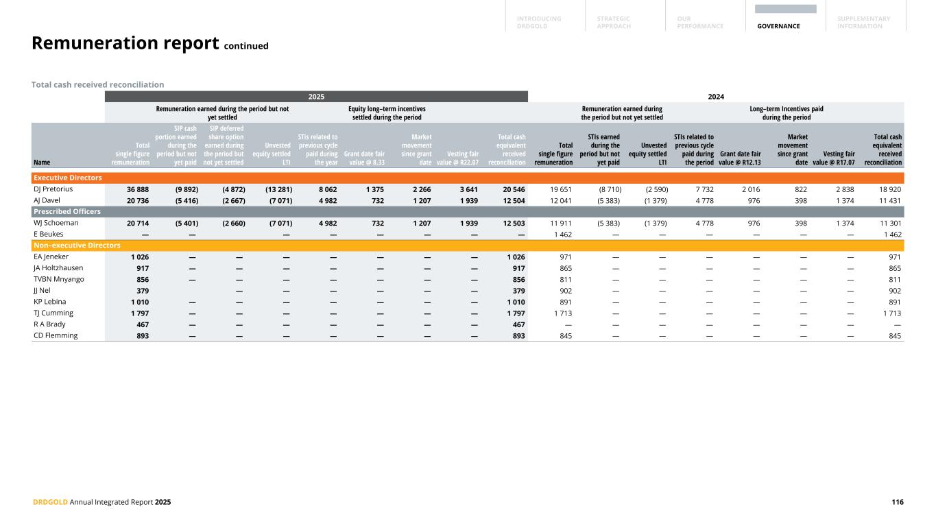 Total cash received reconciliation 2025 2024 Remuneration earned during the period but not yet settled Equity long–term incentives settled during the period Remuneration earned during the period but not yet settled Long–term Incentives paid during the period Name Total single figure remuneration SIP cash portion earned during the period but not yet paid SIP deferred share option earned during the period but not yet settled Unvested equity settled LTI STIs related to previous cycle paid during the year Grant date fair value @ 8.33 Market movement since grant date Vesting fair value @ R22.07 Total cash equivalent received reconciliation Total single figure remuneration STIs earned during the period but not yet paid Unvested equity settled LTI STIs related to previous cycle paid during the period Grant date fair value @ R12.13 Market movement since grant date Vesting fair value @ R17.07 Total cash equivalent received reconciliation Executive Directors DJ Pretorius 36 888 (9 892) (4 872) (13 281) 8 062 1 375 2 266 3 641 20 546 19 651 (8 710) (2 590) 7 732 2 016 822 2 838 18 920 AJ Davel 20 736 (5 416) (2 667) (7 071) 4 982 732 1 207 1 939 12 504 12 041 (5 383) (1 379) 4 778 976 398 1 374 11 431 Prescribed Officers WJ Schoeman 20 714 (5 401) (2 660) (7 071) 4 982 732 1 207 1 939 12 503 11 911 (5 383) (1 379) 4 778 976 398 1 374 11 301 E Beukes — — — — — — — — 1 462 — — — — — — 1 462 Non–executive Directors EA Jeneker 1 026 — — — — — — — 1 026 971 — — — — — — 971 JA Holtzhausen 917 — — — — — — — 917 865 — — — — — — 865 TVBN Mnyango 856 — — — — — — — 856 811 — — — — — — 811 JJ Nel 379 — — — — — — 379 902 — — — — — — 902 KP Lebina 1 010 — — — — — — — 1 010 891 — — — — — — 891 TJ Cumming 1 797 — — — — — — — 1 797 1 713 — — — — — — 1 713 R A Brady 467 — — — — — — — 467 — — — — — — — — CD Flemming 893 — — — — — — — 893 845 — — — — — — 845 INTRODUCING DRDGOLD STRATEGIC APPROACH OUR PERFORMANCE GOVERNANCE SUPPLEMENTARY INFORMATION Remuneration report continued DRDGOLD Annual Integrated Report 2025 116