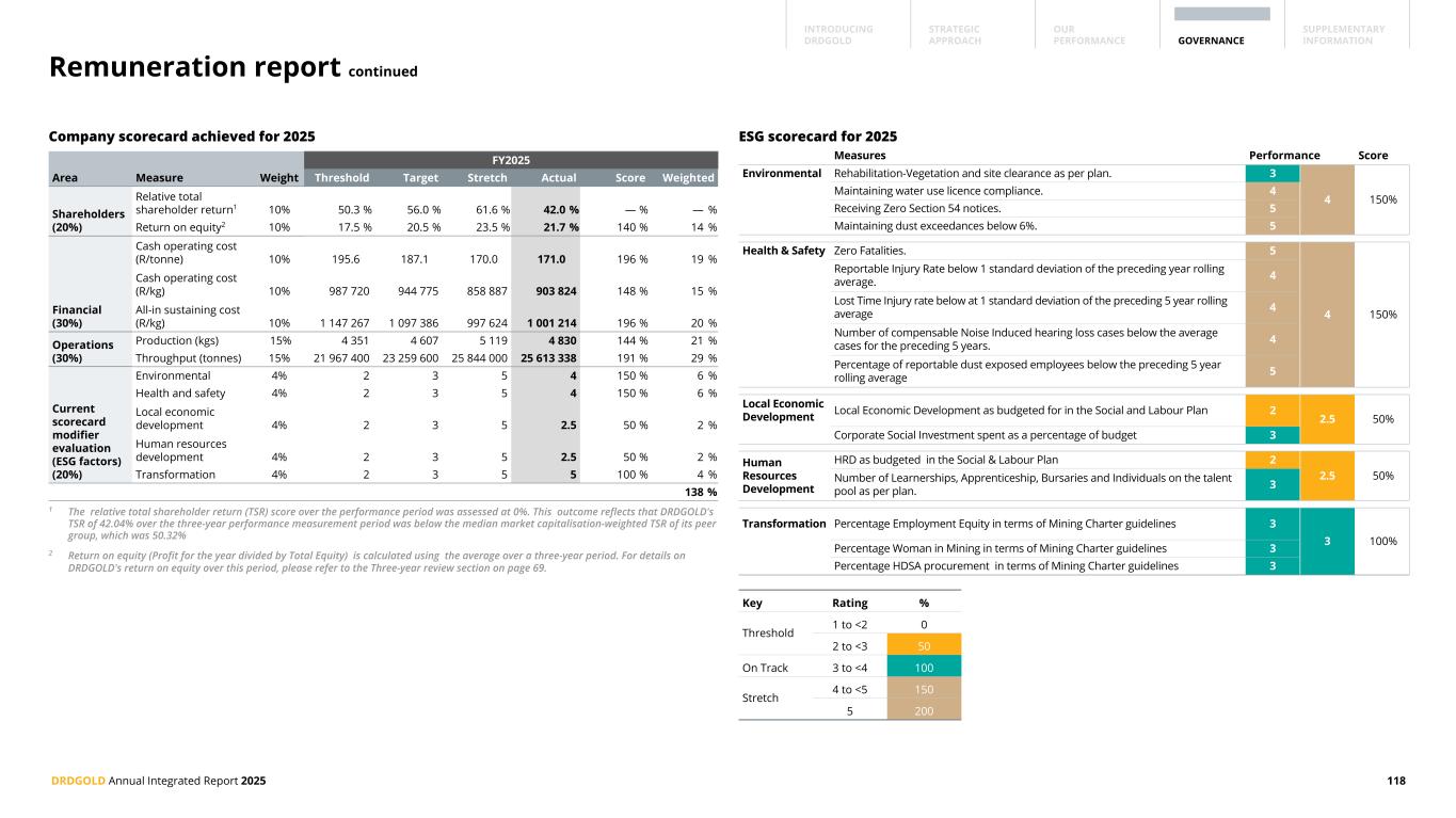 Company scorecard achieved for 2025 Area Measure Weight FY2025 Threshold Target Stretch Actual Score Weighted Shareholders (20%) Relative total shareholder return1 10% 50.3 % 56.0 % 61.6 % 42.0 % — % — % Return on equity2 10% 17.5 % 20.5 % 23.5 % 21.7 % 140 % 14 % Financial (30%) Cash operating cost (R/tonne) 10% 195.6 187.1 170.0 171.0 196 % 19 % Cash operating cost (R/kg) 10% 987 720 944 775 858 887 903 824 148 % 15 % All-in sustaining cost (R/kg) 10% 1 147 267 1 097 386 997 624 1 001 214 196 % 20 % Operations (30%) Production (kgs) 15% 4 351 4 607 5 119 4 830 144 % 21 % Throughput (tonnes) 15% 21 967 400 23 259 600 25 844 000 25 613 338 191 % 29 % Current scorecard modifier evaluation (ESG factors) (20%) Environmental 4% 2 3 5 4 150 % 6 % Health and safety 4% 2 3 5 4 150 % 6 % Local economic development 4% 2 3 5 2.5 50 % 2 % Human resources development 4% 2 3 5 2.5 50 % 2 % Transformation 4% 2 3 5 5 100 % 4 % 138 % 1 The relative total shareholder return (TSR) score over the performance period was assessed at 0%. This outcome reflects that DRDGOLD's TSR of 42.04% over the three-year performance measurement period was below the median market capitalisation-weighted TSR of its peer group, which was 50.32% 2 Return on equity (Profit for the year divided by Total Equity) is calculated using the average over a three-year period. For details on DRDGOLD's return on equity over this period, please refer to the Three-year review section on page 69. ESG scorecard for 2025 Measures Performance Score Environmental Rehabilitation-Vegetation and site clearance as per plan. 3 4 150% Maintaining water use licence compliance. 4 Receiving Zero Section 54 notices. 5 Maintaining dust exceedances below 6%. 5 Health & Safety Zero Fatalities. 5 4 150% Reportable Injury Rate below 1 standard deviation of the preceding year rolling average. 4 Lost Time Injury rate below at 1 standard deviation of the preceding 5 year rolling average 4 Number of compensable Noise Induced hearing loss cases below the average cases for the preceding 5 years. 4 Percentage of reportable dust exposed employees below the preceding 5 year rolling average 5 Local Economic Development Local Economic Development as budgeted for in the Social and Labour Plan 2 2.5 50% Corporate Social Investment spent as a percentage of budget 3 Human Resources Development HRD as budgeted in the Social & Labour Plan 2 2.5 50%Number of Learnerships, Apprenticeship, Bursaries and Individuals on the talent pool as per plan. 3 Transformation Percentage Employment Equity in terms of Mining Charter guidelines 3 3 100%Percentage Woman in Mining in terms of Mining Charter guidelines 3 Percentage HDSA procurement in terms of Mining Charter guidelines 3 Key Rating % Threshold 1 to <2 0 2 to <3 50 On Track 3 to <4 100 Stretch 4 to <5 150 5 200 INTRODUCING DRDGOLD STRATEGIC APPROACH OUR PERFORMANCE GOVERNANCE SUPPLEMENTARY INFORMATION Remuneration report continued DRDGOLD Annual Integrated Report 2025 118