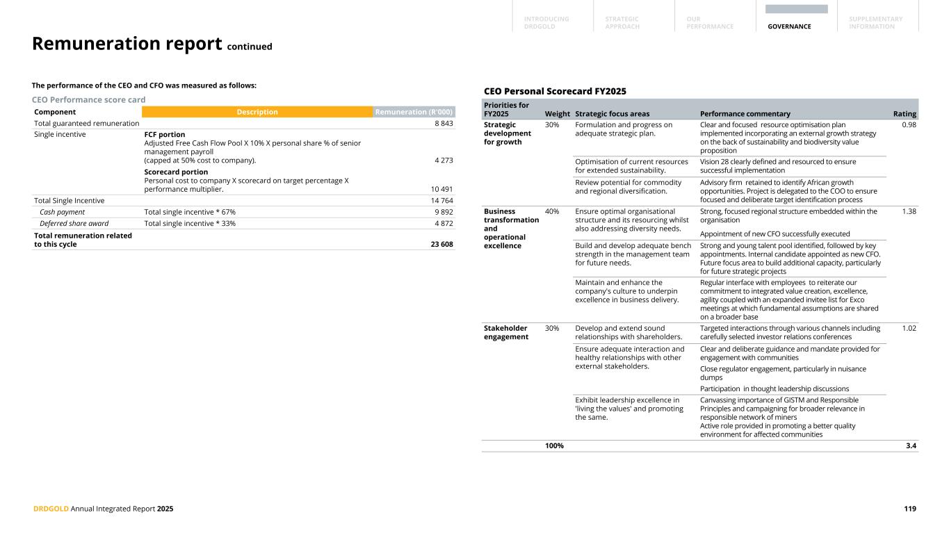 The performance of the CEO and CFO was measured as follows: CEO Performance score card Component Description Remuneration (R'000) Total guaranteed remuneration 8 843 Single incentive FCF portion Adjusted Free Cash Flow Pool X 10% X personal share % of senior management payroll (capped at 50% cost to company). 4 273 Scorecard portion Personal cost to company X scorecard on target percentage X performance multiplier. 10 491 Total Single Incentive 14 764 Cash payment Total single incentive * 67% 9 892 Deferred share award Total single incentive * 33% 4 872 Total remuneration related to this cycle 23 608 CEO Personal Scorecard FY2025 Priorities for FY2025 Weight Strategic focus areas Performance commentary Rating Strategic development for growth 30% Formulation and progress on adequate strategic plan. Clear and focused resource optimisation plan implemented incorporating an external growth strategy on the back of sustainability and biodiversity value proposition 0.98 Optimisation of current resources for extended sustainability. Vision 28 clearly defined and resourced to ensure successful implementation Review potential for commodity and regional diversification. Advisory firm retained to identify African growth opportunities. Project is delegated to the COO to ensure focused and deliberate target identification process Business transformation and operational excellence 40% Ensure optimal organisational structure and its resourcing whilst also addressing diversity needs. Strong, focused regional structure embedded within the organisation Appointment of new CFO successfully executed 1.38 Build and develop adequate bench strength in the management team for future needs. Strong and young talent pool identified, followed by key appointments. Internal candidate appointed as new CFO. Future focus area to build additional capacity, particularly for future strategic projects Maintain and enhance the company's culture to underpin excellence in business delivery. Regular interface with employees to reiterate our commitment to integrated value creation, excellence, agility coupled with an expanded invitee list for Exco meetings at which fundamental assumptions are shared on a broader base Stakeholder engagement 30% Develop and extend sound relationships with shareholders. Targeted interactions through various channels including carefully selected investor relations conferences 1.02 Ensure adequate interaction and healthy relationships with other external stakeholders. Clear and deliberate guidance and mandate provided for engagement with communities Close regulator engagement, particularly in nuisance dumps Participation in thought leadership discussions Exhibit leadership excellence in 'living the values' and promoting the same. Canvassing importance of GISTM and Responsible Principles and campaigning for broader relevance in responsible network of miners Active role provided in promoting a better quality environment for affected communities 100% 3.4 INTRODUCING DRDGOLD STRATEGIC APPROACH OUR PERFORMANCE GOVERNANCE SUPPLEMENTARY INFORMATION Remuneration report continued DRDGOLD Annual Integrated Report 2025 119