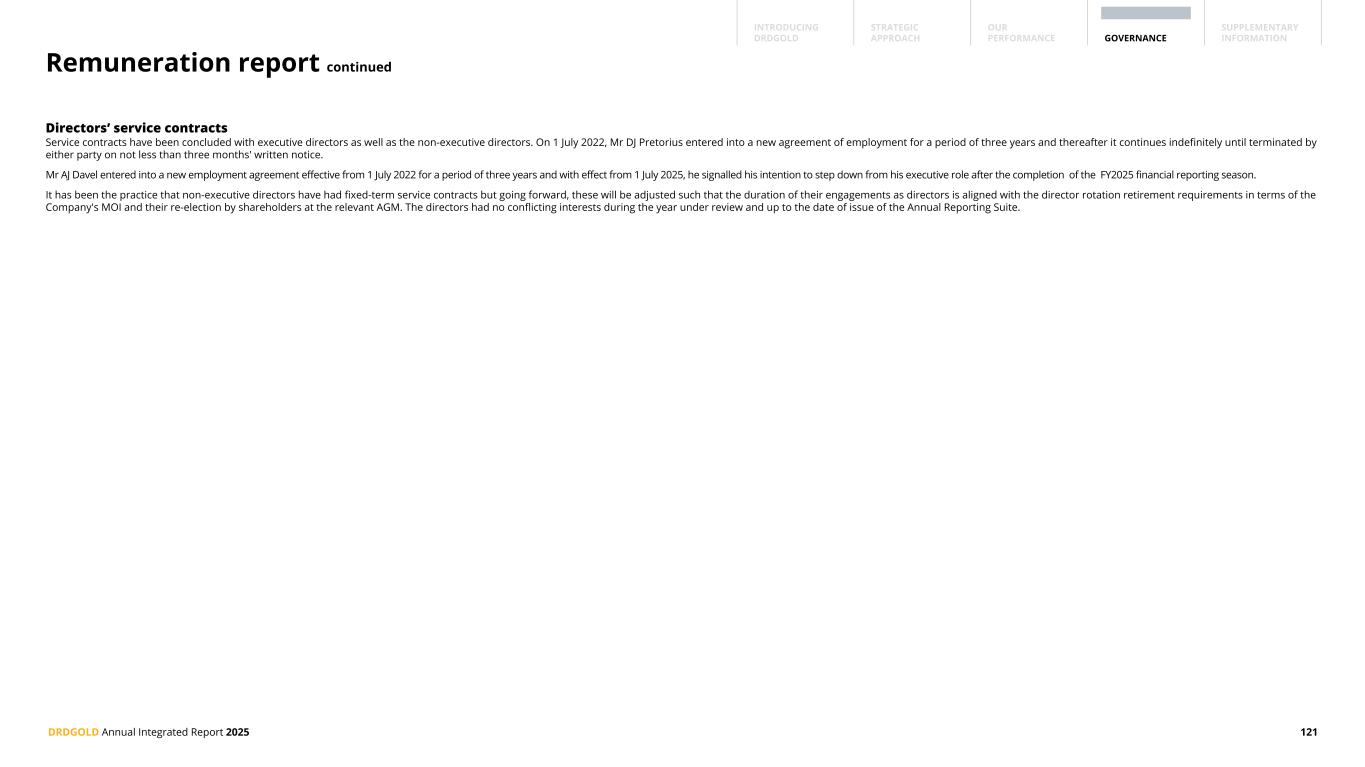 Directors’ service contracts Service contracts have been concluded with executive directors as well as the non-executive directors. On 1 July 2022, Mr DJ Pretorius entered into a new agreement of employment for a period of three years and thereafter it continues indefinitely until terminated by either party on not less than three months' written notice. Mr AJ Davel entered into a new employment agreement effective from 1 July 2022 for a period of three years and with effect from 1 July 2025, he signalled his intention to step down from his executive role after the completion of the FY2025 financial reporting season. It has been the practice that non-executive directors have had fixed-term service contracts but going forward, these will be adjusted such that the duration of their engagements as directors is aligned with the director rotation retirement requirements in terms of the Company's MOI and their re-election by shareholders at the relevant AGM. The directors had no conflicting interests during the year under review and up to the date of issue of the Annual Reporting Suite. INTRODUCING DRDGOLD STRATEGIC APPROACH OUR PERFORMANCE GOVERNANCE SUPPLEMENTARY INFORMATION Remuneration report continued DRDGOLD Annual Integrated Report 2025 121