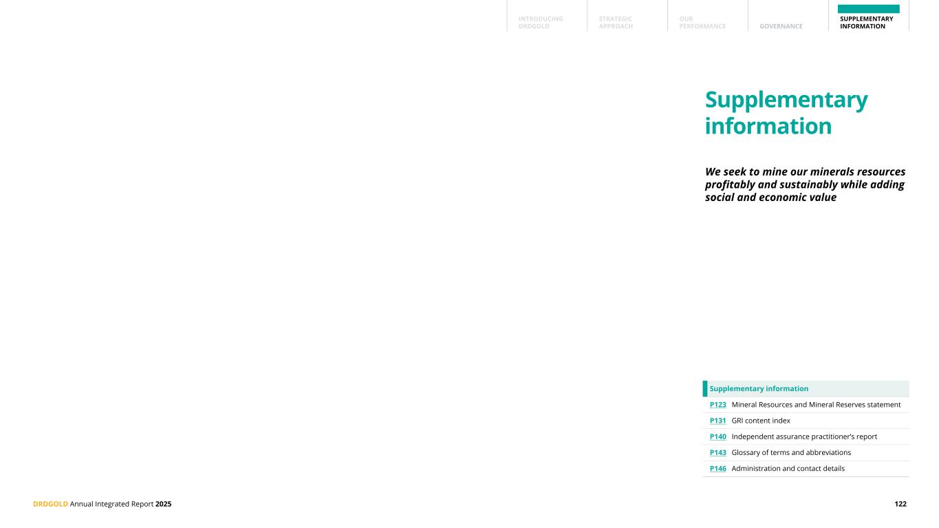 Supplementary information Supplementary information P123 Mineral Resources and Mineral Reserves statement P131 GRI content index P140 Independent assurance practitioner’s report P143 Glossary of terms and abbreviations P146 Administration and contact details INTRODUCING DRDGOLD STRATEGIC APPROACH OUR PERFORMANCE GOVERNANCE SUPPLEMENTARY INFORMATION DRDGOLD Annual Integrated Report 2025 122 We seek to mine our minerals resources profitably and sustainably while adding social and economic value