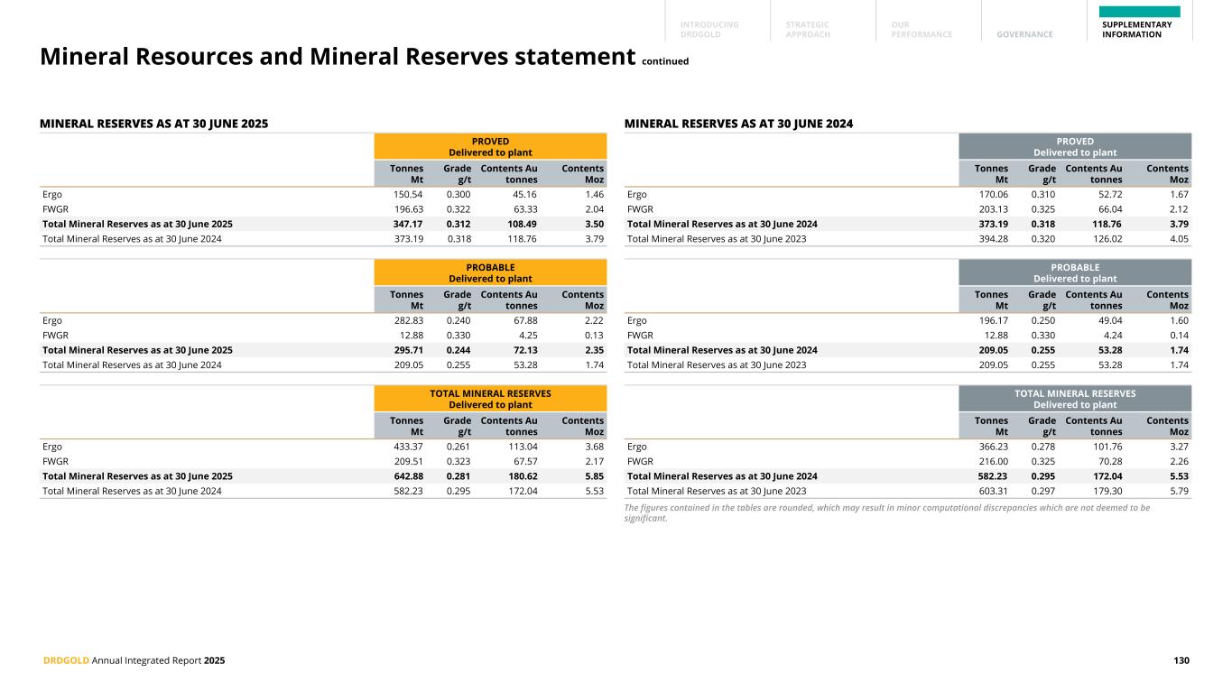 MINERAL RESERVES AS AT 30 JUNE 2025 PROVED Delivered to plant Tonnes Mt Grade g/t Contents Au tonnes Contents Moz Ergo 150.54 0.300 45.16 1.46 FWGR 196.63 0.322 63.33 2.04 Total Mineral Reserves as at 30 June 2025 347.17 0.312 108.49 3.50 Total Mineral Reserves as at 30 June 2024 373.19 0.318 118.76 3.79 PROBABLE Delivered to plant Tonnes Mt Grade g/t Contents Au tonnes Contents Moz Ergo 282.83 0.240 67.88 2.22 FWGR 12.88 0.330 4.25 0.13 Total Mineral Reserves as at 30 June 2025 295.71 0.244 72.13 2.35 Total Mineral Reserves as at 30 June 2024 209.05 0.255 53.28 1.74 TOTAL MINERAL RESERVES Delivered to plant Tonnes Mt Grade g/t Contents Au tonnes Contents Moz Ergo 433.37 0.261 113.04 3.68 FWGR 209.51 0.323 67.57 2.17 Total Mineral Reserves as at 30 June 2025 642.88 0.281 180.62 5.85 Total Mineral Reserves as at 30 June 2024 582.23 0.295 172.04 5.53 MINERAL RESERVES AS AT 30 JUNE 2024 PROVED Delivered to plant Tonnes Mt Grade g/t Contents Au tonnes Contents Moz Ergo 170.06 0.310 52.72 1.67 FWGR 203.13 0.325 66.04 2.12 Total Mineral Reserves as at 30 June 2024 373.19 0.318 118.76 3.79 Total Mineral Reserves as at 30 June 2023 394.28 0.320 126.02 4.05 PROBABLE Delivered to plant Tonnes Mt Grade g/t Contents Au tonnes Contents Moz Ergo 196.17 0.250 49.04 1.60 FWGR 12.88 0.330 4.24 0.14 Total Mineral Reserves as at 30 June 2024 209.05 0.255 53.28 1.74 Total Mineral Reserves as at 30 June 2023 209.05 0.255 53.28 1.74 TOTAL MINERAL RESERVES Delivered to plant Tonnes Mt Grade g/t Contents Au tonnes Contents Moz Ergo 366.23 0.278 101.76 3.27 FWGR 216.00 0.325 70.28 2.26 Total Mineral Reserves as at 30 June 2024 582.23 0.295 172.04 5.53 Total Mineral Reserves as at 30 June 2023 603.31 0.297 179.30 5.79 The figures contained in the tables are rounded, which may result in minor computational discrepancies which are not deemed to be significant. INTRODUCING DRDGOLD STRATEGIC APPROACH OUR PERFORMANCE GOVERNANCE SUPPLEMENTARY INFORMATION Mineral Resources and Mineral Reserves statement continued DRDGOLD Annual Integrated Report 2025 130