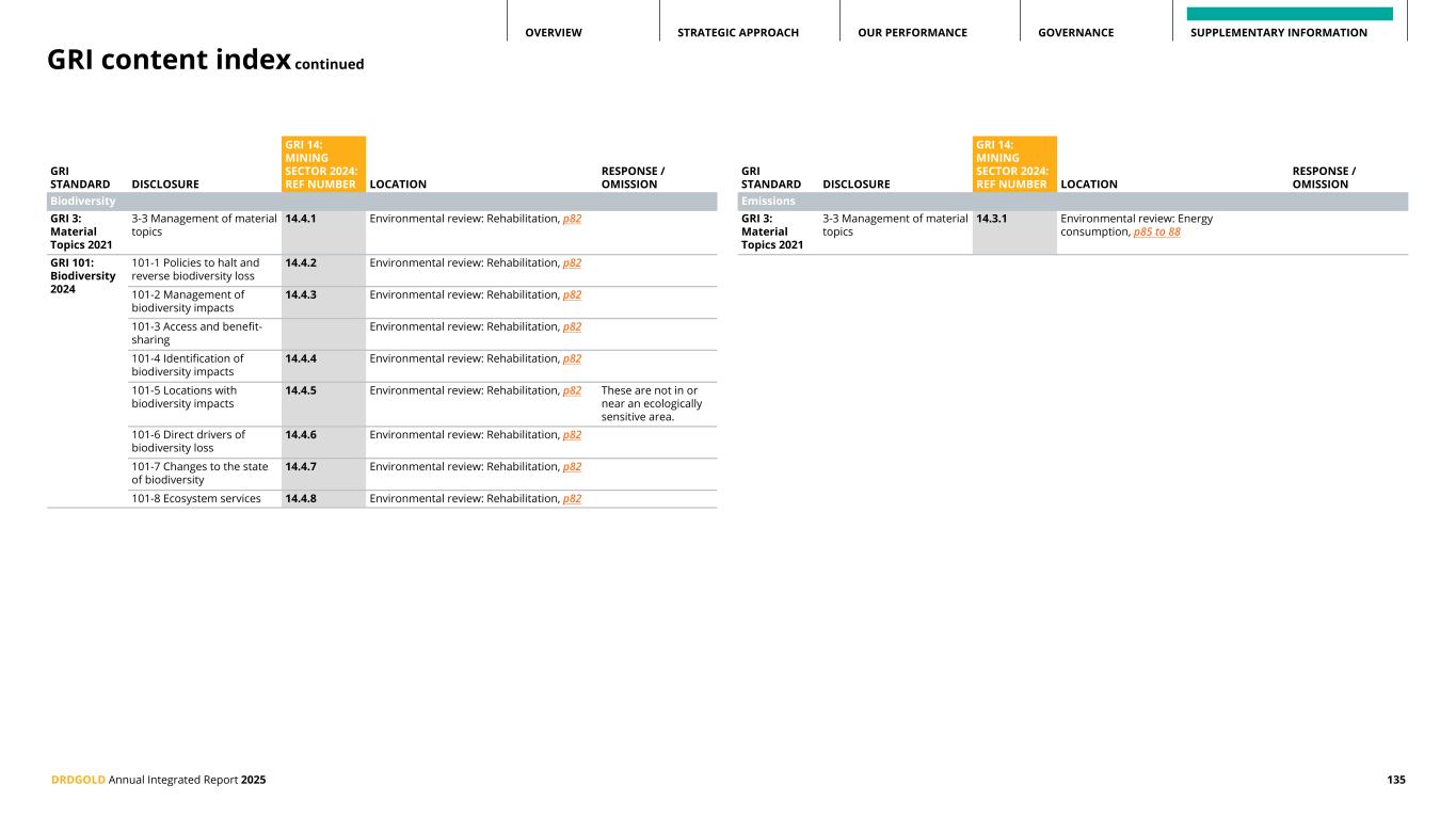 GRI STANDARD DISCLOSURE GRI 14: MINING SECTOR 2024: REF NUMBER LOCATION RESPONSE / OMISSION Biodiversity GRI 3: Material Topics 2021 3-3 Management of material topics 14.4.1 Environmental review: Rehabilitation, p82 GRI 101: Biodiversity 2024 101-1 Policies to halt and reverse biodiversity loss 14.4.2 Environmental review: Rehabilitation, p82 101-2 Management of biodiversity impacts 14.4.3 Environmental review: Rehabilitation, p82 101-3 Access and benefit- sharing Environmental review: Rehabilitation, p82 101-4 Identification of biodiversity impacts 14.4.4 Environmental review: Rehabilitation, p82 101-5 Locations with biodiversity impacts 14.4.5 Environmental review: Rehabilitation, p82 These are not in or near an ecologically sensitive area. 101-6 Direct drivers of biodiversity loss 14.4.6 Environmental review: Rehabilitation, p82 101-7 Changes to the state of biodiversity 14.4.7 Environmental review: Rehabilitation, p82 101-8 Ecosystem services 14.4.8 Environmental review: Rehabilitation, p82 GRI STANDARD DISCLOSURE GRI 14: MINING SECTOR 2024: REF NUMBER LOCATION RESPONSE / OMISSION Emissions GRI 3: Material Topics 2021 3-3 Management of material topics 14.3.1 Environmental review: Energy consumption, p85 to 88 OVERVIEW STRATEGIC APPROACH OUR PERFORMANCE GOVERNANCE SUPPLEMENTARY INFORMATION GRI content index continued DRDGOLD Annual Integrated Report 2025 135