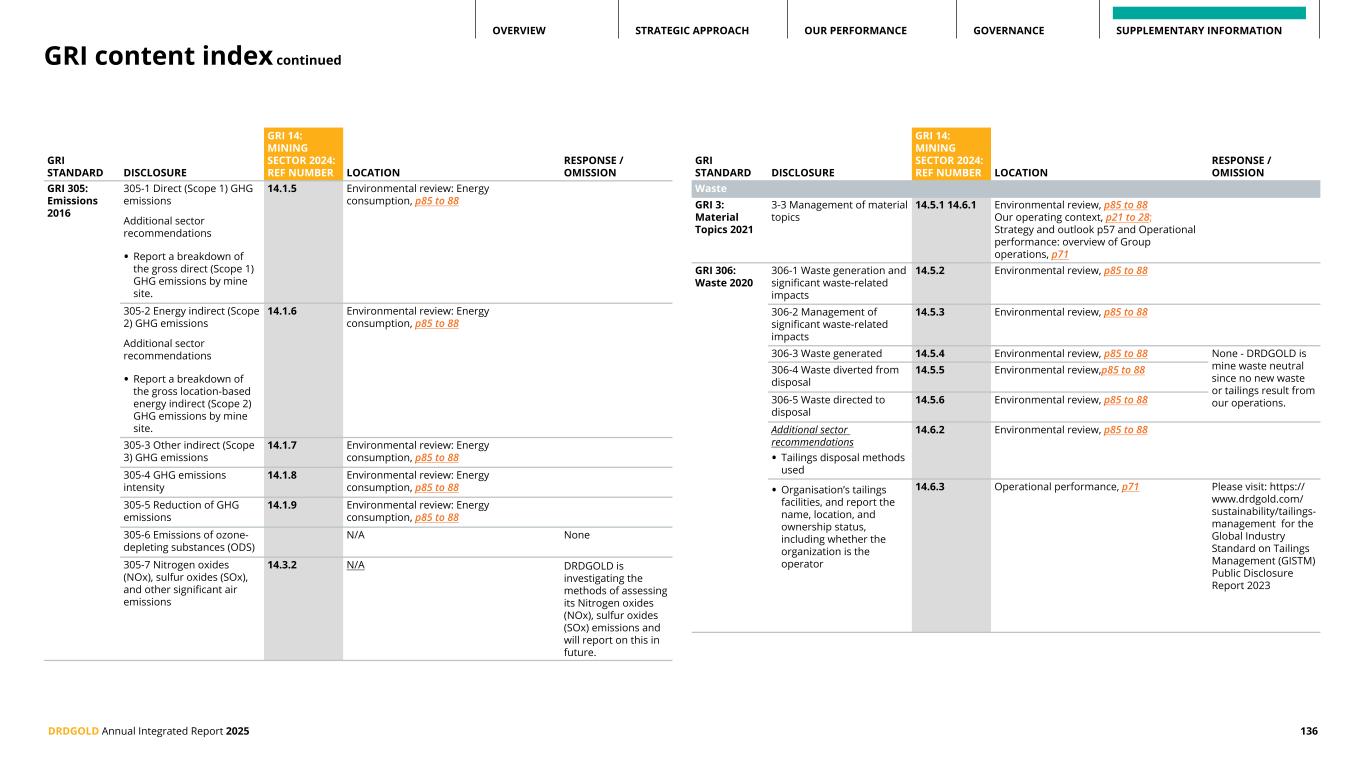 GRI STANDARD DISCLOSURE GRI 14: MINING SECTOR 2024: REF NUMBER LOCATION RESPONSE / OMISSION GRI 305: Emissions 2016 305-1 Direct (Scope 1) GHG emissions Additional sector recommendations • Report a breakdown of the gross direct (Scope 1) GHG emissions by mine site. 14.1.5 Environmental review: Energy consumption, p85 to 88 305-2 Energy indirect (Scope 2) GHG emissions Additional sector recommendations • Report a breakdown of the gross location-based energy indirect (Scope 2) GHG emissions by mine site. 14.1.6 Environmental review: Energy consumption, p85 to 88 305-3 Other indirect (Scope 3) GHG emissions 14.1.7 Environmental review: Energy consumption, p85 to 88 305-4 GHG emissions intensity 14.1.8 Environmental review: Energy consumption, p85 to 88 305-5 Reduction of GHG emissions 14.1.9 Environmental review: Energy consumption, p85 to 88 305-6 Emissions of ozone- depleting substances (ODS) N/A None 305-7 Nitrogen oxides (NOx), sulfur oxides (SOx), and other significant air emissions 14.3.2 N/A DRDGOLD is investigating the methods of assessing its Nitrogen oxides (NOx), sulfur oxides (SOx) emissions and will report on this in future. GRI STANDARD DISCLOSURE GRI 14: MINING SECTOR 2024: REF NUMBER LOCATION RESPONSE / OMISSION Waste GRI 3: Material Topics 2021 3-3 Management of material topics 14.5.1 14.6.1 Environmental review, p85 to 88 Our operating context, p21 to 28; Strategy and outlook p57 and Operational performance: overview of Group operations, p71 GRI 306: Waste 2020 306-1 Waste generation and significant waste-related impacts 14.5.2 Environmental review, p85 to 88 306-2 Management of significant waste-related impacts 14.5.3 Environmental review, p85 to 88 306-3 Waste generated 14.5.4 Environmental review, p85 to 88 None - DRDGOLD is mine waste neutral since no new waste or tailings result from our operations. 306-4 Waste diverted from disposal 14.5.5 Environmental review,p85 to 88 306-5 Waste directed to disposal 14.5.6 Environmental review, p85 to 88 Additional sector recommendations • Tailings disposal methods used 14.6.2 Environmental review, p85 to 88 • Organisation’s tailings facilities, and report the name, location, and ownership status, including whether the organization is the operator 14.6.3 Operational performance, p71 Please visit: https:// www.drdgold.com/ sustainability/tailings- management for the Global Industry Standard on Tailings Management (GISTM) Public Disclosure Report 2023 OVERVIEW STRATEGIC APPROACH OUR PERFORMANCE GOVERNANCE SUPPLEMENTARY INFORMATION GRI content index continued DRDGOLD Annual Integrated Report 2025 136