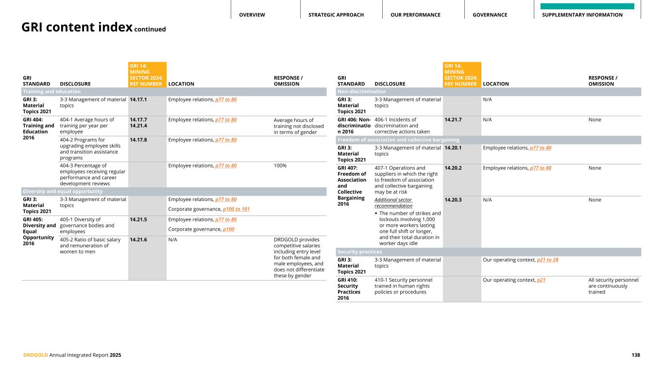 GRI STANDARD DISCLOSURE GRI 14: MINING SECTOR 2024: REF NUMBER LOCATION RESPONSE / OMISSION Training and education GRI 3: Material Topics 2021 3-3 Management of material topics 14.17.1 Employee relations, p77 to 80 GRI 404: Training and Education 2016 404-1 Average hours of training per year per employee 14.17.7 14.21.4 Employee relations, p77 to 80 Average hours of training not disclosed in terms of gender 404-2 Programs for upgrading employee skills and transition assistance programs 14.17.8 Employee relations, p77 to 80 404-3 Percentage of employees receiving regular performance and career development reviews Employee relations, p77 to 80 100% Diversity and equal opportunity GRI 3: Material Topics 2021 3-3 Management of material topics Employee relations, p77 to 80 Corporate governance, p100 to 101 GRI 405: Diversity and Equal Opportunity 2016 405-1 Diversity of governance bodies and employees 14.21.5 Employee relations, p77 to 80 Corporate governance, p100 405-2 Ratio of basic salary and remuneration of women to men 14.21.6 N/A DRDGOLD provides competitive salaries including entry level for both female and male employees, and does not differentiate these by gender GRI STANDARD DISCLOSURE GRI 14: MINING SECTOR 2024: REF NUMBER LOCATION RESPONSE / OMISSION Non-discrimination GRI 3: Material Topics 2021 3-3 Management of material topics N/A GRI 406: Non- discriminatio n 2016 406-1 Incidents of discrimination and corrective actions taken 14.21.7 N/A None Freedom of association and collective bargaining GRI 3: Material Topics 2021 3-3 Management of material topics 14.20.1 Employee relations, p77 to 80 GRI 407: Freedom of Association and Collective Bargaining 2016 407-1 Operations and suppliers in which the right to freedom of association and collective bargaining may be at risk 14.20.2 Employee relations, p77 to 80 None Additional sector recommendation • The number of strikes and lockouts involving 1,000 or more workers lasting one full shift or longer, and their total duration in worker days idle 14.20.3 N/A None Security practices GRI 3: Material Topics 2021 3-3 Management of material topics Our operating context, p21 to 28 GRI 410: Security Practices 2016 410-1 Security personnel trained in human rights policies or procedures Our operating context, p21 All security personnel are continuously trained OVERVIEW STRATEGIC APPROACH OUR PERFORMANCE GOVERNANCE SUPPLEMENTARY INFORMATION GRI content index continued DRDGOLD Annual Integrated Report 2025 138
