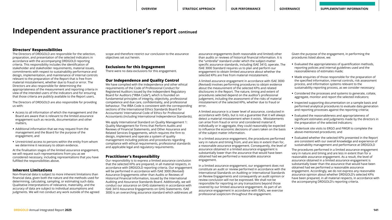 Directors’ Responsibilities The Directors of DRDGOLD are responsible for the selection, preparation, and presentation of the selected indicators in accordance with the accompanying DRDGOLD reporting criteria. This responsibility includes the identification of stakeholder and stakeholder requirements, material issues, commitments with respect to sustainability performance and design, implementation, and maintenance of internal controls relevant to the preparation of the Report that is free from material misstatement, whether due to fraud or error. The Directors are also responsible for determining the appropriateness of the measurement and reporting criteria in view of the intended users of the indicators and for ensuring that those criteria are publicly available to the Report users. The Directors of DRDGOLD are also responsible for providing us with: • Access to all information of which the management and the Board are aware that is relevant to the limited assurance engagement such as records, documentation and other matters, • Additional information that we may request from the management and the Board for the purpose of the engagement, and • Unrestricted access to persons within the entity from whom we determine it necessary to obtain evidence. At the finalisation stages of the limited assurance engagement, we will request such representations from you as we considered necessary, including representations that you have fulfilled the responsibilities above. Inherent Limitations Non-financial data is subject to more inherent limitations than financial data, given both the nature and the methods used for determining, calculating, sampling, or estimating such data. Qualitative interpretations of relevance, materiality, and the accuracy of data are subject to individual assumptions and judgments. We will not conduct any work outside of the agreed scope and therefore restrict our conclusion to the assurance objectives set out herein. Exclusions for this Engagement There were no data exclusions for this engagement. Our Independence and Quality Control We have complied with the independence and other ethical requirements of the Code of Professional Conduct for Registered Auditors issued by the Independent Regulatory Board for Auditors (“IRBA Code”), which is founded on fundamental principles of integrity, objectivity, professional competence and due care, confidentiality, and professional behaviour. The IRBA Code is consistent with the corresponding sections of the International Ethics Standards Board for Accountants’ International Code of Ethics for Professional Accountants (including International Independence Standards). We apply International Standard on Quality Management 1: Quality Management for Firms that Perform Audits and Reviews of Financial Statements, and Other Assurance and Related Services Engagements, which requires the firm to design, implement and operate a system of quality management including policies and procedures regarding compliance with ethical requirements, professional standards and applicable legal and regulatory requirements. Practitioner's Responsibility Our responsibility is to express a limited assurance conclusion that the selected KPIs are prepared, in all material respects, in accordance with DRDGOLD reporting criteria. Our engagement will be performed in accordance with ISAE 3000 (Revised) Assurance Engagements other than Audits or Reviews of Historical Financial Information, issued by the International Auditing and Assurance Standards Board. Additionally, we will conduct our assurance on GHG statements in accordance with ISAE 3410 Assurance Engagements on GHG Statements. ISAE 3000 is an overarching assurance standard which addresses all assurance engagements (both reasonable and limited) other than audits or reviews of historical financial information. It is the “umbrella” standard under which the subject-matter specific assurance standards, including ISAE 3410, operate. The ISAE 3000 Standard requires us to plan and perform our engagement to obtain limited assurance about whether the selected KPIs are free from material misstatement. A limited assurance engagement in accordance with ISAE 3000 (Revised) involves performing procedures to obtain evidence about the measurement of the selected KPIs and related disclosures in the Report. The nature, timing and extent of procedures selected depend on the auditor’s professional judgement, including the assessment of the risks of material misstatement of the selected KPIs, whether due to fraud or error. A limited assurance is a lower level of assurance, conducted in accordance with ISAEs, but is not a guarantee that it will always detect a material misstatement when it exists. Misstatements can arise from fraud or error and considered material if, individually or in aggregate, they could reasonably be expected to influence the economic decisions of users taken on the basis of the subject matter information. In a limited assurance engagement, the procedures performed vary in nature and timing from, and are less in extent than for, a reasonable assurance engagement. Consequently, the level of assurance obtained in a limited assurance engagement is substantially lower than the assurance that would have been obtained had we performed a reasonable assurance engagement. In a limited assurance engagement, our engagement does not constitute an audit or review performed in accordance with the International Standards on Auditing or International Standards on Review Engagements and consequently an audit opinion or review conclusion will not be expressed. We shall not be responsible for reporting on any transactions beyond those covered by our limited assurance engagement. As part of an assurance engagement in accordance with ISAEs, we exercise professional scepticism throughout the engagement. Given the purpose of the engagement, in performing the procedures listed above, we: • Evaluated the appropriat