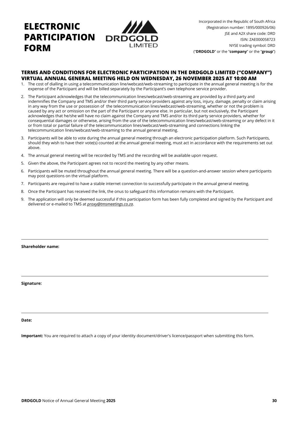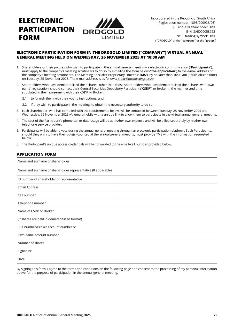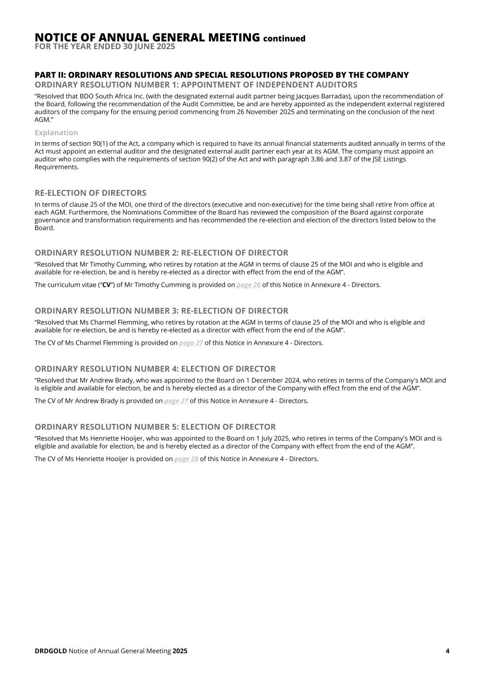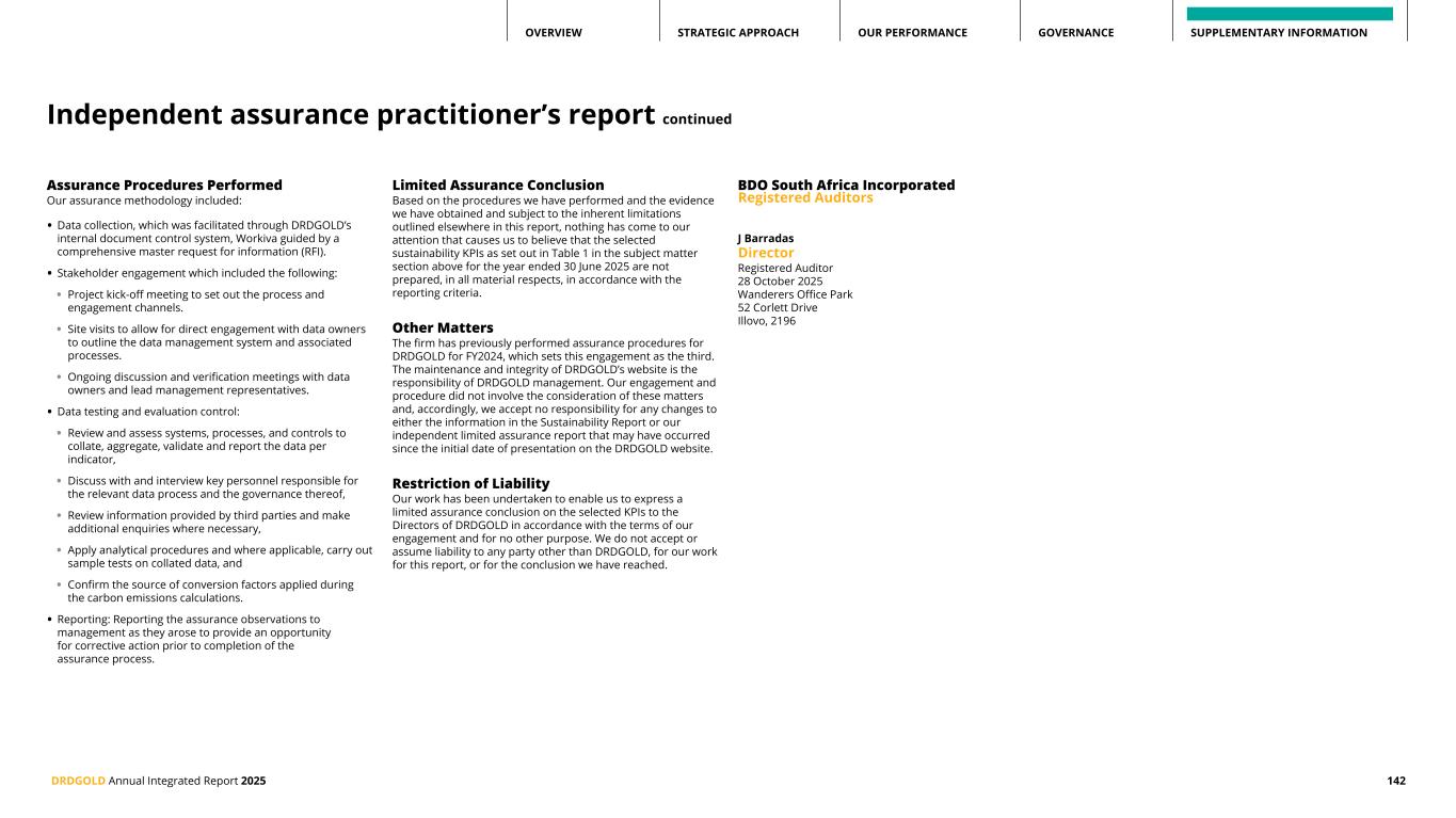 Assurance Procedures Performed Our assurance methodology included: • Data collection, which was facilitated through DRDGOLD’s internal document control system, Workiva guided by a comprehensive master request for information (RFI). • Stakeholder engagement which included the following: • Project kick-off meeting to set out the process and engagement channels. • Site visits to allow for direct engagement with data owners to outline the data management system and associated processes. • Ongoing discussion and verification meetings with data owners and lead management representatives. • Data testing and evaluation control: • Review and assess systems, processes, and controls to collate, aggregate, validate and report the data per indicator, • Discuss with and interview key personnel responsible for the relevant data process and the governance thereof, • Review information provided by third parties and make additional enquiries where necessary, • Apply analytical procedures and where applicable, carry out sample tests on collated data, and • Confirm the source of conversion factors applied during the carbon emissions calculations. • Reporting: Reporting the assurance observations to management as they arose to provide an opportunity for corrective action prior to completion of the assurance process. Limited Assurance Conclusion Based on the procedures we have performed and the evidence we have obtained and subject to the inherent limitations outlined elsewhere in this report, nothing has come to our attention that causes us to believe that the selected sustainability KPIs as set out in Table 1 in the subject matter section above for the year ended 30 June 2025 are not prepared, in all material respects, in accordance with the reporting criteria. Other Matters The firm has previously performed assurance procedures for DRDGOLD for FY2024, which sets this engagement as the third. The maintenance and integrity of DRDGOLD’s website is the responsibility of DRDGOLD management. Our engagement and procedure did not involve the consideration of these matters and, accordingly, we accept no responsibility for any changes to either the information in the Sustainability Report or our independent limited assurance report that may have occurred since the initial date of presentation on the DRDGOLD website. Restriction of Liability Our work has been undertaken to enable us to express a limited assurance conclusion on the selected KPIs to the Directors of DRDGOLD in accordance with the terms of our engagement and for no other purpose. We do not accept or assume liability to any party other than DRDGOLD, for our work for this report, or for the conclusion we have reached. BDO South Africa Incorporated Registered Auditors J Barradas Director Registered Auditor 28 October 2025 Wanderers Office Park 52 Corlett Drive Illovo, 2196 OVERVIEW STRATEGIC APPROACH OUR PERFORMANCE GOVERNANCE SUPPLEMENTARY INFORMATION Independent assurance practitioner’s report continued DRDGOLD Annual Integrated Report 2025 142