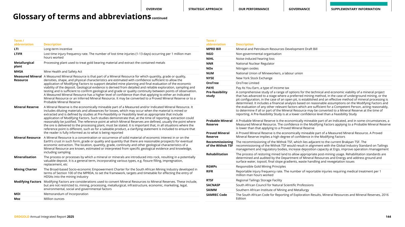 Description AFS Annual Financial Statements AGM Annual general meeting AISC All-in sustaining costs AI Artificial intelligence AMCU Association of Mineworkers and Construction Union, a labour union AMD Acid mine drainage B-BBEE Broad-Based Black Economic Empowerment BBL Broad-Based Livelihoods Programme BDO South Africa Inc External auditors for DRDGOLD / independent assurance provider for selected sustainability key performance indicators in this report Board Board of Directors CEO Chief Executive Officer CFO Chief Financial Officer COO Chief Operations Officer CIL Carbon in leach: a process for extracting gold from slurry material CLTI Cash settled long-term incentive benefit CP Competent Person is a person who is registered with SACNASP, ECSA or SAGC, or is a Member or Fellow of the SAIMM, the GSSA, IMSSA or a Recognised Professional Organisation (RPO). These organisations have enforceable disciplinary processes including the powers to suspend or expel a member. The Competent Person must comply with the provisions of the relevant promulgated Acts. A Competent Person must have a minimum of five years relevant experience in the style of mineralisation or type of deposit under consideration and in the activity which that person is undertaking cps Cents per share CSI Corporate social investment DMPR Department of Mineral and Petroleum Resources DRDGOLD or Company DRDGOLD Limited DP2 Driefontein plant 2 DSP Deferred Share Plan ECSA Engineering Council of South Africa Ergo Ergo Mining Proprietary Limited, an operating company owned by DRDGOLD, which includes the City Deep, Knights and Brakpan sites from 3 July 2012 ERPM East Rand Proprietary Mines Limited, wholly-owned by DRDGOLD, which is currently under care and maintenance Term / abbreviation Description ERM Enterprise-wide risk management ESG Environment, social and governance FCF Free cash flow Feasibility Study A Feasibility Study is a comprehensive technical and economic study of the selected development option for a mineral project that includes appropriately detailed assessments of applicable Modifying Factors together with any other relevant operational factors and detailed financial analysis that are necessary to demonstrate at the time of reporting that extraction is reasonably justified (economically mineable). The results of the study may reasonably serve as the basis for a final decision by a proponent or financial institution to proceed with, or finance, the development of the project. The confidence level of the study will be higher than that of a Pre-feasibility Study FWGR Far West Gold Recoveries Proprietary Limited, an operating company owned by DRDGOLD which includes sites in the Carletonville area of Gauteng GBV Gender-based violence GHG Greenhouse gas emissions GRI Global Reporting Initiative HDP Historically disadvantaged people HDSA Historically disadvantaged South African IFRS International Financial Reporting Standards Indicated Mineral Resource An Indicated Mineral Resource, is that part of a Mineral Resource for which quantity, grade or quality, densities, shape and physical characteristics are estimated with sufficient confidence to allow the application of Modifying Factors in sufficient detail to support mine planning and evaluation of the economic viability of the deposit. Geological evidence is derived from adequately detailed and reliable exploration, sampling and testing and is sufficient to assume geological and grade or quality continuity between points of observation Inferred Mineral Resource An Inferred Mineral Resource is that part of a Mineral Resource for which quantity and grade or quality are estimated on the basis of limited geological evidence and sampling. Geological evidence is sufficient to imply but not verify geological and grade or quality continuity. An Inferred Resource has a lower level of confidence than that applying to an Indicated Mineral Resource and must not be converted to a Mineral Reserve. It is reasonably expected that the majority of Inferred Mineral Resources could be upgraded to Indicated Mineral Resources with continued exploration JSE Johannesburg Stock Exchange Limited KPI Key performance indicator LA Limited assurance LoM Life-of-mine. Number of years that the operation is planning to mine and treat gold bearing material, taken from the current mine plan LED Local economic development LID Lead independent non-executive director Term / abbreviation OVERVIEW STRATEGIC APPROACH OUR PERFORMANCE GOVERNANCE SUPPLEMENTARY INFORMATION Glossary of terms and abbreviations DRDGOLD Annual Integrated Report 2025 143