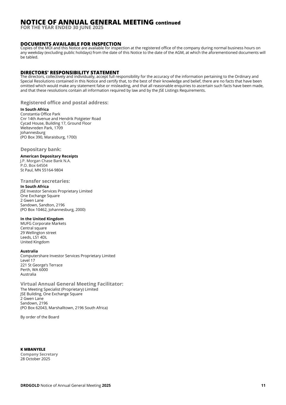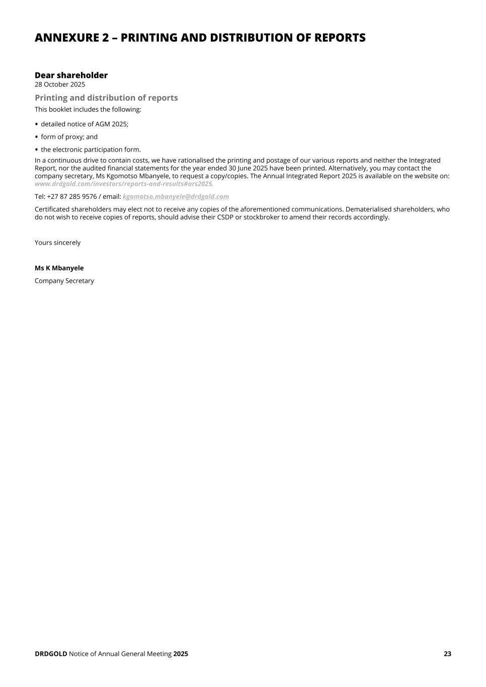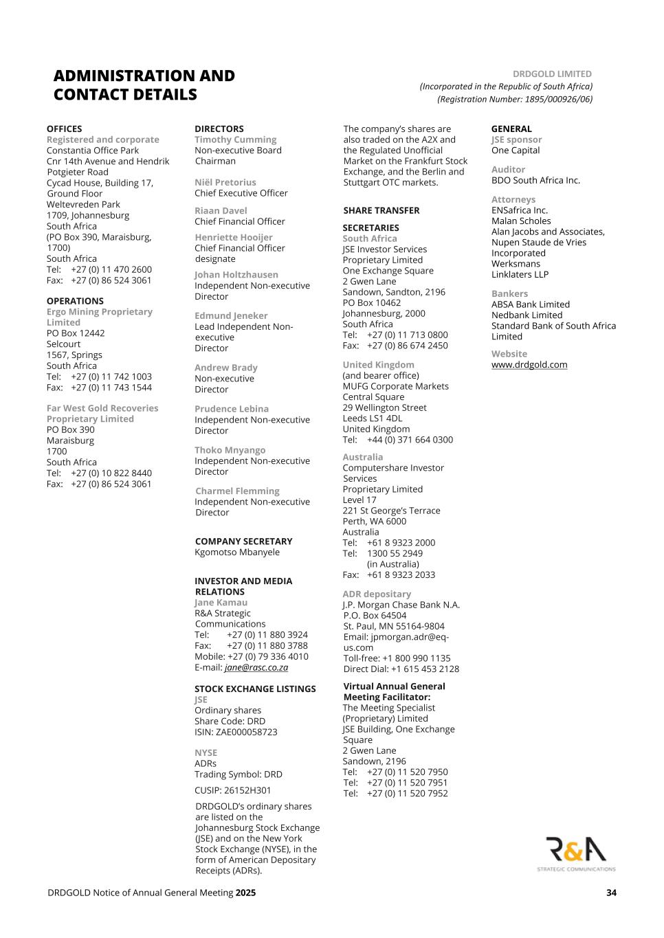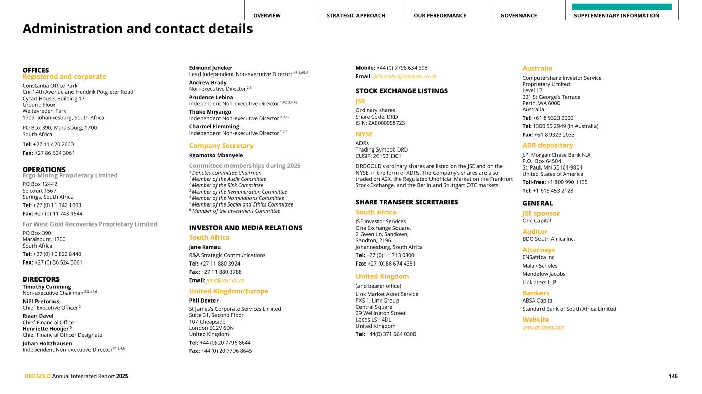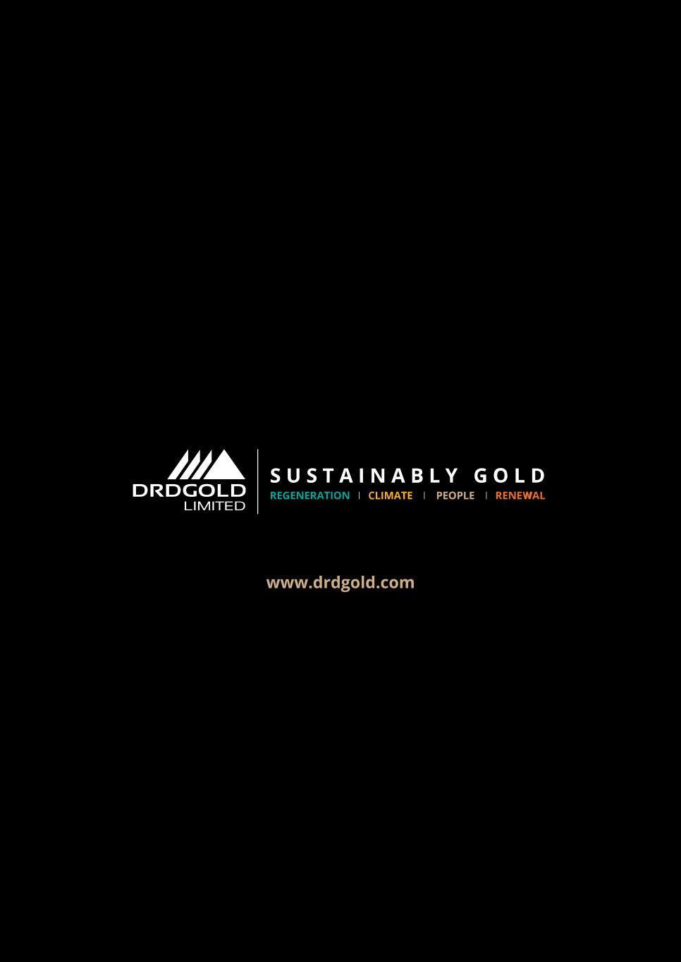 OFFICES Registered and corporate Constantia Office Park Cnr 14th Avenue and Hendrik Potgieter Road Cycad House, Building 17, Ground Floor Weltevreden Park 1709, Johannesburg, South Africa PO Box 390, Maraisburg, 1700 South Africa Tel: +27 11 470 2600 Fax: +27 86 524 3061 OPERATIONS Ergo Mining Proprietary Limited PO Box 12442 Selcourt 1567 Springs, South Africa Tel: +27 (0) 11 742 1003 Fax: +27 (0) 11 743 1544 Far West Gold Recoveries Proprietary Limited PO Box 390 Maraisburg, 1700 South Africa Tel: +27 (0) 10 822 8440 Fax: +27 (0) 86 524 3061 DIRECTORS Timothy Cumming Non-executive Chairman 2,3,#4,6 Niël Pretorius Chief Executive Officer 2 Riaan Davel Chief Financial Officer Henriette Hooijer 5 Chief Financial Officer Designate Johan Holtzhausen Independent Non-executive Director#1,3,4,6 Edmund Jeneker Lead Independent Non-executive Director #3,4,#5,6 Andrew Brady Non-executive Director 2,6 Prudence Lebina Independent Non-executive Director 1,#2,3,4,#6 Thoko Mnyango Independent Non-executive Director 2,,4,5 Charmel Flemming Independent Non-executive Director 1,2,5 Company Secretary Kgomotso Mbanyele Committee memberships during 2025 # Denotes committee Chairman 1 Member of the Audit Committee 2 Member of the Risk Committee 3 Member of the Remuneration Committee 4 Member of the Nominations Committee 5 Member of the Social and Ethics Committee 6 Member of the Investment Committee INVESTOR AND MEDIA RELATIONS South Africa Jane Kamau R&A Strategic Communications Tel: +27 11 880 3924 Fax: +27 11 880 3788 Email: jane@rasc.co.za United Kingdom/Europe Phil Dexter St James’s Corporate Services Limited Suite 31, Second Floor 107 Cheapside London EC2V 6DN United Kingdom Tel: +44 (0) 20 7796 8644 Fax: +44 (0) 20 7796 8645 Mobile: +44 (0) 7798 634 398 Email: phil.dexter@corpserv.co.uk STOCK EXCHANGE LISTINGS JSE Ordinary shares Share Code: DRD ISIN: ZAE000058723 NYSE ADRs Trading Symbol: DRD CUSIP: 26152H301 DRDGOLD’s ordinary shares are listed on the JSE and on the NYSE, in the form of ADRs. The Company’s shares are also traded on A2X, the Regulated Unofficial Market on the Frankfurt Stock Exchange, and the Berlin and Stuttgart OTC markets. SHARE TRANSFER SECRETARIES South Africa JSE Investor Services One Exchange Square, 2 Gwen Ln, Sandown, Sandton, 2196 Johannesburg, South Africa Tel: +27 (0) 11 713 0800 Fax: +27 (0) 86 674 4381 United Kingdom (and bearer office) Link Market Asset Service PXS 1, Link Group Central Square 29 Wellington Street Leeds LS1 4DL United Kingdom Tel: +44(0) 371 664 0300 Australia Computershare Investor Service Proprietary Limited Level 17 221 St George’s Terrace Perth, WA 6000 Australia Tel: +61 8 9323 2000 Tel: 1300 55 2949 (in Australia) Fax: +61 8 9323 2033 ADR depositary J.P. Morgan Chase Bank N.A P.O. Box 64504 St. Paul, MN 55164-9804 United States of America Toll-free: +1 800 990 1135 Tel: +1 615 453 2128 GENERAL JSE sponsor One Capital Auditor BDO South Africa Inc. Attorneys ENSafrica Inc. Malan Scholes Mendelow Jacobs Linklaters LLP Bankers ABSA Capital Standard Bank of South Africa Limited Website www.drdgold.com OVERVIEW STRATEGIC APPROACH OUR PERFORMANCE GOVERNANCE SUPPLEMENTARY INFORMATION Administration and contact details DRDGOLD Annual Integrated Report 2025 146