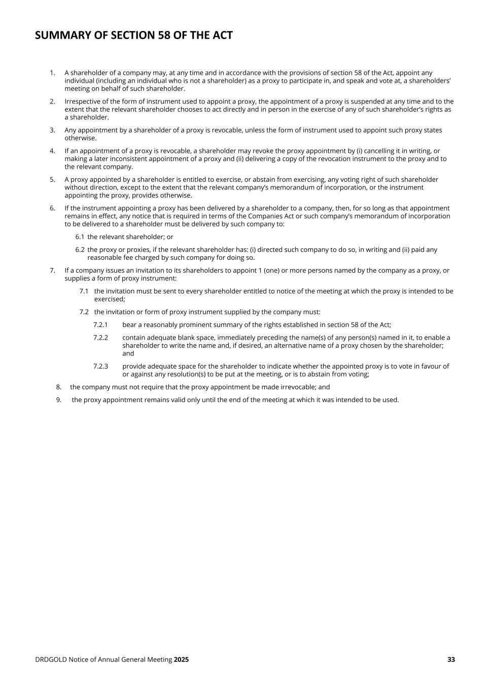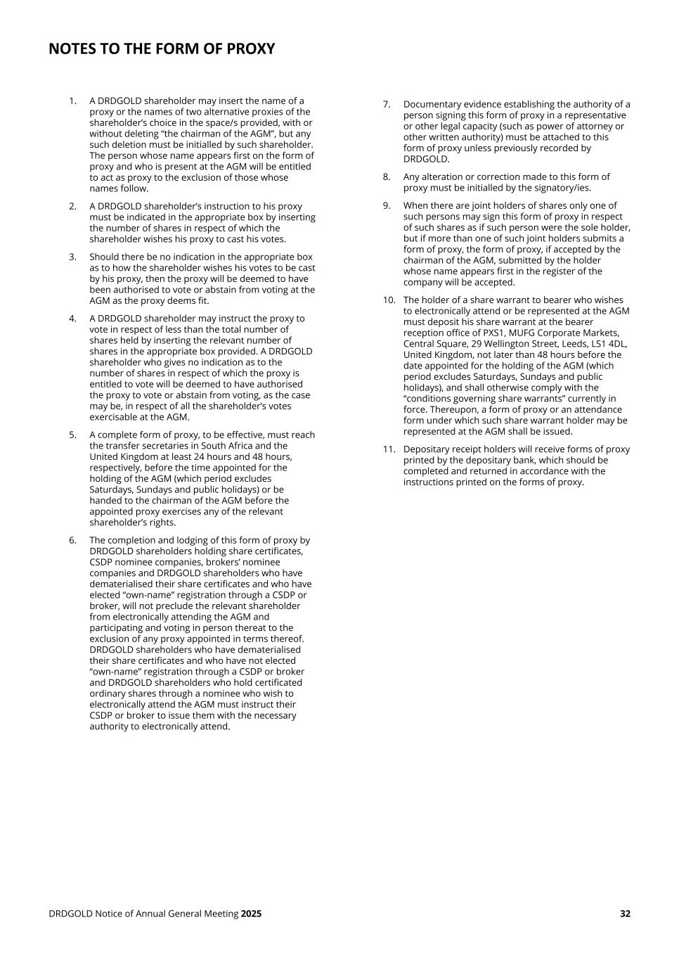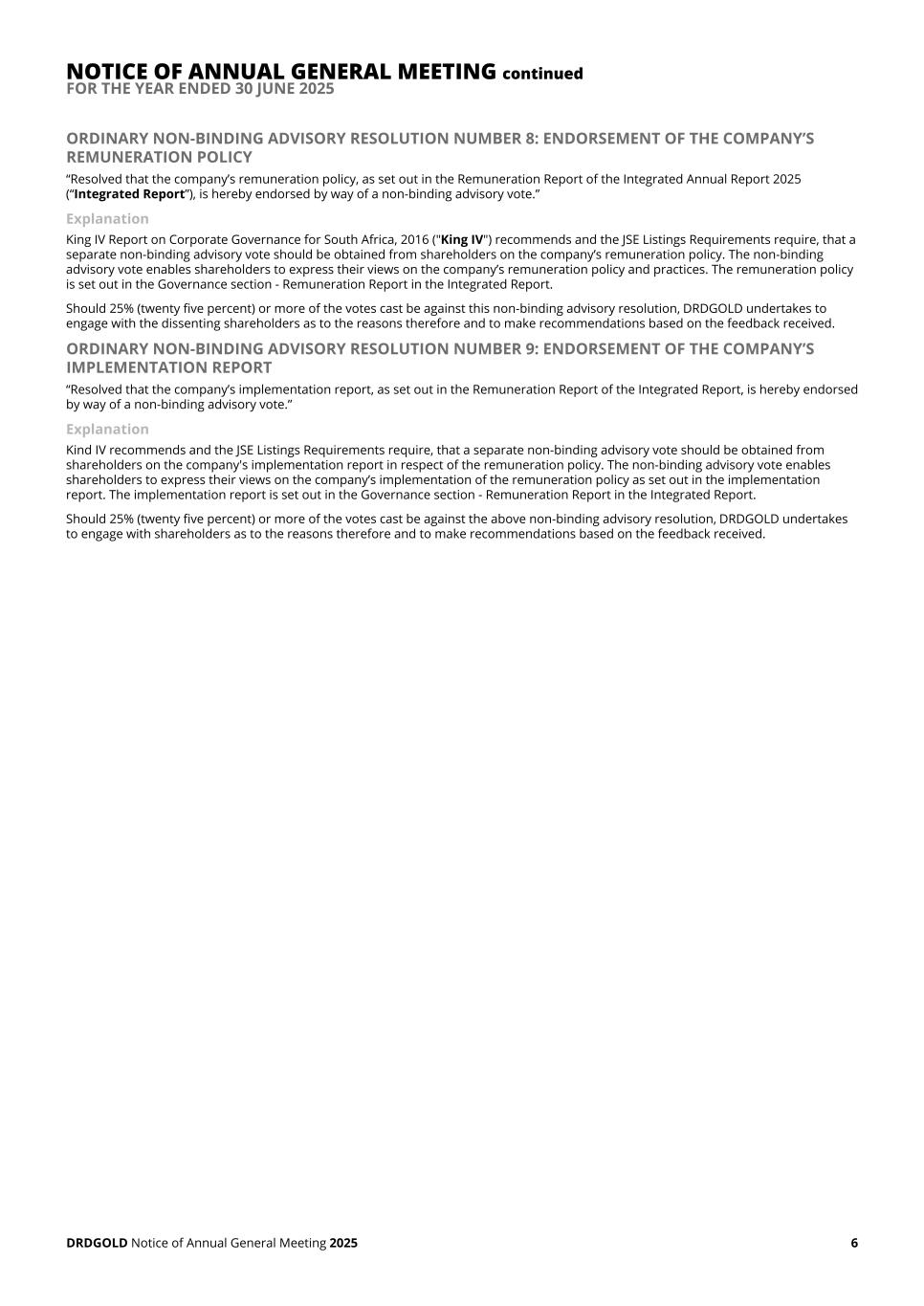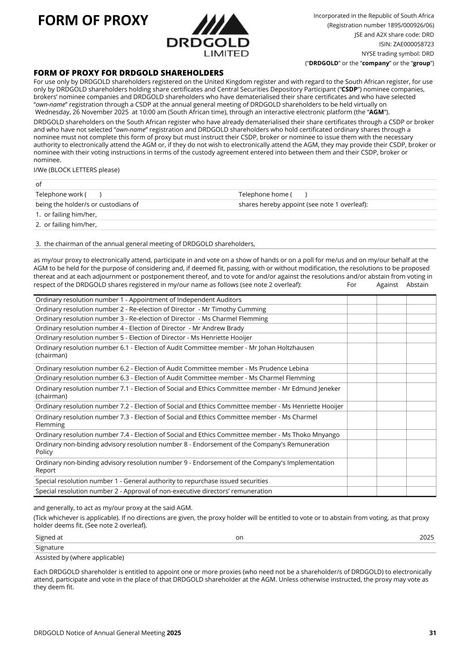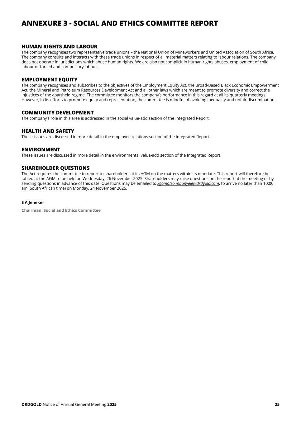 OFFICES Registered and corporate Constantia Office Park Cnr 14th Avenue and Hendrik Potgieter Road Cycad House, Building 17, Ground Floor Weltevreden Park 1709, Johannesburg, South Africa PO Box 390, Maraisburg, 1700 South Africa Tel: +27 11 470 2600 Fax: +27 86 524 3061 OPERATIONS Ergo Mining Proprietary Limited PO Box 12442 Selcourt 1567 Springs, South Africa Tel: +27 (0) 11 742 1003 Fax: +27 (0) 11 743 1544 Far West Gold Recoveries Proprietary Limited PO Box 390 Maraisburg, 1700 South Africa Tel: +27 (0) 10 822 8440 Fax: +27 (0) 86 524 3061 DIRECTORS Timothy Cumming Non-executive Chairman 2,3,#4,6 Niël Pretorius Chief Executive Officer 2 Riaan Davel Chief Financial Officer Henriette Hooijer 5 Chief Financial Officer Designate Johan Holtzhausen Independent Non-executive Director#1,3,4,6 Edmund Jeneker Lead Independent Non-executive Director #3,4,#5,6 Andrew Brady Non-executive Director 2,6 Prudence Lebina Independent Non-executive Director 1,#2,3,4,#6 Thoko Mnyango Independent Non-executive Director 2,,4,5 Charmel Flemming Independent Non-executive Director 1,2,5 Company Secretary Kgomotso Mbanyele Committee memberships during 2025 # Denotes committee Chairman 1 Member of the Audit Committee 2 Member of the Risk Committee 3 Member of the Remuneration Committee 4 Member of the Nominations Committee 5 Member of the Social and Ethics Committee 6 Member of the Investment Committee INVESTOR AND MEDIA RELATIONS South Africa Jane Kamau R&A Strategic Communications Tel: +27 11 880 3924 Fax: +27 11 880 3788 Email: jane@rasc.co.za United Kingdom/Europe Phil Dexter St James’s Corporate Services Limited Suite 31, Second Floor 107 Cheapside London EC2V 6DN United Kingdom Tel: +44 (0) 20 7796 8644 Fax: +44 (0) 20 7796 8645 Mobile: +44 (0) 7798 634 398 Email: phil.dexter@corpserv.co.uk STOCK EXCHANGE LISTINGS JSE Ordinary shares Share Code: DRD ISIN: ZAE000058723 NYSE ADRs Trading Symbol: DRD CUSIP: 26152H301 DRDGOLD’s ordinary shares are listed on the JSE and on the NYSE, in the form of ADRs. The Company’s shares are also traded on A2X, the Regulated Unofficial Market on the Frankfurt Stock Exchange, and the Berlin and Stuttgart OTC markets. SHARE TRANSFER SECRETARIES South Africa JSE Investor Services One Exchange Square, 2 Gwen Ln, Sandown, Sandton, 2196 Johannesburg, South Africa Tel: +27 (0) 11 713 0800 Fax: +27 (0) 86 674 4381 United Kingdom (and bearer office) Link Market Asset Service PXS 1, Link Group Central Square 29 Wellington Street Leeds LS1 4DL United Kingdom Tel: +44(0) 371 664 0300 Australia Computershare Investor Service Proprietary Limited Level 17 221 St George’s Terrace Perth, WA 6000 Australia Tel: +61 8 9323 2000 Tel: 1300 55 2949 (in Australia) Fax: +61 8 9323 2033 ADR depositary J.P. Morgan Chase Bank N.A P.O. Box 64504 St. Paul, MN 55164-9804 United States of America Toll-free: +1 800 990 1135 Tel: +1 615 453 2128 GENERAL JSE sponsor One Capital Auditor BDO South Africa Inc. Attorneys ENSafrica Inc. Malan Scholes Mendelow Jacobs Linklaters LLP Bankers ABSA Capital Standard Bank of South Africa Limited Website www.drdgold.com OVERVIEW STRATEGIC APPROACH OUR PERFORMANCE GOVERNANCE SUPPLEMENTARY INFORMATION Administration and contact details DRDGOLD Annual Integrated Report 2025 146