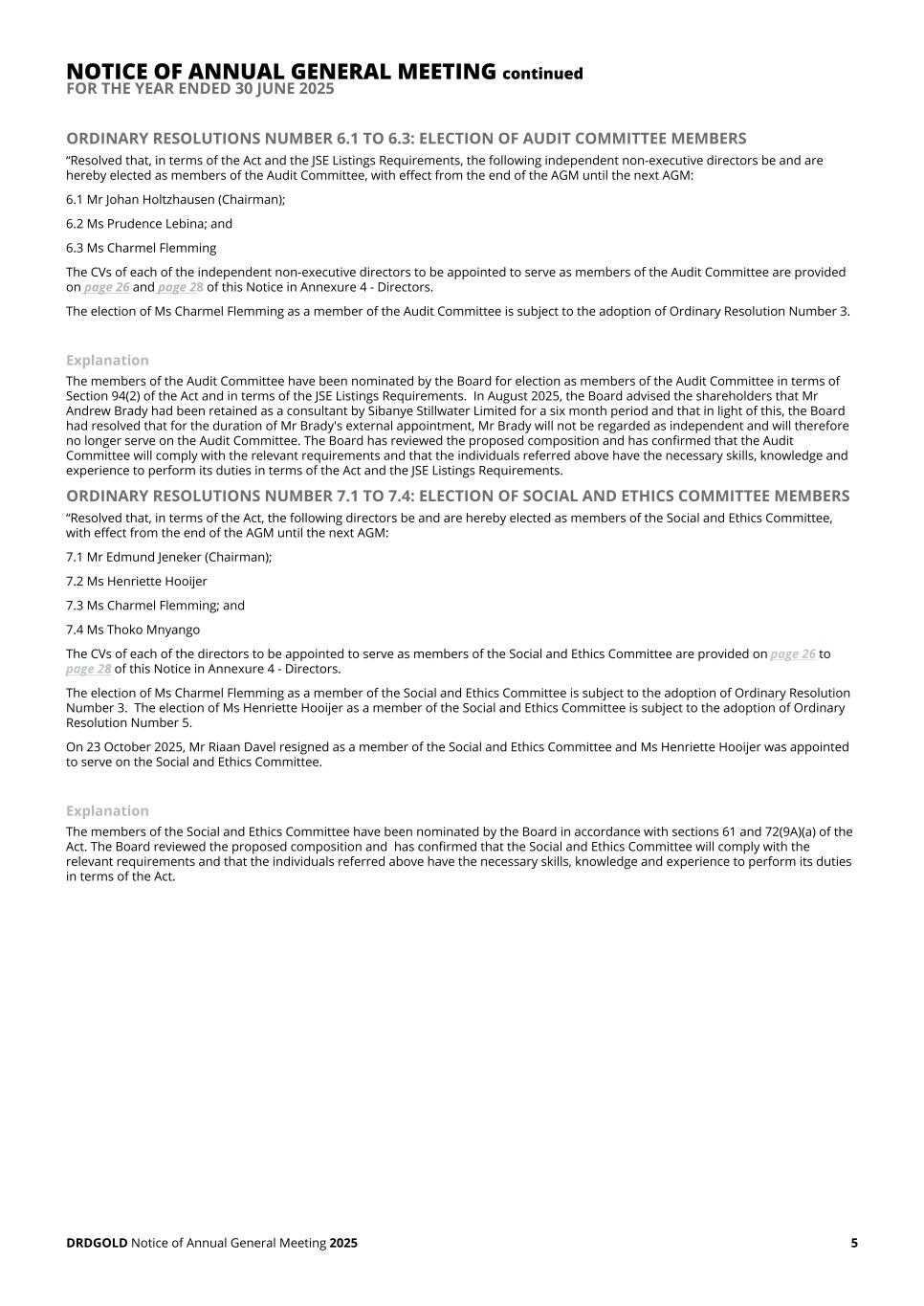 Non-executive Directors continued Andrew Brady (50) BCom, Post Graduate Diploma in Business Administration Non-executive Director • Member: Investment Committee and Risk Committee Andrew Brady was appointed as an independent non-executive director on 1 December 2024 and became a non-executive Director on 19 August 2025. Andrew has more than 25 years of resource sector corporate finance and business development experience. Andrew is currently an executive director of Clean World Capital, a corporate advisory and investment company. Prior to this, he was Senior Vice President Business Development at Sibanye Stillwater Limited, a global precious metals company, covering the gold, platinum group metals and battery metal sectors. He was also a founding shareholder and Managing Director of Qinisele Resources, an independent boutique resources advisory business. Over a period of twelve years, Qinisele Resources played a leading role in the restructuring and consolidation of both the gold and platinum group metals industries in South Africa. He has advised international mining companies on investment into South Africa and South African mining companies on their international expansion strategies. Andrew has an extensive resource and banking sector network. Prudence Lebina (44) Charmel Flemming (42) BCom, Higher Diploma (Accounting), Certificate in Business Leadership, CA (SA) BAcc (Hons), CA (SA) Independent Non-executive Director Independent Non-executive Director • Chairperson: Investment Committee and Risk Committee • Member: Audit Committee, Nominations Committee and Remuneration Committee • Member: Audit Committee; Risk Committee and Social and Ethics Committee Prudence Lebina was appointed independent non-executive director on 3 May 2019. She's a chartered accountant with over 20 years' working experience in corporate finance, business development, financial reporting and stakeholder management in the mining and financial services sectors. Prudence is CEO of TriAlpha Investment Management Proprietary Limited, a specialist fixed income investment house managing local and international fixed income portfolios for institutional clients. She was previously CEO and Interim Finance Director of Mahube Infrastructure Limited (previously GAIA Infrastructure Capital Limited) listed on the Main Board of JSE Limited. Prudence is also an independent non-executive of Telkom SA SOC Limited. Charmel Flemming, appointed as an independent non-executive director on 1 August 2020 is the Founder and CEO of FTwelve, a boutique cloud-based accounting firm. She previously held positions at Acorn Agri & Food Limited, MixTelematics, KPMG and De Beers. Ms Flemming served as a non-executive director for Acorn Agri & Food Limited and MixTelematics and as a trustee on the boards of both the De Beers Benefit Society Medical Aid and De Beers Pension Fund from 2014 to 2018. She is a qualified Chartered Accountant and non-executive director serving on JSE-listed boards and an advocate for diversity in the financial industry and inclusivity in the boardroom. INTRODUCING DRDGOLD STRATEGIC APPROACH OUR PERFORMANCE GOVERNANCE SUPPLEMENTARY INFORMATION Directors and management continued DRDGOLD Annual Integrated Report 2025 97