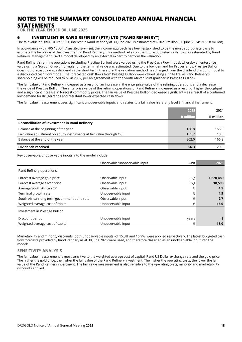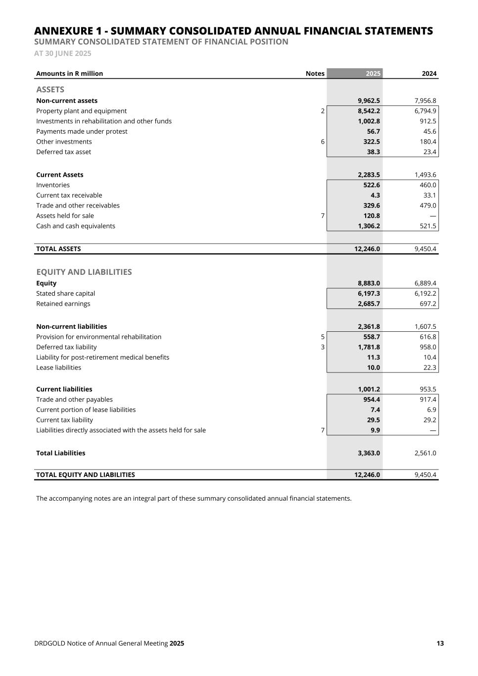 Finance income/(expense) – net Finance income decreased from R280.8 million to R223.8 million, as a result of the decrease in cash and cash equivalents held during the year to fund the capital expansion programme at both operations. Finance expense decreased from R76.4 million to R73.4 million. Included in the finance expense is the unwinding of provision for environmental rehabilitation of R58.6 million compared to R56.3 million in FY2024. Income tax Both Ergo and FWGR were not in a tax-paying position in the current year due to the higher capital expenditure, which reduced taxable income through accelerated capital allowances. Consequently, deferred tax increased from R388.5 million to R824.4 million. The forecast weighted average tax rate of Ergo has remained at 25% for FY2025 and the forecast weighted average tax rate for FWGR has remained at 29% for FY2025. Summarised group statement of financial position 2025 2024 Rm Rm Non-current assets Property, plant and equipment 8 542.2 6 794.9 Investments in rehabilitation obligation funds and other funds 1 002.8 912.5 Other non-current assets 1 379.2 226.0 Deferred tax asset 38.3 23.4 Current assets Inventories 522.6 460.0 Current tax receivable 4.3 33.1 Trade and other receivables 329.6 479.0 Assets held for sale 120.8 — Cash and cash equivalents 1 306.2 521.5 Total assets 12 246.0 9 450.4 Equity 8 883.0 6 889.4 Non-current liabilities Provision for environmental rehabilitation 558.7 616.8 Deferred tax liability 1 781.8 958.0 Liability for post-retirement medical benefits 11.3 10.4 Non-current portion of lease liabilities 10.0 22.3 Current liabilities Trade and other payables 964.3 917.4 Other current liabilities 2 37.0 36.1 Liabilities directly associated with the assets held for sale 9.9 — Total equity and liabilities 12 246.0 9 450.4 1 Includes payments made under protest and investments in other entities of R56.7 million (FY2024: R45.6 million) and R322.5 million (FY2024: R180.4 million) respectively. 2 Includes current portion of lease liabilities of R7.4 million (FY2024: R6.9 million) and current tax liabilities of R29.5 million (FY2024: R29.2 million). Property, plant and equipment Capital additions for the year amounted to R2 199.9 million as the Group progresses with its capital expansion programme at Ergo and FWGR. This is a decrease from FY2024 (R3 113.9 million), due to the commissioning of the solar plant and battery energy storage system in November 2024. More information on the capital projects is provided in the Operational performance section on pages 71 to 72. Investments in rehabilitation obligation funds and other funds Rehabilitation obligation funds The use of the funds in the Guardrisk cell captive is restricted and may only be used for environmental rehabilitation activities within the DRDGOLD group of companies. The increase is attributable to interest earned. Other funds The increase in the balance is attributable to interest earned on the other funds held in the Guardrisk cell captive. Other non-current assets Included in non-current assets are equity investments at fair value through other comprehensive income of R322.5 million (FY2024: R180.4 million). This is comprised mainly of DRDGOLD’s 11.3% interest in Rand Refinery Proprietary Limited, the fair value of which was estimated at R302.0 million on 30 June 2025 compared to R166.8 million at 30 June 2024. The fair value is estimated using the income approach and discounted cash flow method, with both observable and non-observable inputs. The increase is due mainly to an increase in the enterprise value of the refining operations of Rand Refinery. The enterprise value of the refining operations of Rand Refinery increased as a result of higher throughput and a significant increase in forecast commodity prices. INTRODUCING DRDGOLD STRATEGIC APPROACH OUR PERFORMANCE GOVERNANCE SUPPLEMENTARY INFORMATION Chief Financial Officer's review continued DRDGOLD Annual Integrated Report 2025 67