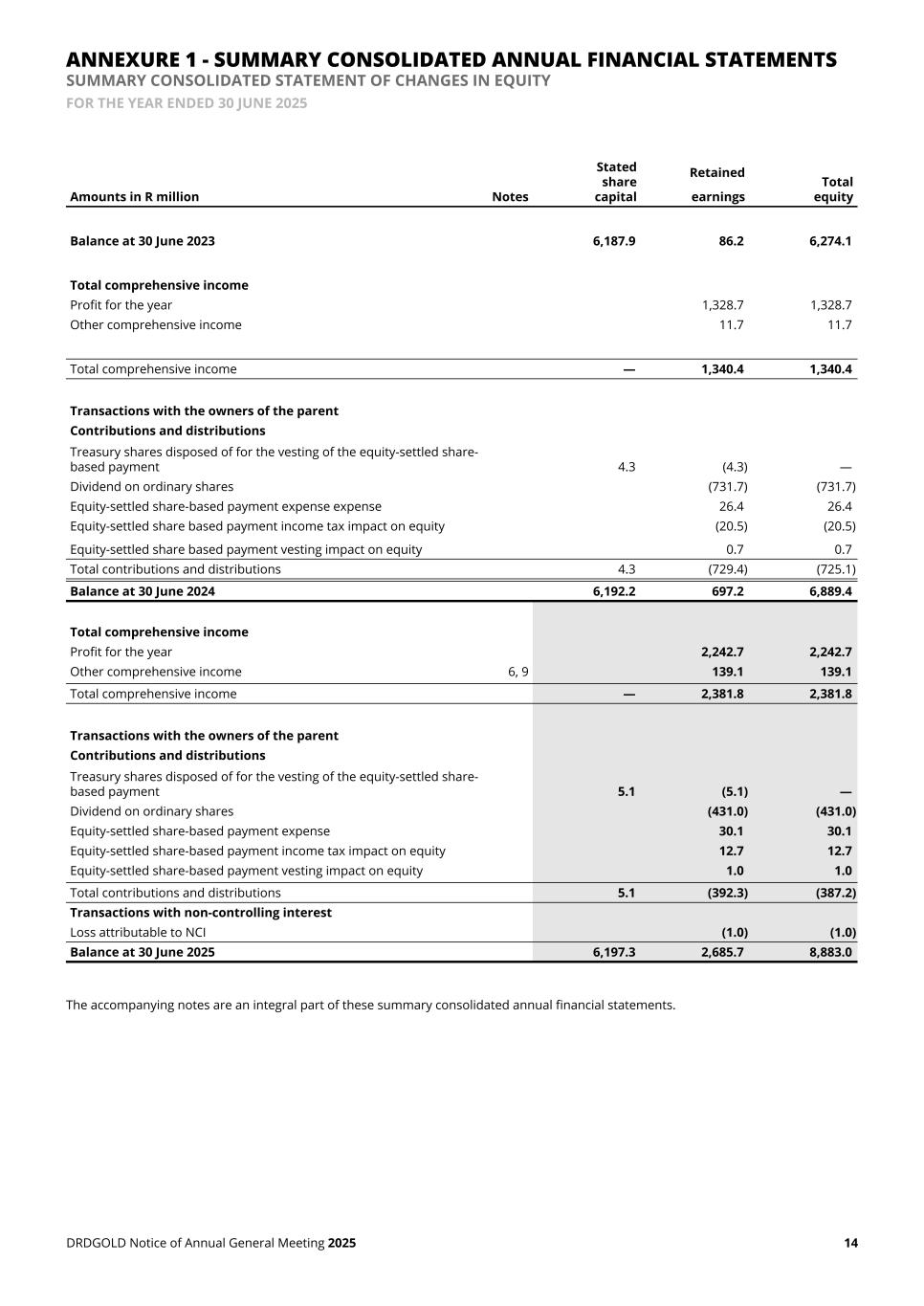 Inventories Included in inventories is R285.0 million relating to consumable stores (FY2024: R250.7 million), R137.8 million of gold bullion (FY2024: R105.6 million), R65.8 million gold in process (FY2024: R79.9 million) and R33.9 million ore stockpiles (FY2024: R23.8 million). Trade and other receivables Included in trade and other receivables are prepayments made towards capital projects of R163.0 million (FY2024: R123.5 million), R93.9 million of VAT receivable (FY2024: R273.3 million) and other receivables of R72.7 million (FY2024: R82.2 million). Assets held for sale In November 2023, Ergo purchased a 50.25% interest in Stellar Energy Solutions Proprietary Limited (Stellar), a renewable energy company with a project to develop a 150MW solar plant in Polokwane, Limpopo. Ergo also extended funding to develop the project to financial close. Following a strategic review, the Board decided to sell Ergo's shareholding in Stellar to focus on the Group's core mining activities. There is an ongoing active sale process, expected to be concluded during FY2026. Subsequent to year-end, Ergo issued a conversation notice to convert its loan into equity, which will increase its shareholding to 89.94%. Cash and cash equivalents Cash and cash equivalents increased by R784.7 million (FY2024: decreased by R1 948.1 million) after paying dividends of R431.0 million (FY2024: R731.7 million), capital expenditure of R2 254.9 million (FY2024: R2 985.7 million) and receiving income tax of R25.7 million (FY2024: paid income tax of R72.5 million). Provisions for environmental rehabilitation The provision for environmental rehabilitation decreased by R58.1 million to R558.7 million as a result of the following: • Change in estimate recognised in profit or loss of R98.0 million, reducing the liability as a result of Crown Complex being classified as a Mineral Reserve and now included in the Life of Mine, resulting in a change in its rehabilitation methodology, from in situ to red earth footprint rehabilitation. • Change in estimate recognised in property, plant and equipment of R7.4 million, increasing the provision, which takes into account inflationary increases in rehabilitation costs and the expansion of FWGR infrastructure. • Payments of R26.1 million (FY2024: R24.7 million) made for vegetation of 40ha of the Brakpan TSF and 4.4ha of the Driefontein 4 TSF decreasing the provision. • Unwinding of R58.6 million (FY2024: R56.3 million) was recognised increasing the provision. Deferred tax liability The deferred tax liability increased mainly due to the acquisition of property, plant and equipment that has been fully claimed as accelerated capital deductions for income tax. The forecast weighted average deferred tax rate of Ergo has remained at 25% for FY2025, and the forecast weighted average tax rate for FWGR has remained at 29% for FY2025. Trade and other payables The increase in trade and other payables is a result of an increase in provisions and accruals. The current ratio has increased from 1.6:1 in FY2024 to 2.3:1 in FY2025. Summarised group statement of cash flows 2025 2024 Rm Rm Net cash inflow from operating activities 3 511.1 1 845.2 Net cash outflow from investing activities (2 283.3) (3 042.6) Net cash outflows from financing activities (443.1) (750.7) Net decrease in cash and cash equivalents 784.7 (1 948.1) Effect of exchange rate fluctuations on cash — (1.7) Cash and cash equivalents at the beginning of the year 521.5 2 471.4 Cash and cash equivalents at the end of the year 1 306.2 521.5 Included in net cash flows from operating activities: Working capital changes 79.0 (123.8) Trade and other receivables 110.4 (296.2) Payment made under protest (6.6) (12.8) Consumable stores and stock piles (48.3) (12.9) Trade and other payables 23.5 198.1 Net cash flows from operating activities Free cash inflow was R1 227.9 million compared with free cash outflow of R1 197.4 million in FY2024, primarily driven by an increase in cash generated from operations, supported by an increase in the Rand gold price. Net cash flows from investing activities Net cash flow from investing activities comprises capital expenditure of R2 254.9 million (FY2024: R2 985.7 million) and environmental payments to reduce decommissioning liabilities of R26.1 million (FY2024: R23.4 million). Working capital changes Working capital changes amounted to a cash inflow of R79.0 million in comparison with a cash outflow of R123.8 million in the previous year, mainly as a result of a decrease in trade and other receivables after VAT input from the import of the battery storage system was received from SARS and an increase in trade and other payables balance at year-end. Free cash flow (Rm) 1 126.8 871.6 469.1 (1 197.4) 1 227.9 Free cash flow (Rm) 2021 2022 2023 2024 2025 -1600 -1200 -800 -400 0 400 800 1200 1 It is calculated by deducting cashflow from investing activities from cashflow from operating activities. Capital spend Rm 2021 395.7 2022 584.1 2023 1 145.2 2024 2 985.7 2025 2 254.8 Outlook Our production guidance for FY2026 is between 140 000 ounces and 150 000 ounces of gold at cash operating costs of approximately R995 000/kg. To achieve Vision 2028, the planned total capital growth investment forecast for the medium-term is around R7.8 billion. Riaan Davel / Chief Financial Officer 28 October 2025 INTRODUCING DRDGOLD STRATEGIC APPROACH OUR PERFORMANCE GOVERNANCE SUPPLEMENTARY INFORMATION Chief Financial Officer's review continued DRDGOLD Annual Integrated Report 2025 68 (1)