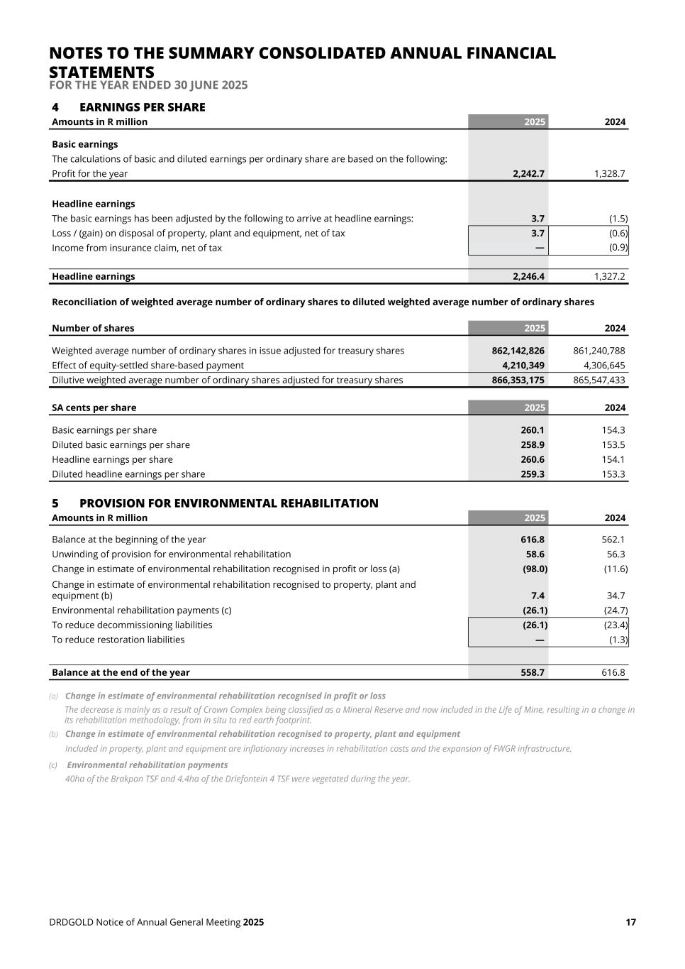 What we achieve Outcomes Financial capital Human resources Natural resources • After starting with cash on hand of R521.5 million, we generated R3 511.1 million of net cash inflow from operating activities aided by the high gold price received and re- invested R2 254.9 million in manufactured capital for the repositioning of our business to Vision 2028. Free cash flows generated: R1 227.9 million (FY2024: free cash outflow of R1 197.4 million) • We had zero fatality at our operations (FY2024: one fatality) • As a result of depletion due to mining activities at the end of FY2025, we decreased our: • Mineral Resources to 6.27Moz • Mineral Reserves to 5.85Moz We classified the Crown Complex TSF from a Mineral Resource to a Mineral Reserve and included it in Ergo's life of mine. The Daggafontein TSF was removed from the Mineral Resource Statement as it has been designated as a deposition site. Grootvlei dumps were removed from the Mineral Resource Statement as common law ownership could not be secured. A new dump 4L39 has been added and classified as a Mineral Reserve, included in the Ergo life of mine • Operating profit: R3 523.6 million (FY2024: R2 081.3 million) aided by the high gold price and reflecting reduced production from Ergo as it enters its new phase of mining lower grade material • Safety performance – LTIFR of 1.63 and RIFR of 0.81 per million hours worked (FY2024: 1.15 and 0.46 respectively) • 41 792 MWh surplus solar energy delivered into the Eskom grid • Headline earnings per share and dividend yield: 260.6 cents and 2.9% respectively (FY2024: 154.1 cents and 2.5% respectively) • HDP employees in managerial and supervisory positions: 79% (FY2024: 78%) • Scope 2 GHG emissions declined to 293 863t CO2e (FY2024: 316 393t CO2e) • Market capitalisation at 30 June 2025: R20.5 billion (FY2024: R14 billion) • Women employees: 27% of workforce (FY2024: 25%) • Potable water consumption only 4% of total water consumption (FY2024: 3%) • Dividends declared in respective of FY2025: 70 cents per share (FY2024:40 cents per share) • Dust samples from our operations exceeding legal limits contained to 2.10% of total samples taken (FY2024: 0.45%) enabling us to also deliver into social capital to improve the quality of lives of our surrounding communities • 41ha of land cleared by the authorities in FY2025, bringing total land restored in the past 10 years to 520ha. In addition, the rise in applications to the NNR for rehabilitated land from 41ha in FY2024 to 76ha is a direct result of completing rehabilitation activities at several Ergo sites, allowing us to move forward with the final clean-up efforts in preparation for closure • We are currently partnering with a property development company to develop approximately 90ha of rehabilitated land for mixed use over an estimated period of 3-5 years as part of our social capital value add to unlock previously sterilised land for residential use INTRODUCING DRDGOLD STRATEGIC APPROACH OUR PERFORMANCE GOVERNANCE SUPPLEMENTARY INFORMATION Business model continued DRDGOLD Annual Integrated Report 2025 58