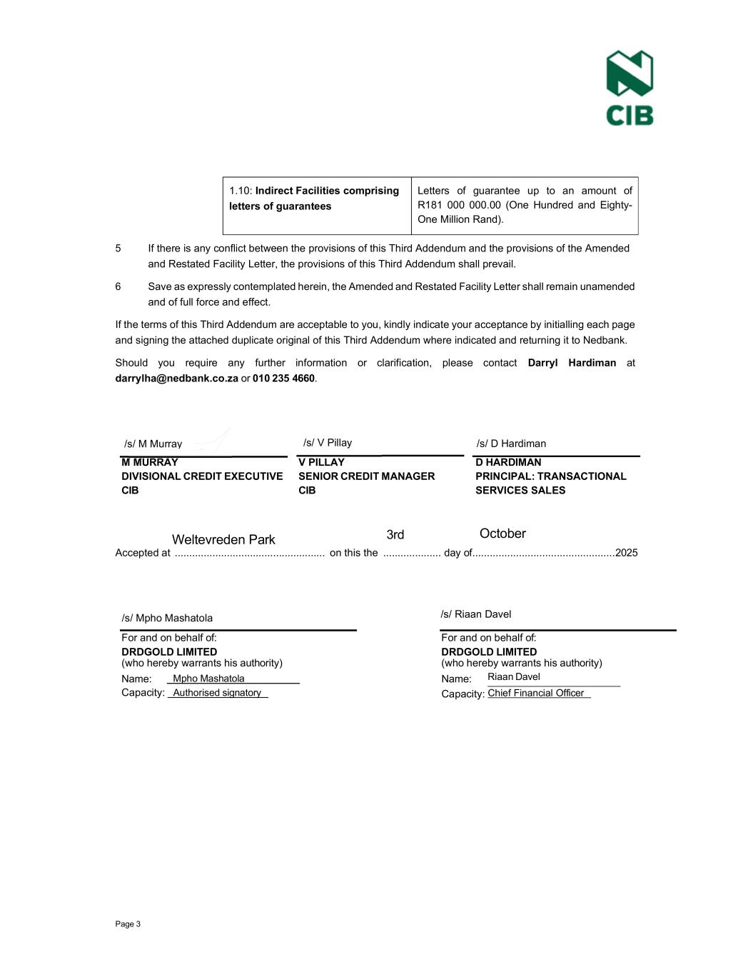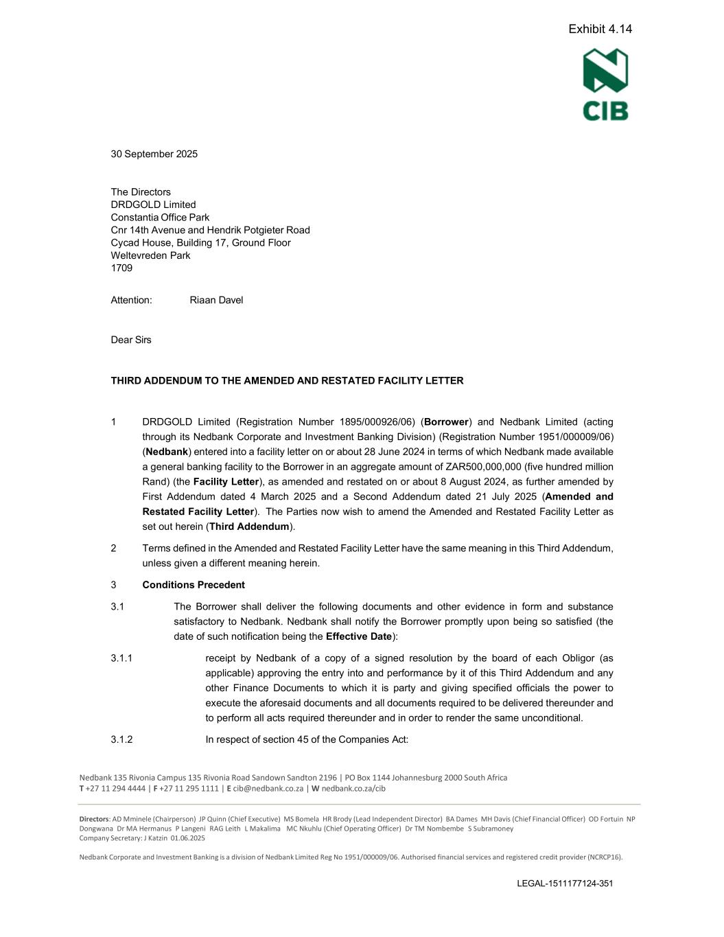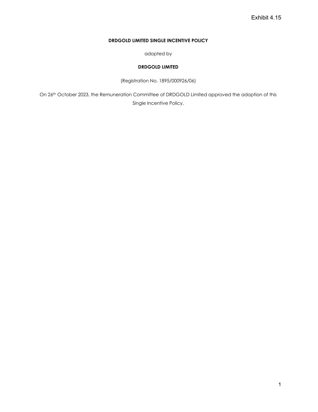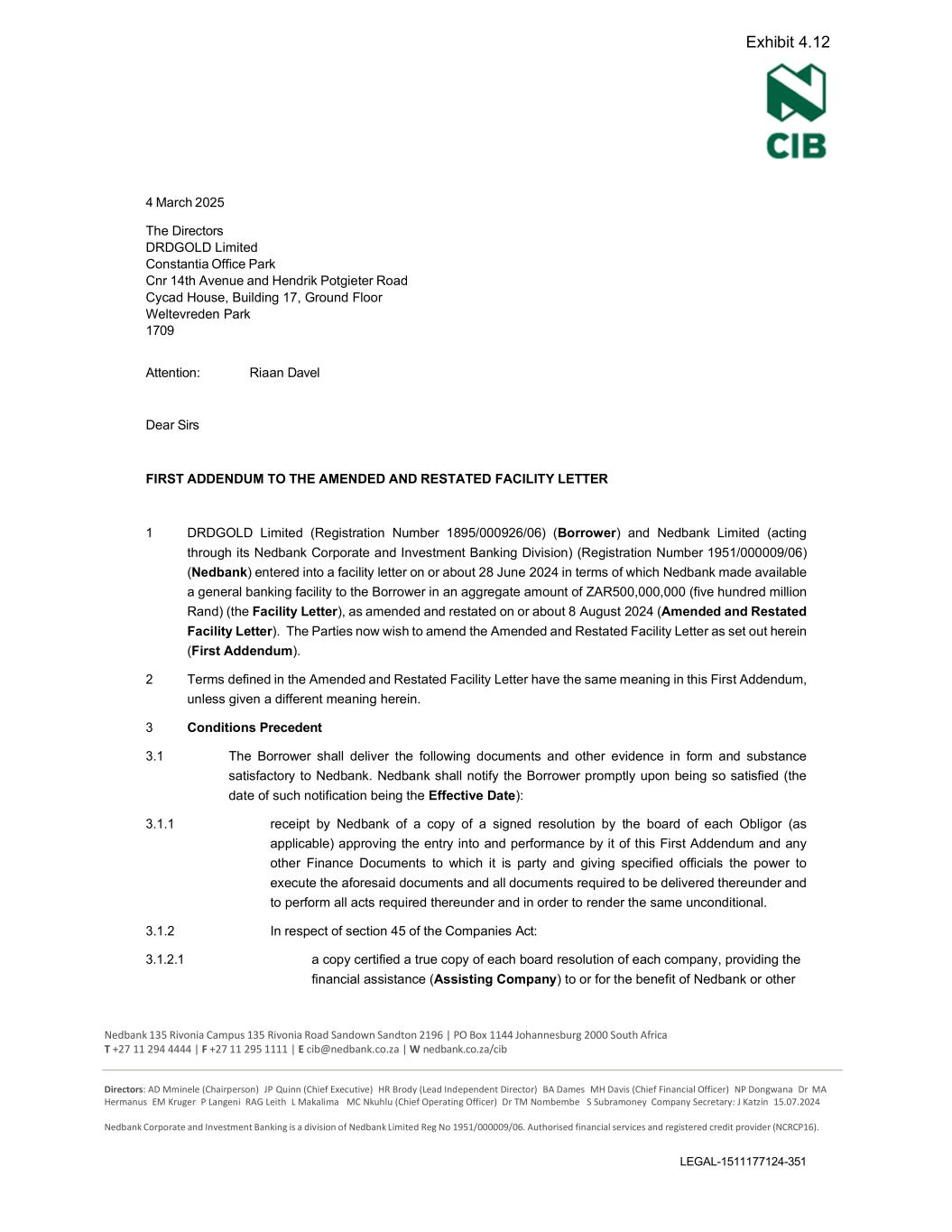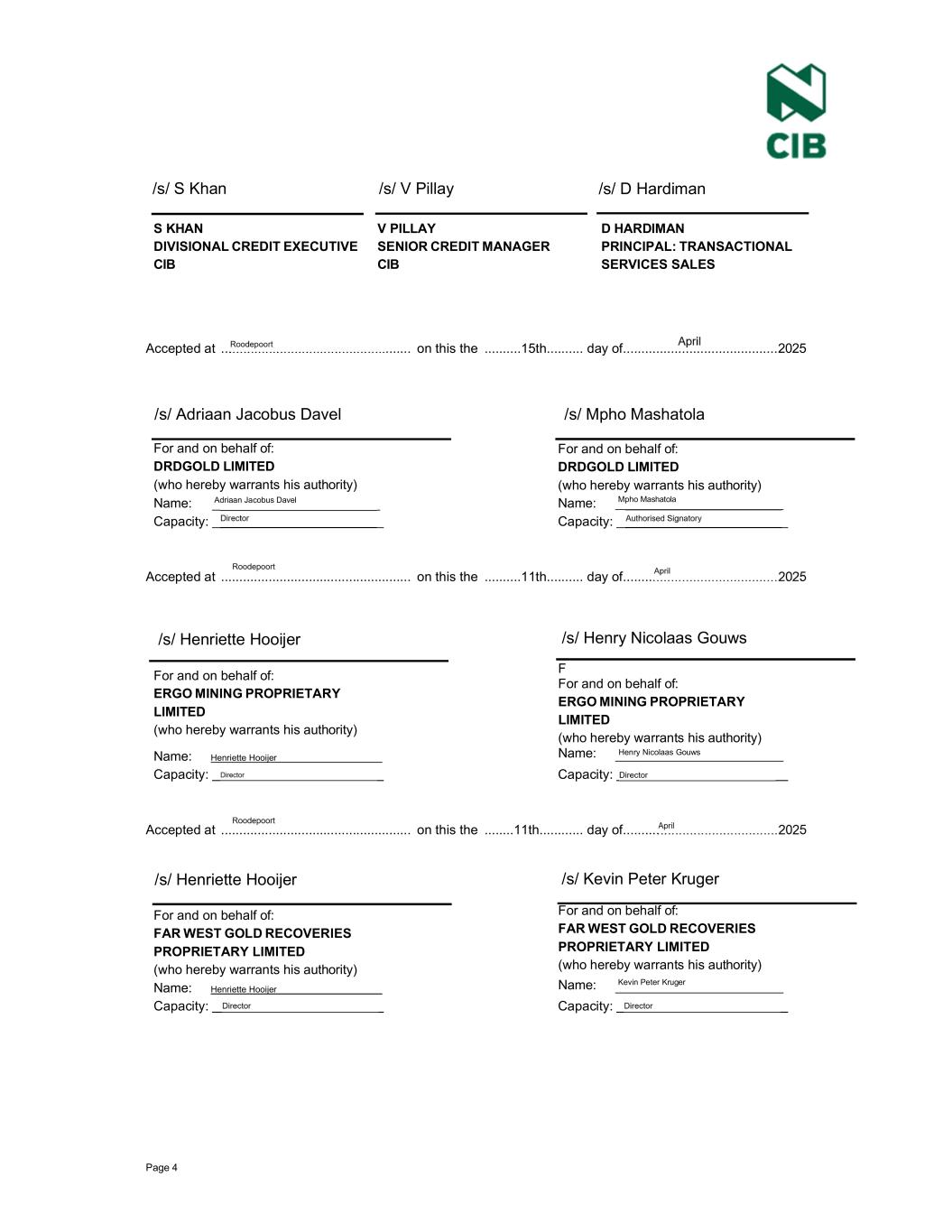 DRDGOLD has an American Depositary Receipt facility. In connection with this facility, DRDGOLD is party to a Deposit Agreement, dated as of August 12, 1996, as amended and restated as of July 23, 2007, and as further amended and restated as of May 16, 2025, among DRDGOLD, JPMorgan Chase Bank, N.A. (JPMorgan), as Depositary, and all owners and holders from time to time of American Depositary Receipts issued thereunder.