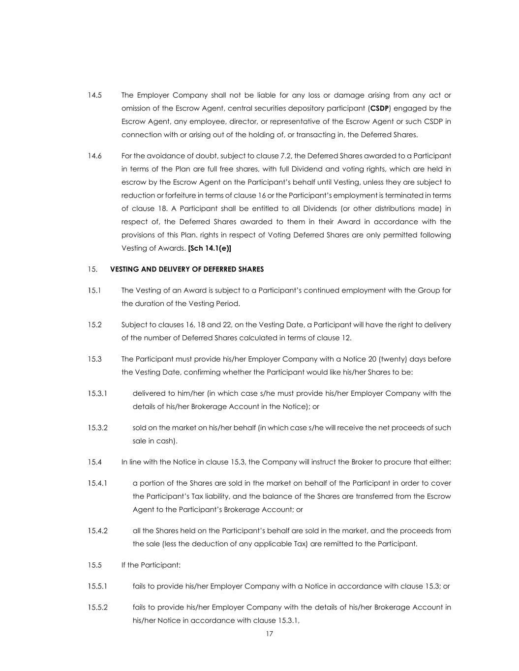 Notwithstanding anything to the contrary contained in the Deposit Agreement or any ADRs, the Depositary shall not be responsible for, and shall incur no liability in connection with or arising from, any act or omission to act on the part of the custodian except to the extent that any registered ADR holder has incurred liability directly as a result of the custodian having (i) committed fraud or wilful misconduct in the provision of custodial services to the Depositary or (ii) failed to use reasonable care in the provision of custodial services to the Depositary as determined in accordance with the standards prevailing in the jurisdiction in which the custodian is located. The Depositary and the custodian(s) may use third party delivery services and providers of information regarding matters such as pricing, proxy voting, corporate actions, class action litigation and other services in connection with the ADRs and the Deposit Agreement, and use local agents to provide extraordinary services such as attendance at annual meetings of issuers of securities. Although the Depositary and the custodian will use reasonable care (and cause their agents to use reasonable care) in the selection and retention of such third party providers and local agents, they will not be responsible for any errors or omissions made by them in providing the relevant information or services. The Depositary shall not have any liability for the price received in connection with any sale of securities, the timing thereof or any delay in action or omission to act nor shall it be responsible for any error or delay in action, omission to act, default or negligence on the part of the party so retained in connection with any such sale or proposed sale.