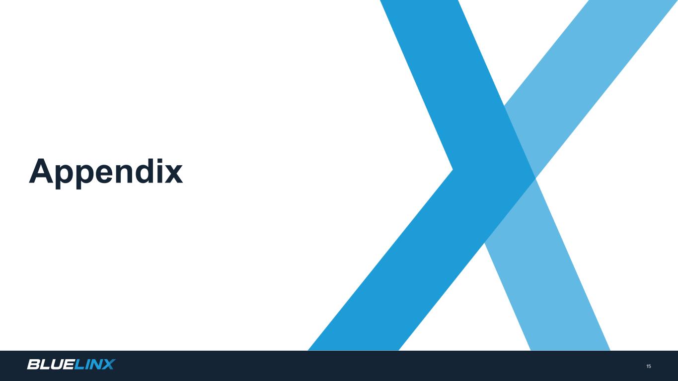 調整後純利益と調整後1株当たり利益。BlueLinxは、調整後純利益を、特定の非現金項目およびその他の特別項目を調整した純利益と定義しています。この特別項目には、株式報酬による費用、M&A活動に関連する弁護士費用、コンサルティング費用、専門家報酬、不動産売却損益、不動産繰延利益の償却費、退職金などのリストラ活動に関連する費用などが含まれます。BlueLinxは、調整後1株当たり利益(基本および/または希薄化後)を、その期間の調整後純利益を、表示された期間の加重平均発行済み株式数(基本および/または希薄化後)で割ったものと定義しています。
