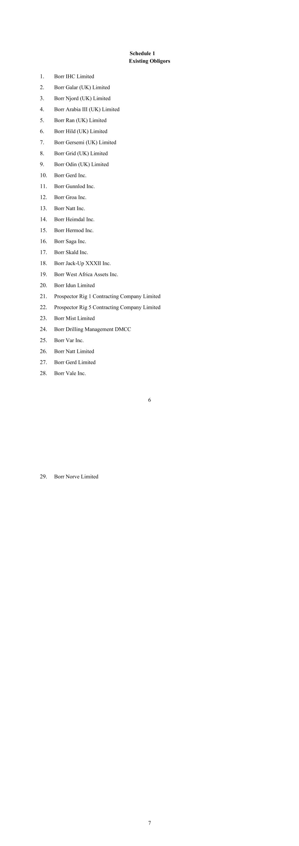 6 Schedule 1 Existing Obligors 1. Borr IHC Limited 2. Borr Galar (UK) Limited 3. Borr Njord (UK) Limited 4. Borr Arabia III (UK) Limited 5. Borr Ran (UK) Limited 6. Borr Hild (UK) Limited 7. Borr Gersemi (UK) Limited 8. Borr Grid (UK) Limited 9. Borr Odin (UK) Limited 10. Borr Gerd Inc. 11. Borr Gunnlod Inc. 12. Borr Groa Inc. 13. Borr Natt Inc. 14. Borr Heimdal Inc. 15. Borr Hermod Inc. 16. Borr Saga Inc. 17. Borr Skald Inc. 18. Borr Jack-Up XXXII Inc. 19. Borr West Africa Assets Inc. 20. Borr Idun Limited 21. Prospector Rig 1 Contracting Company Limited 22. Prospector Rig 5 Contracting Company Limited 23. Borr Mist Limited 24. Borr Drilling Management DMCC 25. Borr Var Inc. 26. Borr Natt Limited 27. Borr Gerd Limited 28. Borr Vale Inc. 7 29. Borr Norve Limited