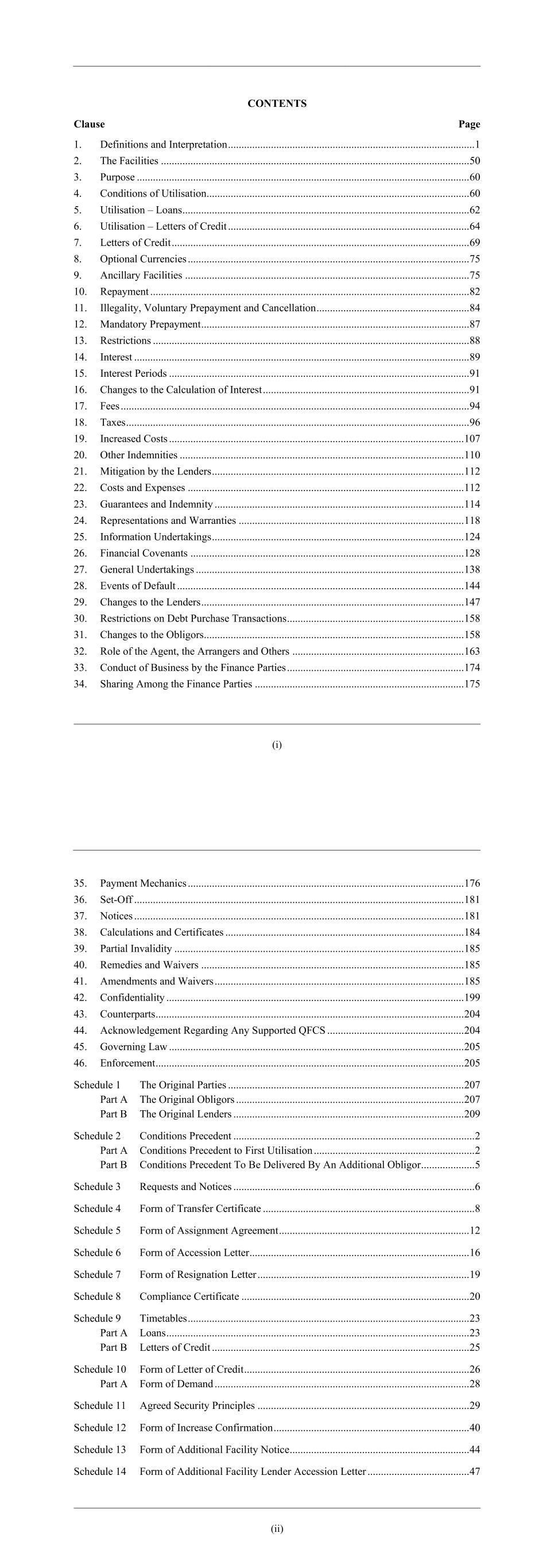 (i) CONTENTS Clause Page 1. Definitions and Interpretation ............................................................................................ 1 2. The Facilities ................................................................................................................... 50 3. Purpose ............................................................................................................................ 60 4. Conditions of Utilisation.................................................................................................. 60 5. Utilisation – Loans ........................................................................................................... 62 6. Utilisation – Letters of Credit .......................................................................................... 64 7. Letters of Credit ............................................................................................................... 69 8. Optional Currencies ......................................................................................................... 75 9. Ancillary Facilities .......................................................................................................... 75 10. Repayment ....................................................................................................................... 82 11. Illegality, Voluntary Prepayment and Cancellation ......................................................... 84 12. Mandatory Prepayment .................................................................................................... 87 13. Restrictions ...................................................................................................................... 88 14. Interest ............................................................................................................................. 89 15. Interest Periods ................................................................................................................ 91 16. Changes to the Calculation of Interest ............................................................................. 91 17. Fees .................................................................................................................................. 94 18. Taxes ................................................................................................................................ 96 19. Increased Costs .............................................................................................................. 107 20. Other Indemnities .......................................................................................................... 110 21. Mitigation by the Lenders .............................................................................................. 112 22. Costs and Expenses ....................................................................................................... 112 23. Guarantees and Indemnity ............................................................................................. 114 24. Representations and Warranties .................................................................................... 118 25. Information Undertakings .............................................................................................. 124 26. Financial Covenants ...................................................................................................... 128 27. General Undertakings .................................................................................................... 138 28. Events of Default ........................................................................................................... 144 29. Changes to the Lenders .................................................................................................. 147 30. Restrictions on Debt Purchase Transactions.................................................................. 158 31. Changes to the Obligors................................................................................................. 158 32. Role of the Agent, the Arrangers and Others ................................................................ 163 33. Conduct of Business by the Finance Parties .................................................................. 174 34. Sharing Among the Finance Parties .............................................................................. 175 (ii) 35. Payment Mechanics ....................................................................................................... 176 36. Set-Off ........................................................................................................................... 181 37. Notices ........................................................................................................................... 181 38. Calculations and Certificates ......................................................................................... 184 39. Partial Invalidity ............................................................................................................ 185 40. Remedies and Waivers .................................................................................................. 185 41. Amendments and Waivers ............................................................................................. 185 42. Confidentiality ............................................................................................................... 199 43. Counterparts ................................................................................................................... 204 44. Acknowledgement Regarding Any Supported QFCS ................................................... 204 45. Governing Law .............................................................................................................. 205 46. Enforcement ......................................................................