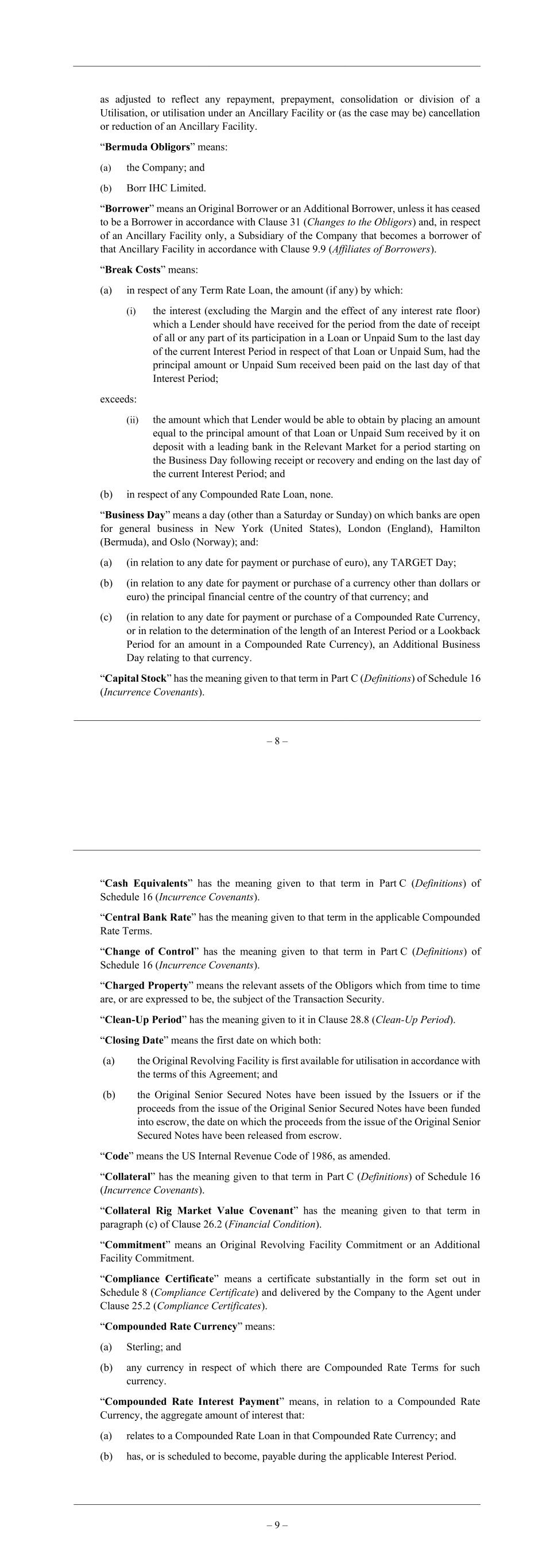 – 8 – as adjusted to reflect any repayment, prepayment, consolidation or division of a Utilisation, or utilisation under an Ancillary Facility or (as the case may be) cancellation or reduction of an Ancillary Facility. “Bermuda Obligors” means: (a) the Company; and (b) Borr IHC Limited. “Borrower” means an Original Borrower or an Additional Borrower, unless it has ceased to be a Borrower in accordance with Clause 31 (Changes to the Obligors) and, in respect of an Ancillary Facility only, a Subsidiary of the Company that becomes a borrower of that Ancillary Facility in accordance with Clause 9.9 (Affiliates of Borrowers). “Break Costs” means: (a) in respect of any Term Rate Loan, the amount (if any) by which: (i) the interest (excluding the Margin and the effect of any interest rate floor) which a Lender should have received for the period from the date of receipt of all or any part of its participation in a Loan or Unpaid Sum to the last day of the current Interest Period in respect of that Loan or Unpaid Sum, had the principal amount or Unpaid Sum received been paid on the last day of that Interest Period; exceeds: (ii) the amount which that Lender would be able to obtain by placing an amount equal to the principal amount of that Loan or Unpaid Sum received by it on deposit with a leading bank in the Relevant Market for a period starting on the Business Day following receipt or recovery and ending on the last day of the current Interest Period; and (b) in respect of any Compounded Rate Loan, none. “Business Day” means a day (other than a Saturday or Sunday) on which banks are open for general business in New York (United States), London (England), Hamilton (Bermuda), and Oslo (Norway); and: (a) (in relation to any date for payment or purchase of euro), any TARGET Day; (b) (in relation to any date for payment or purchase of a currency other than dollars or euro) the principal financial centre of the country of that currency; and (c) (in relation to any date for payment or purchase of a Compounded Rate Currency, or in relation to the determination of the length of an Interest Period or a Lookback Period for an amount in a Compounded Rate Currency), an Additional Business Day relating to that currency. “Capital Stock” has the meaning given to that term in Part C (Definitions) of Schedule 16 (Incurrence Covenants). – 9 – “Cash Equivalents” has the meaning given to that term in Part C (Definitions) of Schedule 16 (Incurrence Covenants). “Central Bank Rate” has the meaning given to that term in the applicable Compounded Rate Terms. “Change of Control” has the meaning given to that term in Part C (Definitions) of Schedule 16 (Incurrence Covenants). “Charged Property” means the relevant assets of the Obligors which from time to time are, or are expressed to be, the subject of the Transaction Security. “Clean-Up Period” has the meaning given to it in Clause 28.8 (Clean-Up Period). “Closing Date” means the first date on which both: (a) the Original Revolving Facility is first available for utilisation in accordance with the terms of this Agreement; and (b) the Original Senior Secured Notes have been issued by the Issuers or if the proceeds from the issue of the Original Senior Secured Notes have been funded into escrow, the date on which the proceeds from the issue of the Original Senior Secured Notes have been released from escrow. “Code” means the US Internal Revenue Code of 1986, as amended. “Collateral” has the meaning given to that term in Part C (Definitions) of Schedule 16 (Incurrence Covenants). “Collateral Rig Market Value Covenant” has the meaning given to that term in paragraph (c) of Clause 26.2 (Financial Condition). “Commitment” means an Original Revolving Facility Commitment or an Additional Facility Commitment. “Compliance Certificate” means a certificate substantially in the form set out in Schedule 8 (Compliance Certificate) and delivered by the Company to the Agent under Clause 25.2 (Compliance Certificates). “Compounded Rate Currency” means: (a) Sterling; and (b) any currency in respect of which there are Compounded Rate Terms for such currency. “Compounded Rate Interest Payment” means, in relation to a Compounded Rate Currency, the aggregate amount of interest that: (a) relates to a Compounded Rate Loan in that Compounded Rate Currency; and (b) has, or is scheduled to become, payable during the applicable Interest Period.