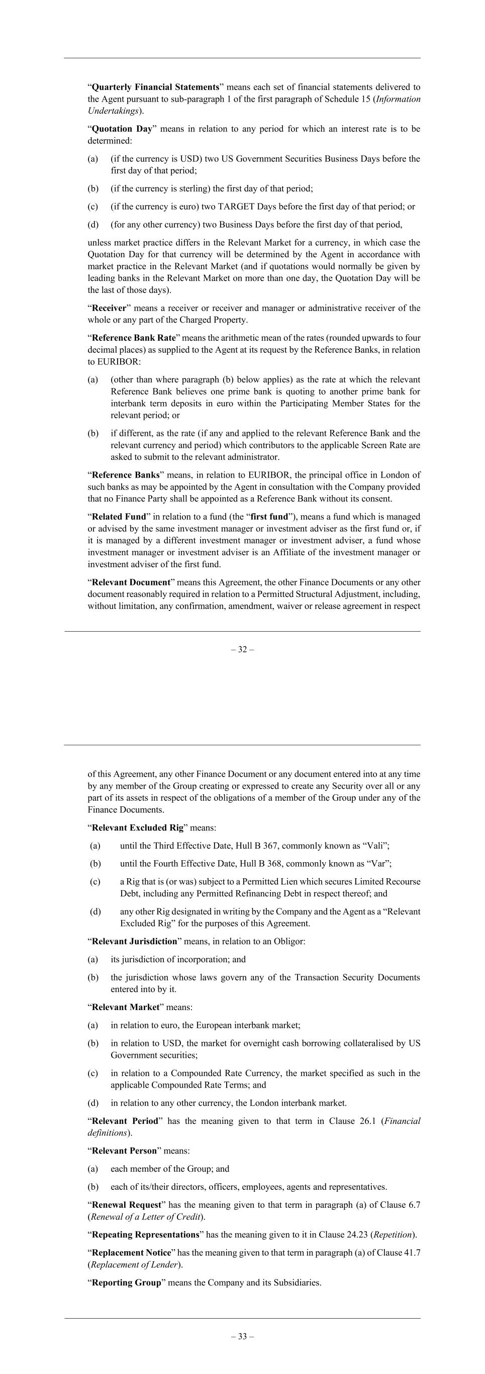 – 32 – “Quarterly Financial Statements” means each set of financial statements delivered to the Agent pursuant to sub-paragraph 1 of the first paragraph of Schedule 15 (Information Undertakings). “Quotation Day” means in relation to any period for which an interest rate is to be determined: (a) (if the currency is USD) two US Government Securities Business Days before the first day of that period; (b) (if the currency is sterling) the first day of that period; (c) (if the currency is euro) two TARGET Days before the first day of that period; or (d) (for any other currency) two Business Days before the first day of that period, unless market practice differs in the Relevant Market for a currency, in which case the Quotation Day for that currency will be determined by the Agent in accordance with market practice in the Relevant Market (and if quotations would normally be given by leading banks in the Relevant Market on more than one day, the Quotation Day will be the last of those days). “Receiver” means a receiver or receiver and manager or administrative receiver of the whole or any part of the Charged Property. “Reference Bank Rate” means the arithmetic mean of the rates (rounded upwards to four decimal places) as supplied to the Agent at its request by the Reference Banks, in relation to EURIBOR: (a) (other than where paragraph (b) below applies) as the rate at which the relevant Reference Bank believes one prime bank is quoting to another prime bank for interbank term deposits in euro within the Participating Member States for the relevant period; or (b) if different, as the rate (if any and applied to the relevant Reference Bank and the relevant currency and period) which contributors to the applicable Screen Rate are asked to submit to the relevant administrator. “Reference Banks” means, in relation to EURIBOR, the principal office in London of such banks as may be appointed by the Agent in consultation with the Company provided that no Finance Party shall be appointed as a Reference Bank without its consent. “Related Fund” in relation to a fund (the “first fund”), means a fund which is managed or advised by the same investment manager or investment adviser as the first fund or, if it is managed by a different investment manager or investment adviser, a fund whose investment manager or investment adviser is an Affiliate of the investment manager or investment adviser of the first fund. “Relevant Document” means this Agreement, the other Finance Documents or any other document reasonably required in relation to a Permitted Structural Adjustment, including, without limitation, any confirmation, amendment, waiver or release agreement in respect – 33 – of this Agreement, any other Finance Document or any document entered into at any time by any member of the Group creating or expressed to create any Security over all or any part of its assets in respect of the obligations of a member of the Group under any of the Finance Documents. “Relevant Excluded Rig” means: (a) until the Third Effective Date, Hull B 367, commonly known as “Vali”; (b) until the Fourth Effective Date, Hull B 368, commonly known as “Var”; (c) a Rig that is (or was) subject to a Permitted Lien which secures Limited Recourse Debt, including any Permitted Refinancing Debt in respect thereof; and (d) any other Rig designated in writing by the Company and the Agent as a “Relevant Excluded Rig” for the purposes of this Agreement. “Relevant Jurisdiction” means, in relation to an Obligor: (a) its jurisdiction of incorporation; and (b) the jurisdiction whose laws govern any of the Transaction Security Documents entered into by it. “Relevant Market” means: (a) in relation to euro, the European interbank market; (b) in relation to USD, the market for overnight cash borrowing collateralised by US Government securities; (c) in relation to a Compounded Rate Currency, the market specified as such in the applicable Compounded Rate Terms; and (d) in relation to any other currency, the London interbank market. “Relevant Period” has the meaning given to that term in Clause 26.1 (Financial definitions). “Relevant Person” means: (a) each member of the Group; and (b) each of its/their directors, officers, employees, agents and representatives. “Renewal Request” has the meaning given to that term in paragraph (a) of Clause 6.7 (Renewal of a Letter of Credit). “Repeating Representations” has the meaning given to it in Clause 24.23 (Repetition). “Replacement Notice” has the meaning given to that term in paragraph (a) of Clause 41.7 (Replacement of Lender). “Reporting Group” means the Company and its Subsidiaries.