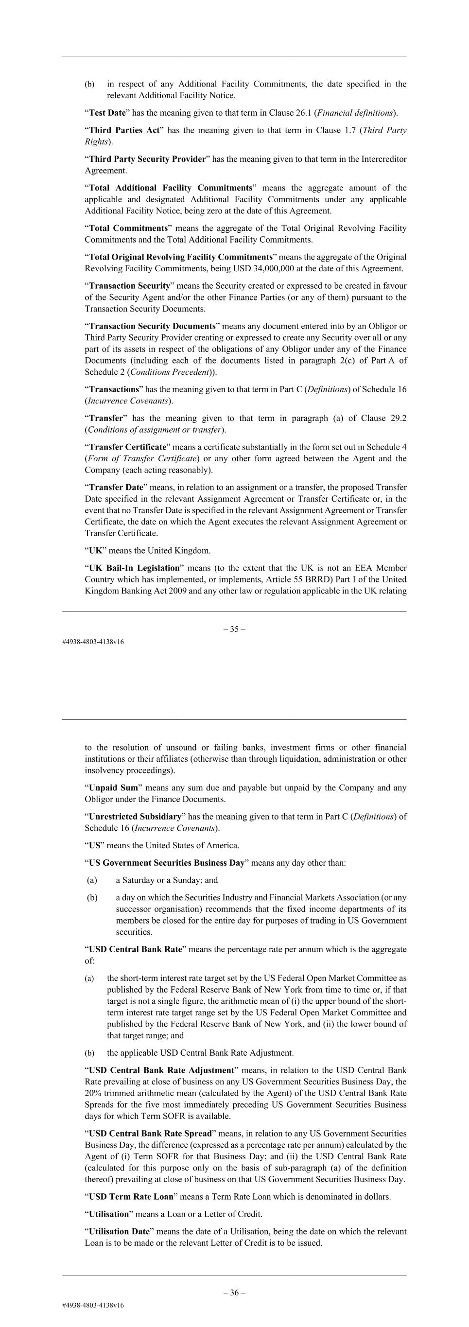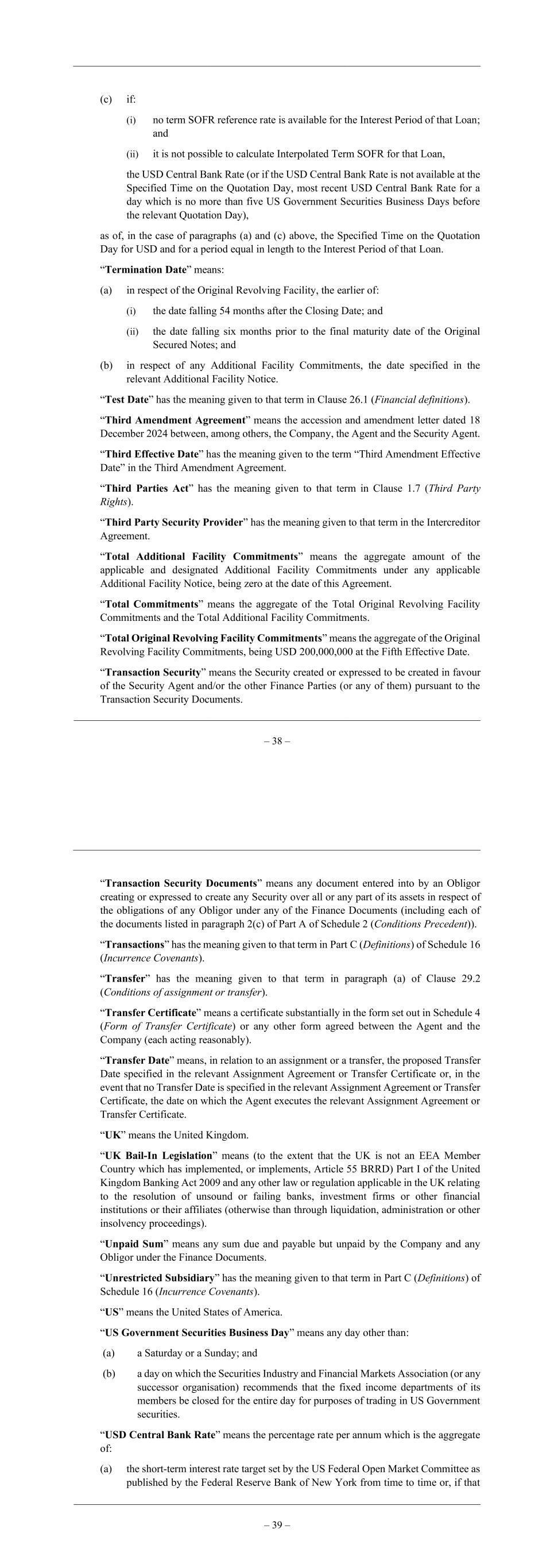 – 38 – (c) if: (i) no term SOFR reference rate is available for the Interest Period of that Loan; and (ii) it is not possible to calculate Interpolated Term SOFR for that Loan, the USD Central Bank Rate (or if the USD Central Bank Rate is not available at the Specified Time on the Quotation Day, most recent USD Central Bank Rate for a day which is no more than five US Government Securities Business Days before the relevant Quotation Day), as of, in the case of paragraphs (a) and (c) above, the Specified Time on the Quotation Day for USD and for a period equal in length to the Interest Period of that Loan. “Termination Date” means: (a) in respect of the Original Revolving Facility, the earlier of: (i) the date falling 54 months after the Closing Date; and (ii) the date falling six months prior to the final maturity date of the Original Secured Notes; and (b) in respect of any Additional Facility Commitments, the date specified in the relevant Additional Facility Notice. “Test Date” has the meaning given to that term in Clause 26.1 (Financial definitions). “Third Amendment Agreement” means the accession and amendment letter dated 18 December 2024 between, among others, the Company, the Agent and the Security Agent. “Third Effective Date” has the meaning given to the term “Third Amendment Effective Date” in the Third Amendment Agreement. “Third Parties Act” has the meaning given to that term in Clause 1.7 (Third Party Rights). “Third Party Security Provider” has the meaning given to that term in the Intercreditor Agreement. “Total Additional Facility Commitments” means the aggregate amount of the applicable and designated Additional Facility Commitments under any applicable Additional Facility Notice, being zero at the date of this Agreement. “Total Commitments” means the aggregate of the Total Original Revolving Facility Commitments and the Total Additional Facility Commitments. “Total Original Revolving Facility Commitments” means the aggregate of the Original Revolving Facility Commitments, being USD 200,000,000 at the Fifth Effective Date. “Transaction Security” means the Security created or expressed to be created in favour of the Security Agent and/or the other Finance Parties (or any of them) pursuant to the Transaction Security Documents. – 39 – “Transaction Security Documents” means any document entered into by an Obligor creating or expressed to create any Security over all or any part of its assets in respect of the obligations of any Obligor under any of the Finance Documents (including each of the documents listed in paragraph 2(c) of Part A of Schedule 2 (Conditions Precedent)). “Transactions” has the meaning given to that term in Part C (Definitions) of Schedule 16 (Incurrence Covenants). “Transfer” has the meaning given to that term in paragraph (a) of Clause 29.2 (Conditions of assignment or transfer). “Transfer Certificate” means a certificate substantially in the form set out in Schedule 4 (Form of Transfer Certificate) or any other form agreed between the Agent and the Company (each acting reasonably). “Transfer Date” means, in relation to an assignment or a transfer, the proposed Transfer Date specified in the relevant Assignment Agreement or Transfer Certificate or, in the event that no Transfer Date is specified in the relevant Assignment Agreement or Transfer Certificate, the date on which the Agent executes the relevant Assignment Agreement or Transfer Certificate. “UK” means the United Kingdom. “UK Bail-In Legislation” means (to the extent that the UK is not an EEA Member Country which has implemented, or implements, Article 55 BRRD) Part I of the United Kingdom Banking Act 2009 and any other law or regulation applicable in the UK relating to the resolution of unsound or failing banks, investment firms or other financial institutions or their affiliates (otherwise than through liquidation, administration or other insolvency proceedings). “Unpaid Sum” means any sum due and payable but unpaid by the Company and any Obligor under the Finance Documents. “Unrestricted Subsidiary” has the meaning given to that term in Part C (Definitions) of Schedule 16 (Incurrence Covenants). “US” means the United States of America. “US Government Securities Business Day” means any day other than: (a) a Saturday or a Sunday; and (b) a day on which the Securities Industry and Financial Markets Association (or any successor organisation) recommends that the fixed income departments of its members be closed for the entire day for purposes of trading in US Government securities. “USD Central Bank Rate” means the percentage rate per annum which is the aggregate of: (a) the short-term interest rate target set by the US Federal Open Market Committee as published by the Federal Reserve Bank of New York from time to time or, if that