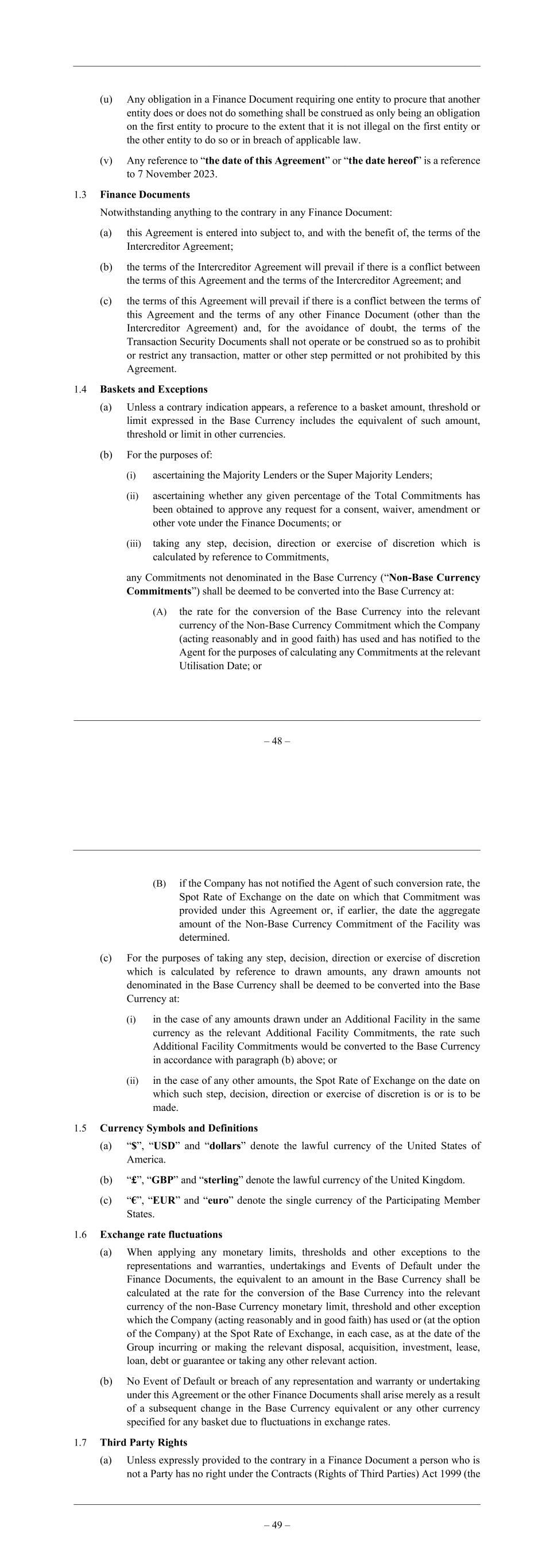 – 48 – (u) Any obligation in a Finance Document requiring one entity to procure that another entity does or does not do something shall be construed as only being an obligation on the first entity to procure to the extent that it is not illegal on the first entity or the other entity to do so or in breach of applicable law. (v) Any reference to “the date of this Agreement” or “the date hereof” is a reference to 7 November 2023. 1.3 Finance Documents Notwithstanding anything to the contrary in any Finance Document: (a) this Agreement is entered into subject to, and with the benefit of, the terms of the Intercreditor Agreement; (b) the terms of the Intercreditor Agreement will prevail if there is a conflict between the terms of this Agreement and the terms of the Intercreditor Agreement; and (c) the terms of this Agreement will prevail if there is a conflict between the terms of this Agreement and the terms of any other Finance Document (other than the Intercreditor Agreement) and, for the avoidance of doubt, the terms of the Transaction Security Documents shall not operate or be construed so as to prohibit or restrict any transaction, matter or other step permitted or not prohibited by this Agreement. 1.4 Baskets and Exceptions (a) Unless a contrary indication appears, a reference to a basket amount, threshold or limit expressed in the Base Currency includes the equivalent of such amount, threshold or limit in other currencies. (b) For the purposes of: (i) ascertaining the Majority Lenders or the Super Majority Lenders; (ii) ascertaining whether any given percentage of the Total Commitments has been obtained to approve any request for a consent, waiver, amendment or other vote under the Finance Documents; or (iii) taking any step, decision, direction or exercise of discretion which is calculated by reference to Commitments, any Commitments not denominated in the Base Currency (“Non-Base Currency Commitments”) shall be deemed to be converted into the Base Currency at: (A) the rate for the conversion of the Base Currency into the relevant currency of the Non-Base Currency Commitment which the Company (acting reasonably and in good faith) has used and has notified to the Agent for the purposes of calculating any Commitments at the relevant Utilisation Date; or – 49 – (B) if the Company has not notified the Agent of such conversion rate, the Spot Rate of Exchange on the date on which that Commitment was provided under this Agreement or, if earlier, the date the aggregate amount of the Non-Base Currency Commitment of the Facility was determined. (c) For the purposes of taking any step, decision, direction or exercise of discretion which is calculated by reference to drawn amounts, any drawn amounts not denominated in the Base Currency shall be deemed to be converted into the Base Currency at: (i) in the case of any amounts drawn under an Additional Facility in the same currency as the relevant Additional Facility Commitments, the rate such Additional Facility Commitments would be converted to the Base Currency in accordance with paragraph (b) above; or (ii) in the case of any other amounts, the Spot Rate of Exchange on the date on which such step, decision, direction or exercise of discretion is or is to be made. 1.5 Currency Symbols and Definitions (a) “$”, “USD” and “dollars” denote the lawful currency of the United States of America. (b) “£”, “GBP” and “sterling” denote the lawful currency of the United Kingdom. (c) “€”, “EUR” and “euro” denote the single currency of the Participating Member States. 1.6 Exchange rate fluctuations (a) When applying any monetary limits, thresholds and other exceptions to the representations and warranties, undertakings and Events of Default under the Finance Documents, the equivalent to an amount in the Base Currency shall be calculated at the rate for the conversion of the Base Currency into the relevant currency of the non-Base Currency monetary limit, threshold and other exception which the Company (acting reasonably and in good faith) has used or (at the option of the Company) at the Spot Rate of Exchange, in each case, as at the date of the Group incurring or making the relevant disposal, acquisition, investment, lease, loan, debt or guarantee or taking any other relevant action. (b) No Event of Default or breach of any representation and warranty or undertaking under this Agreement or the other Finance Documents shall arise merely as a result of a subsequent change in the Base Currency equivalent or any other currency specified for any basket due to fluctuations in exchange rates. 1.7 Third Party Rights (a) Unless expressly provided to the contrary in a Finance Document a person who is not a Party has no right under the Contracts (Rights of Third Parties) Act 1999 (the