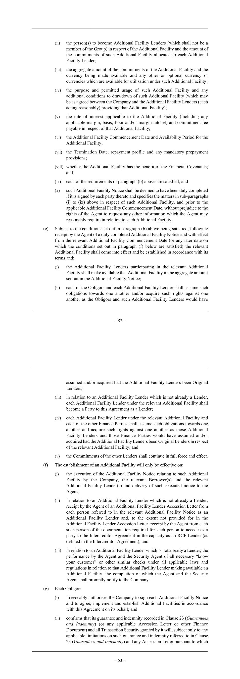 – 52 – (ii) the person(s) to become Additional Facility Lenders (which shall not be a member of the Group) in respect of the Additional Facility and the amount of the commitments of such Additional Facility allocated to each Additional Facility Lender; (iii) the aggregate amount of the commitments of the Additional Facility and the currency being made available and any other or optional currency or currencies which are available for utilisation under such Additional Facility; (iv) the purpose and permitted usage of such Additional Facility and any additional conditions to drawdown of such Additional Facility (which may be as agreed between the Company and the Additional Facility Lenders (each acting reasonably) providing that Additional Facility); (v) the rate of interest applicable to the Additional Facility (including any applicable margin, basis, floor and/or margin ratchet) and commitment fee payable in respect of that Additional Facility; (vi) the Additional Facility Commencement Date and Availability Period for the Additional Facility; (vii) the Termination Date, repayment profile and any mandatory prepayment provisions; (viii) whether the Additional Facility has the benefit of the Financial Covenants; and (ix) each of the requirements of paragraph (b) above are satisfied; and (x) such Additional Facility Notice shall be deemed to have been duly completed if it is signed by each party thereto and specifies the matters in sub-paragraphs (i) to (ix) above in respect of such Additional Facility, and prior to the applicable Additional Facility Commencement Date, without prejudice to the rights of the Agent to request any other information which the Agent may reasonably require in relation to such Additional Facility. (e) Subject to the conditions set out in paragraph (b) above being satisfied, following receipt by the Agent of a duly completed Additional Facility Notice and with effect from the relevant Additional Facility Commencement Date (or any later date on which the conditions set out in paragraph (f) below are satisfied) the relevant Additional Facility shall come into effect and be established in accordance with its terms and: (i) the Additional Facility Lenders participating in the relevant Additional Facility shall make available that Additional Facility in the aggregate amount set out in the Additional Facility Notice; (ii) each of the Obligors and each Additional Facility Lender shall assume such obligations towards one another and/or acquire such rights against one another as the Obligors and such Additional Facility Lenders would have – 53 – assumed and/or acquired had the Additional Facility Lenders been Original Lenders; (iii) in relation to an Additional Facility Lender which is not already a Lender, each Additional Facility Lender under the relevant Additional Facility shall become a Party to this Agreement as a Lender; (iv) each Additional Facility Lender under the relevant Additional Facility and each of the other Finance Parties shall assume such obligations towards one another and acquire such rights against one another as those Additional Facility Lenders and those Finance Parties would have assumed and/or acquired had the Additional Facility Lenders been Original Lenders in respect of the relevant Additional Facility; and (v) the Commitments of the other Lenders shall continue in full force and effect. (f) The establishment of an Additional Facility will only be effective on: (i) the execution of the Additional Facility Notice relating to such Additional Facility by the Company, the relevant Borrower(s) and the relevant Additional Facility Lender(s) and delivery of such executed notice to the Agent; (ii) in relation to an Additional Facility Lender which is not already a Lender, receipt by the Agent of an Additional Facility Lender Accession Letter from each person referred to in the relevant Additional Facility Notice as an Additional Facility Lender and, to the extent not provided for in the Additional Facility Lender Accession Letter, receipt by the Agent from each such person of the documentation required for such person to accede as a party to the Intercreditor Agreement in the capacity as an RCF Lender (as defined in the Intercreditor Agreement); and (iii) in relation to an Additional Facility Lender which is not already a Lender, the performance by the Agent and the Security Agent of all necessary “know your customer” or other similar checks under all applicable laws and regulations in relation to that Additional Facility Lender making available an Additional Facility, the completion of which the Agent and the Security Agent shall promptly notify to the Company. (g) Each Obligor: (i) irrevocably authorises the Company to sign each Additional Facility Notice and to agree, implement and establish Additional Facilities in accordance with this Agreement on its behalf; and (ii) confirms that its guarantee and indemnity recorded in Clause 23 (Guarantees and Indemnity) (or any applicable Accession Letter or other Finance Document) and all Transaction Security granted by it will, subject only to any applicable limitations on such guarantee and indemnity referred to in Clause 23 (Guarantees and Indemnity) and any Accession Letter pursuant to which