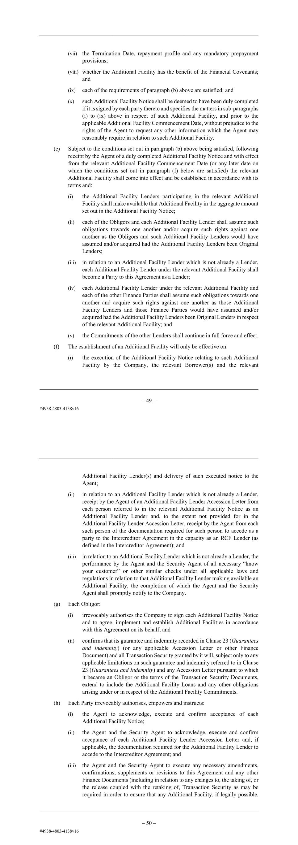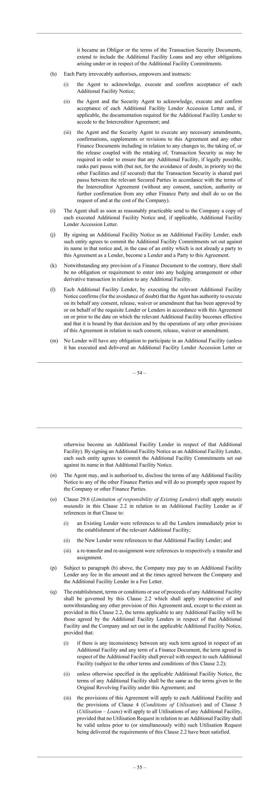 – 54 – it became an Obligor or the terms of the Transaction Security Documents, extend to include the Additional Facility Loans and any other obligations arising under or in respect of the Additional Facility Commitments. (h) Each Party irrevocably authorises, empowers and instructs: (i) the Agent to acknowledge, execute and confirm acceptance of each Additional Facility Notice; (ii) the Agent and the Security Agent to acknowledge, execute and confirm acceptance of each Additional Facility Lender Accession Letter and, if applicable, the documentation required for the Additional Facility Lender to accede to the Intercreditor Agreement; and (iii) the Agent and the Security Agent to execute any necessary amendments, confirmations, supplements or revisions to this Agreement and any other Finance Documents including in relation to any changes to, the taking of, or the release coupled with the retaking of, Transaction Security as may be required in order to ensure that any Additional Facility, if legally possible, ranks pari passu with (but not, for the avoidance of doubt, in priority to) the other Facilities and (if secured) that the Transaction Security is shared pari passu between the relevant Secured Parties in accordance with the terms of the Intercreditor Agreement (without any consent, sanction, authority or further confirmation from any other Finance Party and shall do so on the request of and at the cost of the Company). (i) The Agent shall as soon as reasonably practicable send to the Company a copy of each executed Additional Facility Notice and, if applicable, Additional Facility Lender Accession Letter. (j) By signing an Additional Facility Notice as an Additional Facility Lender, each such entity agrees to commit the Additional Facility Commitments set out against its name in that notice and, in the case of an entity which is not already a party to this Agreement as a Lender, become a Lender and a Party to this Agreement. (k) Notwithstanding any provision of a Finance Document to the contrary, there shall be no obligation or requirement to enter into any hedging arrangement or other derivative transaction in relation to any Additional Facility. (l) Each Additional Facility Lender, by executing the relevant Additional Facility Notice confirms (for the avoidance of doubt) that the Agent has authority to execute on its behalf any consent, release, waiver or amendment that has been approved by or on behalf of the requisite Lender or Lenders in accordance with this Agreement on or prior to the date on which the relevant Additional Facility becomes effective and that it is bound by that decision and by the operations of any other provisions of this Agreement in relation to such consent, release, waiver or amendment. (m) No Lender will have any obligation to participate in an Additional Facility (unless it has executed and delivered an Additional Facility Lender Accession Letter or – 55 – otherwise become an Additional Facility Lender in respect of that Additional Facility). By signing an Additional Facility Notice as an Additional Facility Lender, each such entity agrees to commit the Additional Facility Commitments set out against its name in that Additional Facility Notice. (n) The Agent may, and is authorised to, disclose the terms of any Additional Facility Notice to any of the other Finance Parties and will do so promptly upon request by the Company or other Finance Parties. (o) Clause 29.6 (Limitation of responsibility of Existing Lenders) shall apply mutatis mutandis in this Clause 2.2 in relation to an Additional Facility Lender as if references in that Clause to: (i) an Existing Lender were references to all the Lenders immediately prior to the establishment of the relevant Additional Facility; (ii) the New Lender were references to that Additional Facility Lender; and (iii) a re-transfer and re-assignment were references to respectively a transfer and assignment. (p) Subject to paragraph (b) above, the Company may pay to an Additional Facility Lender any fee in the amount and at the times agreed between the Company and the Additional Facility Lender in a Fee Letter. (q) The establishment, terms or conditions or use of proceeds of any Additional Facility shall be governed by this Clause 2.2 which shall apply irrespective of and notwithstanding any other provision of this Agreement and, except to the extent as provided in this Clause 2.2, the terms applicable to any Additional Facility will be those agreed by the Additional Facility Lenders in respect of that Additional Facility and the Company and set out in the applicable Additional Facility Notice, provided that: (i) if there is any inconsistency between any such term agreed in respect of an Additional Facility and any term of a Finance Document, the term agreed in respect of the Additional Facility shall prevail with respect to such Additional Facility (subject to the other terms and conditions of this Clause 2.2); (ii) unless otherwise specified in the applicable Additional Facility Notice, the terms of any Additional Facility shall be the same as the terms given to the Original Revolving Facility under this Agreement; and (iii) the provisions of this Agreement will apply to each Additional Facility and the provisions of Clause 4 (Conditions of Utilisation) and of Clause 5 (Utilisation – Loans) will apply to all Utilisations of any Additional Facility, provided that no Utilisation Request in relation to an Additional Facility shall be valid unless prior to (or simultaneously with) such Utilisation Request being delivered the requirements of this Clause 2.2 have been satisfied.