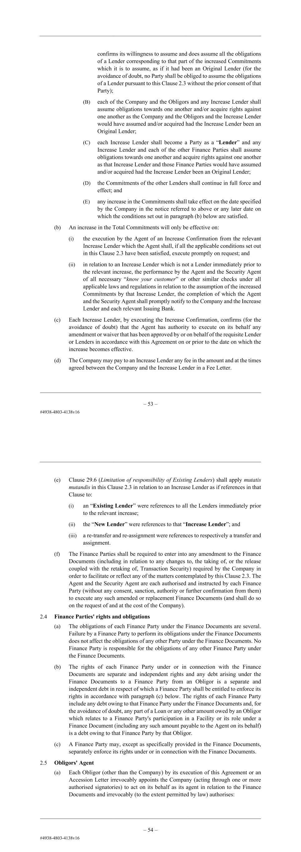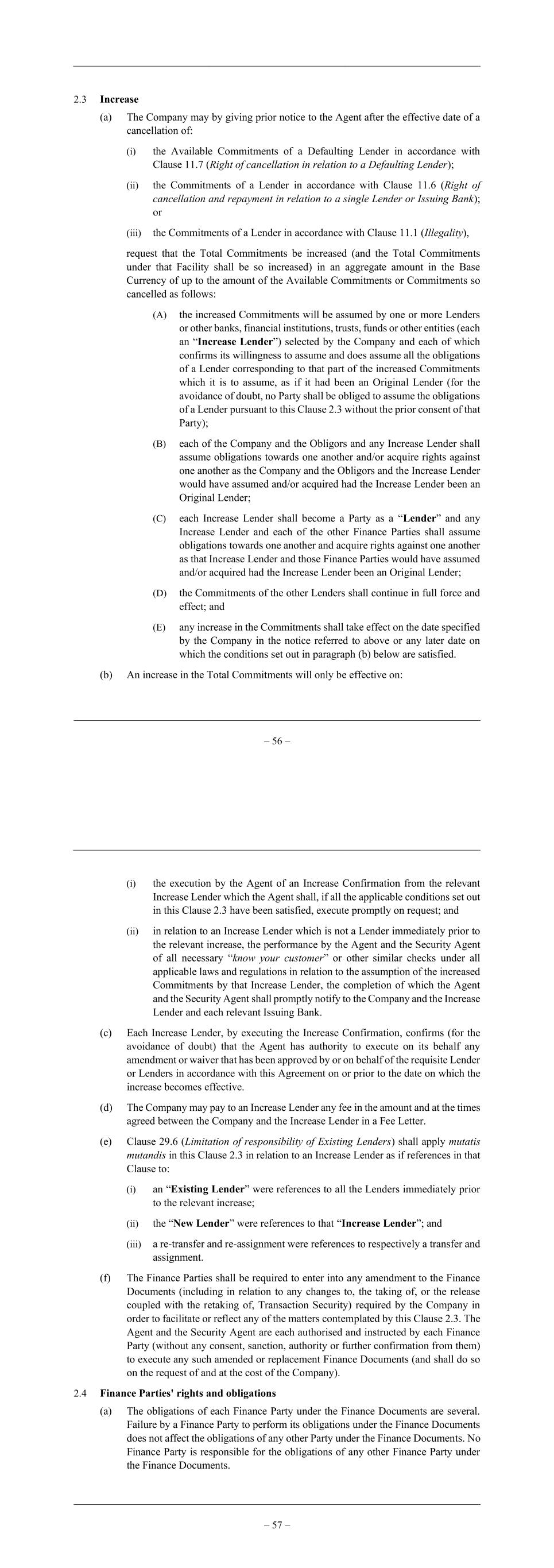 – 56 – 2.3 Increase (a) The Company may by giving prior notice to the Agent after the effective date of a cancellation of: (i) the Available Commitments of a Defaulting Lender in accordance with Clause 11.7 (Right of cancellation in relation to a Defaulting Lender); (ii) the Commitments of a Lender in accordance with Clause 11.6 (Right of cancellation and repayment in relation to a single Lender or Issuing Bank); or (iii) the Commitments of a Lender in accordance with Clause 11.1 (Illegality), request that the Total Commitments be increased (and the Total Commitments under that Facility shall be so increased) in an aggregate amount in the Base Currency of up to the amount of the Available Commitments or Commitments so cancelled as follows: (A) the increased Commitments will be assumed by one or more Lenders or other banks, financial institutions, trusts, funds or other entities (each an “Increase Lender”) selected by the Company and each of which confirms its willingness to assume and does assume all the obligations of a Lender corresponding to that part of the increased Commitments which it is to assume, as if it had been an Original Lender (for the avoidance of doubt, no Party shall be obliged to assume the obligations of a Lender pursuant to this Clause 2.3 without the prior consent of that Party); (B) each of the Company and the Obligors and any Increase Lender shall assume obligations towards one another and/or acquire rights against one another as the Company and the Obligors and the Increase Lender would have assumed and/or acquired had the Increase Lender been an Original Lender; (C) each Increase Lender shall become a Party as a “Lender” and any Increase Lender and each of the other Finance Parties shall assume obligations towards one another and acquire rights against one another as that Increase Lender and those Finance Parties would have assumed and/or acquired had the Increase Lender been an Original Lender; (D) the Commitments of the other Lenders shall continue in full force and effect; and (E) any increase in the Commitments shall take effect on the date specified by the Company in the notice referred to above or any later date on which the conditions set out in paragraph (b) below are satisfied. (b) An increase in the Total Commitments will only be effective on: – 57 – (i) the execution by the Agent of an Increase Confirmation from the relevant Increase Lender which the Agent shall, if all the applicable conditions set out in this Clause 2.3 have been satisfied, execute promptly on request; and (ii) in relation to an Increase Lender which is not a Lender immediately prior to the relevant increase, the performance by the Agent and the Security Agent of all necessary “know your customer” or other similar checks under all applicable laws and regulations in relation to the assumption of the increased Commitments by that Increase Lender, the completion of which the Agent and the Security Agent shall promptly notify to the Company and the Increase Lender and each relevant Issuing Bank. (c) Each Increase Lender, by executing the Increase Confirmation, confirms (for the avoidance of doubt) that the Agent has authority to execute on its behalf any amendment or waiver that has been approved by or on behalf of the requisite Lender or Lenders in accordance with this Agreement on or prior to the date on which the increase becomes effective. (d) The Company may pay to an Increase Lender any fee in the amount and at the times agreed between the Company and the Increase Lender in a Fee Letter. (e) Clause 29.6 (Limitation of responsibility of Existing Lenders) shall apply mutatis mutandis in this Clause 2.3 in relation to an Increase Lender as if references in that Clause to: (i) an “Existing Lender” were references to all the Lenders immediately prior to the relevant increase; (ii) the “New Lender” were references to that “Increase Lender”; and (iii) a re-transfer and re-assignment were references to respectively a transfer and assignment. (f) The Finance Parties shall be required to enter into any amendment to the Finance Documents (including in relation to any changes to, the taking of, or the release coupled with the retaking of, Transaction Security) required by the Company in order to facilitate or reflect any of the matters contemplated by this Clause 2.3. The Agent and the Security Agent are each authorised and instructed by each Finance Party (without any consent, sanction, authority or further confirmation from them) to execute any such amended or replacement Finance Documents (and shall do so on the request of and at the cost of the Company). 2.4 Finance Parties' rights and obligations (a) The obligations of each Finance Party under the Finance Documents are several. Failure by a Finance Party to perform its obligations under the Finance Documents does not affect the obligations of any other Party under the Finance Documents. No Finance Party is responsible for the obligations of any other Finance Party under the Finance Documents.