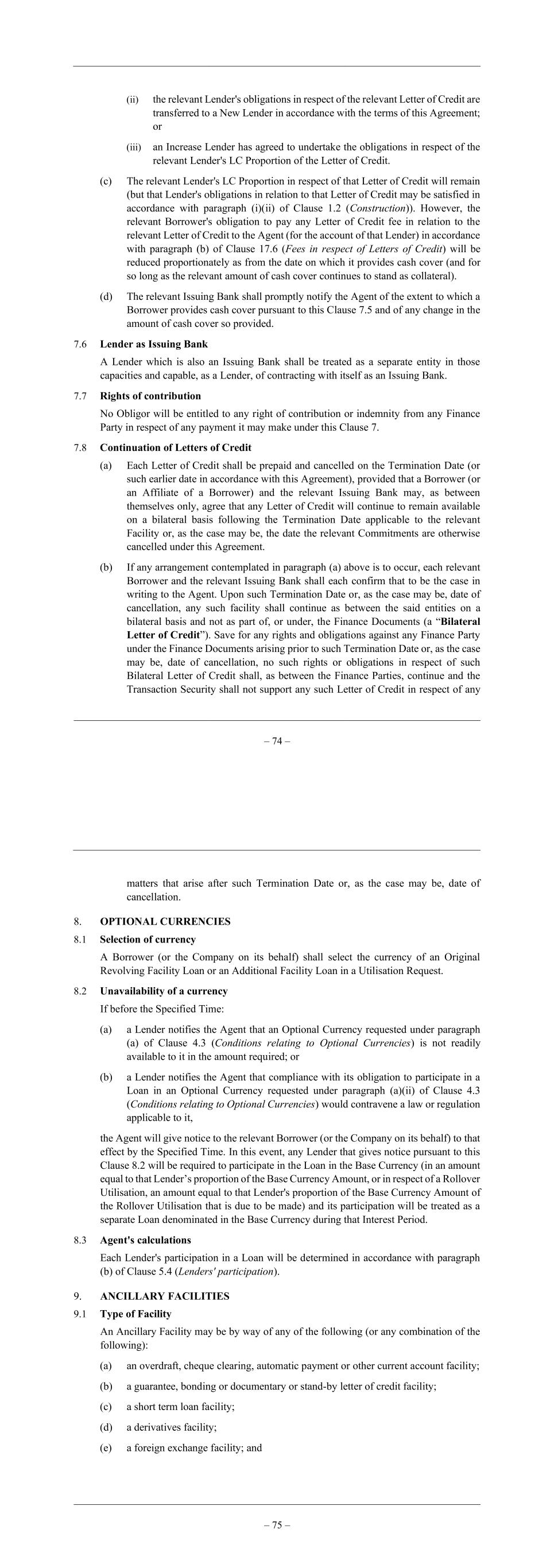 – 74 – (ii) the relevant Lender's obligations in respect of the relevant Letter of Credit are transferred to a New Lender in accordance with the terms of this Agreement; or (iii) an Increase Lender has agreed to undertake the obligations in respect of the relevant Lender's LC Proportion of the Letter of Credit. (c) The relevant Lender's LC Proportion in respect of that Letter of Credit will remain (but that Lender's obligations in relation to that Letter of Credit may be satisfied in accordance with paragraph (i)(ii) of Clause 1.2 (Construction)). However, the relevant Borrower's obligation to pay any Letter of Credit fee in relation to the relevant Letter of Credit to the Agent (for the account of that Lender) in accordance with paragraph (b) of Clause 17.6 (Fees in respect of Letters of Credit) will be reduced proportionately as from the date on which it provides cash cover (and for so long as the relevant amount of cash cover continues to stand as collateral). (d) The relevant Issuing Bank shall promptly notify the Agent of the extent to which a Borrower provides cash cover pursuant to this Clause 7.5 and of any change in the amount of cash cover so provided. 7.6 Lender as Issuing Bank A Lender which is also an Issuing Bank shall be treated as a separate entity in those capacities and capable, as a Lender, of contracting with itself as an Issuing Bank. 7.7 Rights of contribution No Obligor will be entitled to any right of contribution or indemnity from any Finance Party in respect of any payment it may make under this Clause 7. 7.8 Continuation of Letters of Credit (a) Each Letter of Credit shall be prepaid and cancelled on the Termination Date (or such earlier date in accordance with this Agreement), provided that a Borrower (or an Affiliate of a Borrower) and the relevant Issuing Bank may, as between themselves only, agree that any Letter of Credit will continue to remain available on a bilateral basis following the Termination Date applicable to the relevant Facility or, as the case may be, the date the relevant Commitments are otherwise cancelled under this Agreement. (b) If any arrangement contemplated in paragraph (a) above is to occur, each relevant Borrower and the relevant Issuing Bank shall each confirm that to be the case in writing to the Agent. Upon such Termination Date or, as the case may be, date of cancellation, any such facility shall continue as between the said entities on a bilateral basis and not as part of, or under, the Finance Documents (a “Bilateral Letter of Credit”). Save for any rights and obligations against any Finance Party under the Finance Documents arising prior to such Termination Date or, as the case may be, date of cancellation, no such rights or obligations in respect of such Bilateral Letter of Credit shall, as between the Finance Parties, continue and the Transaction Security shall not support any such Letter of Credit in respect of any – 75 – matters that arise after such Termination Date or, as the case may be, date of cancellation. 8. OPTIONAL CURRENCIES 8.1 Selection of currency A Borrower (or the Company on its behalf) shall select the currency of an Original Revolving Facility Loan or an Additional Facility Loan in a Utilisation Request. 8.2 Unavailability of a currency If before the Specified Time: (a) a Lender notifies the Agent that an Optional Currency requested under paragraph (a) of Clause 4.3 (Conditions relating to Optional Currencies) is not readily available to it in the amount required; or (b) a Lender notifies the Agent that compliance with its obligation to participate in a Loan in an Optional Currency requested under paragraph (a)(ii) of Clause 4.3 (Conditions relating to Optional Currencies) would contravene a law or regulation applicable to it, the Agent will give notice to the relevant Borrower (or the Company on its behalf) to that effect by the Specified Time. In this event, any Lender that gives notice pursuant to this Clause 8.2 will be required to participate in the Loan in the Base Currency (in an amount equal to that Lender’s proportion of the Base Currency Amount, or in respect of a Rollover Utilisation, an amount equal to that Lender's proportion of the Base Currency Amount of the Rollover Utilisation that is due to be made) and its participation will be treated as a separate Loan denominated in the Base Currency during that Interest Period. 8.3 Agent's calculations Each Lender's participation in a Loan will be determined in accordance with paragraph (b) of Clause 5.4 (Lenders' participation). 9. ANCILLARY FACILITIES 9.1 Type of Facility An Ancillary Facility may be by way of any of the following (or any combination of the following): (a) an overdraft, cheque clearing, automatic payment or other current account facility; (b) a guarantee, bonding or documentary or stand-by letter of credit facility; (c) a short term loan facility; (d) a derivatives facility; (e) a foreign exchange facility; and
