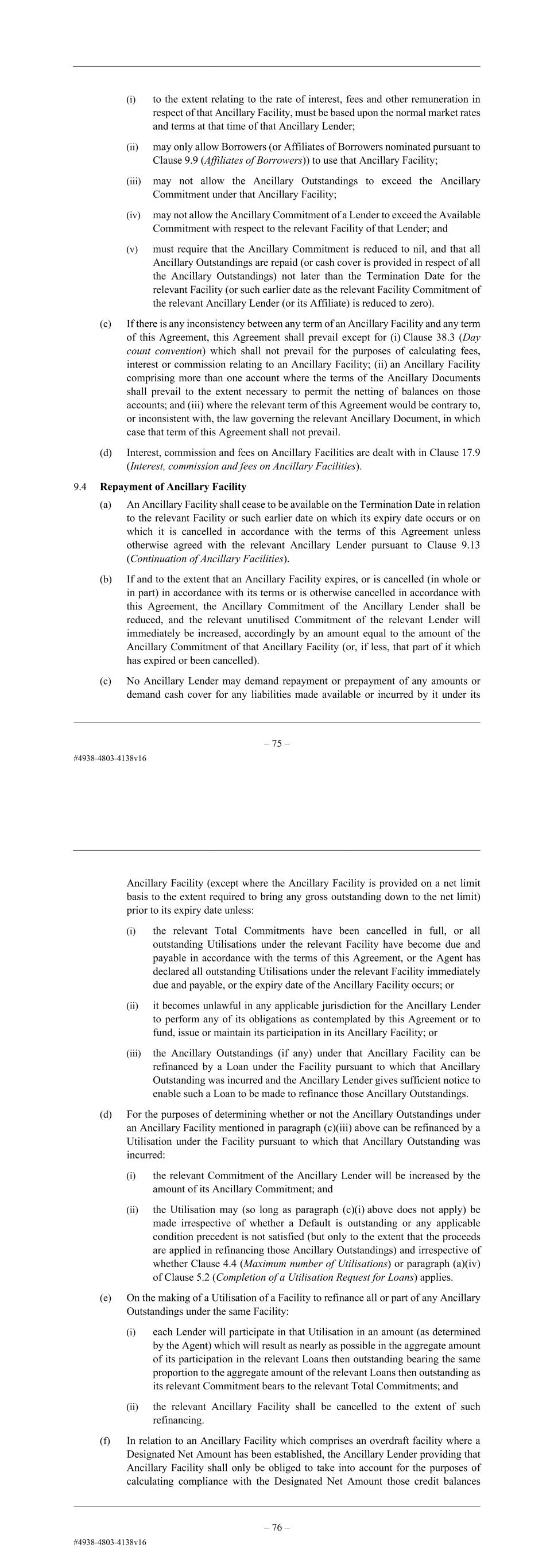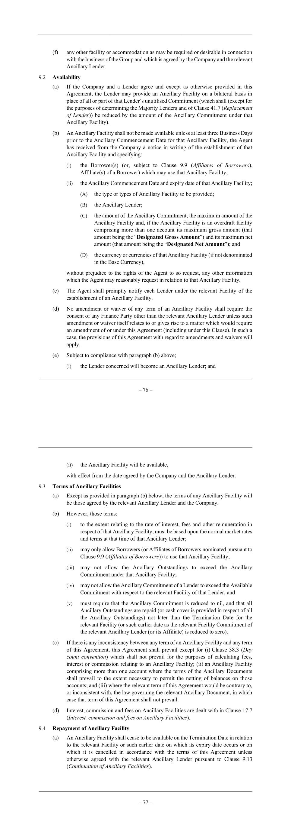 – 76 – (f) any other facility or accommodation as may be required or desirable in connection with the business of the Group and which is agreed by the Company and the relevant Ancillary Lender. 9.2 Availability (a) If the Company and a Lender agree and except as otherwise provided in this Agreement, the Lender may provide an Ancillary Facility on a bilateral basis in place of all or part of that Lender’s unutilised Commitment (which shall (except for the purposes of determining the Majority Lenders and of Clause 41.7 (Replacement of Lender)) be reduced by the amount of the Ancillary Commitment under that Ancillary Facility). (b) An Ancillary Facility shall not be made available unless at least three Business Days prior to the Ancillary Commencement Date for that Ancillary Facility, the Agent has received from the Company a notice in writing of the establishment of that Ancillary Facility and specifying: (i) the Borrower(s) (or, subject to Clause 9.9 (Affiliates of Borrowers), Affiliate(s) of a Borrower) which may use that Ancillary Facility; (ii) the Ancillary Commencement Date and expiry date of that Ancillary Facility; (A) the type or types of Ancillary Facility to be provided; (B) the Ancillary Lender; (C) the amount of the Ancillary Commitment, the maximum amount of the Ancillary Facility and, if the Ancillary Facility is an overdraft facility comprising more than one account its maximum gross amount (that amount being the “Designated Gross Amount”) and its maximum net amount (that amount being the “Designated Net Amount”); and (D) the currency or currencies of that Ancillary Facility (if not denominated in the Base Currency), without prejudice to the rights of the Agent to so request, any other information which the Agent may reasonably request in relation to that Ancillary Facility. (c) The Agent shall promptly notify each Lender under the relevant Facility of the establishment of an Ancillary Facility. (d) No amendment or waiver of any term of an Ancillary Facility shall require the consent of any Finance Party other than the relevant Ancillary Lender unless such amendment or waiver itself relates to or gives rise to a matter which would require an amendment of or under this Agreement (including under this Clause). In such a case, the provisions of this Agreement with regard to amendments and waivers will apply. (e) Subject to compliance with paragraph (b) above; (i) the Lender concerned will become an Ancillary Lender; and – 77 – (ii) the Ancillary Facility will be available, with effect from the date agreed by the Company and the Ancillary Lender. 9.3 Terms of Ancillary Facilities (a) Except as provided in paragraph (b) below, the terms of any Ancillary Facility will be those agreed by the relevant Ancillary Lender and the Company. (b) However, those terms: (i) to the extent relating to the rate of interest, fees and other remuneration in respect of that Ancillary Facility, must be based upon the normal market rates and terms at that time of that Ancillary Lender; (ii) may only allow Borrowers (or Affiliates of Borrowers nominated pursuant to Clause 9.9 (Affiliates of Borrowers)) to use that Ancillary Facility; (iii) may not allow the Ancillary Outstandings to exceed the Ancillary Commitment under that Ancillary Facility; (iv) may not allow the Ancillary Commitment of a Lender to exceed the Available Commitment with respect to the relevant Facility of that Lender; and (v) must require that the Ancillary Commitment is reduced to nil, and that all Ancillary Outstandings are repaid (or cash cover is provided in respect of all the Ancillary Outstandings) not later than the Termination Date for the relevant Facility (or such earlier date as the relevant Facility Commitment of the relevant Ancillary Lender (or its Affiliate) is reduced to zero). (c) If there is any inconsistency between any term of an Ancillary Facility and any term of this Agreement, this Agreement shall prevail except for (i) Clause 38.3 (Day count convention) which shall not prevail for the purposes of calculating fees, interest or commission relating to an Ancillary Facility; (ii) an Ancillary Facility comprising more than one account where the terms of the Ancillary Documents shall prevail to the extent necessary to permit the netting of balances on those accounts; and (iii) where the relevant term of this Agreement would be contrary to, or inconsistent with, the law governing the relevant Ancillary Document, in which case that term of this Agreement shall not prevail. (d) Interest, commission and fees on Ancillary Facilities are dealt with in Clause 17.7 (Interest, commission and fees on Ancillary Facilities). 9.4 Repayment of Ancillary Facility (a) An Ancillary Facility shall cease to be available on the Termination Date in relation to the relevant Facility or such earlier date on which its expiry date occurs or on which it is cancelled in accordance with the terms of this Agreement unless otherwise agreed with the relevant Ancillary Lender pursuant to Clause 9.13 (Continuation of Ancillary Facilities).