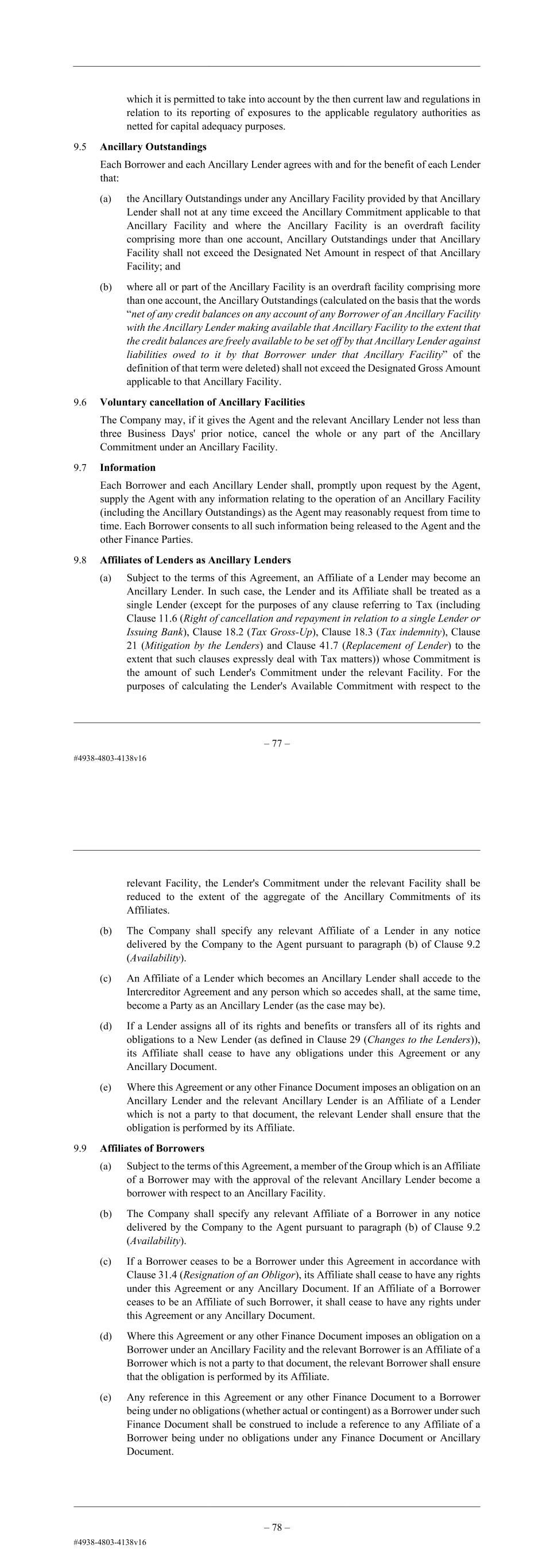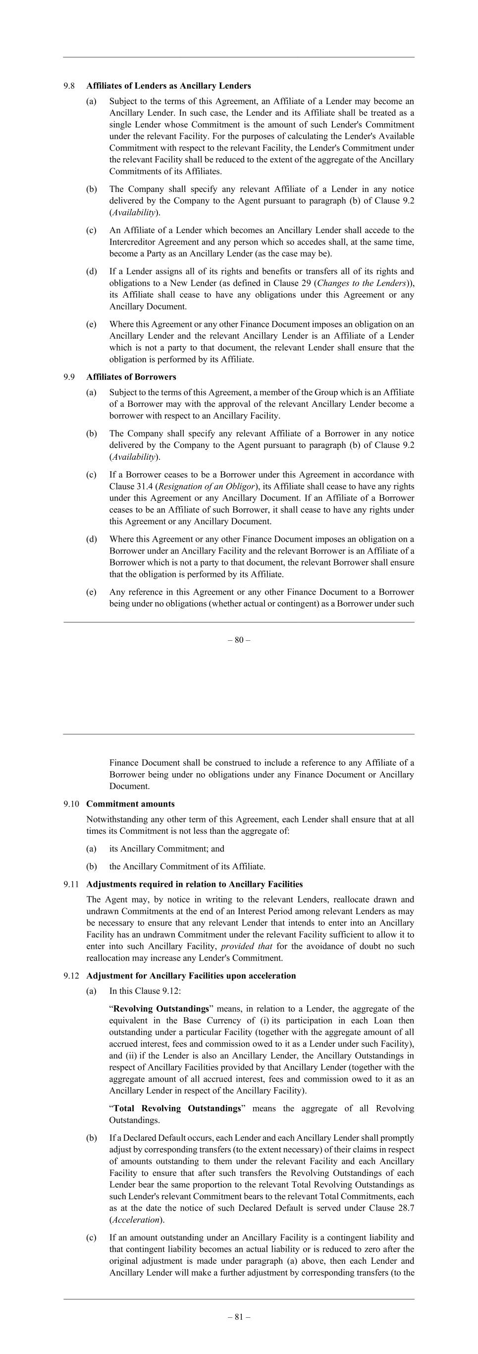 – 80 – 9.8 Affiliates of Lenders as Ancillary Lenders (a) Subject to the terms of this Agreement, an Affiliate of a Lender may become an Ancillary Lender. In such case, the Lender and its Affiliate shall be treated as a single Lender whose Commitment is the amount of such Lender's Commitment under the relevant Facility. For the purposes of calculating the Lender's Available Commitment with respect to the relevant Facility, the Lender's Commitment under the relevant Facility shall be reduced to the extent of the aggregate of the Ancillary Commitments of its Affiliates. (b) The Company shall specify any relevant Affiliate of a Lender in any notice delivered by the Company to the Agent pursuant to paragraph (b) of Clause 9.2 (Availability). (c) An Affiliate of a Lender which becomes an Ancillary Lender shall accede to the Intercreditor Agreement and any person which so accedes shall, at the same time, become a Party as an Ancillary Lender (as the case may be). (d) If a Lender assigns all of its rights and benefits or transfers all of its rights and obligations to a New Lender (as defined in Clause 29 (Changes to the Lenders)), its Affiliate shall cease to have any obligations under this Agreement or any Ancillary Document. (e) Where this Agreement or any other Finance Document imposes an obligation on an Ancillary Lender and the relevant Ancillary Lender is an Affiliate of a Lender which is not a party to that document, the relevant Lender shall ensure that the obligation is performed by its Affiliate. 9.9 Affiliates of Borrowers (a) Subject to the terms of this Agreement, a member of the Group which is an Affiliate of a Borrower may with the approval of the relevant Ancillary Lender become a borrower with respect to an Ancillary Facility. (b) The Company shall specify any relevant Affiliate of a Borrower in any notice delivered by the Company to the Agent pursuant to paragraph (b) of Clause 9.2 (Availability). (c) If a Borrower ceases to be a Borrower under this Agreement in accordance with Clause 31.4 (Resignation of an Obligor), its Affiliate shall cease to have any rights under this Agreement or any Ancillary Document. If an Affiliate of a Borrower ceases to be an Affiliate of such Borrower, it shall cease to have any rights under this Agreement or any Ancillary Document. (d) Where this Agreement or any other Finance Document imposes an obligation on a Borrower under an Ancillary Facility and the relevant Borrower is an Affiliate of a Borrower which is not a party to that document, the relevant Borrower shall ensure that the obligation is performed by its Affiliate. (e) Any reference in this Agreement or any other Finance Document to a Borrower being under no obligations (whether actual or contingent) as a Borrower under such – 81 – Finance Document shall be construed to include a reference to any Affiliate of a Borrower being under no obligations under any Finance Document or Ancillary Document. 9.10 Commitment amounts Notwithstanding any other term of this Agreement, each Lender shall ensure that at all times its Commitment is not less than the aggregate of: (a) its Ancillary Commitment; and (b) the Ancillary Commitment of its Affiliate. 9.11 Adjustments required in relation to Ancillary Facilities The Agent may, by notice in writing to the relevant Lenders, reallocate drawn and undrawn Commitments at the end of an Interest Period among relevant Lenders as may be necessary to ensure that any relevant Lender that intends to enter into an Ancillary Facility has an undrawn Commitment under the relevant Facility sufficient to allow it to enter into such Ancillary Facility, provided that for the avoidance of doubt no such reallocation may increase any Lender's Commitment. 9.12 Adjustment for Ancillary Facilities upon acceleration (a) In this Clause 9.12: “Revolving Outstandings” means, in relation to a Lender, the aggregate of the equivalent in the Base Currency of (i) its participation in each Loan then outstanding under a particular Facility (together with the aggregate amount of all accrued interest, fees and commission owed to it as a Lender under such Facility), and (ii) if the Lender is also an Ancillary Lender, the Ancillary Outstandings in respect of Ancillary Facilities provided by that Ancillary Lender (together with the aggregate amount of all accrued interest, fees and commission owed to it as an Ancillary Lender in respect of the Ancillary Facility). “Total Revolving Outstandings” means the aggregate of all Revolving Outstandings. (b) If a Declared Default occurs, each Lender and each Ancillary Lender shall promptly adjust by corresponding transfers (to the extent necessary) of their claims in respect of amounts outstanding to them under the relevant Facility and each Ancillary Facility to ensure that after such transfers the Revolving Outstandings of each Lender bear the same proportion to the relevant Total Revolving Outstandings as such Lender's relevant Commitment bears to the relevant Total Commitments, each as at the date the notice of such Declared Default is served under Clause 28.7 (Acceleration). (c) If an amount outstanding under an Ancillary Facility is a contingent liability and that contingent liability becomes an actual liability or is reduced to zero after the original adjustment is made under paragraph (a) above, then each Lender and Ancillary Lender will make a further adjustment by corresponding transfers (to the