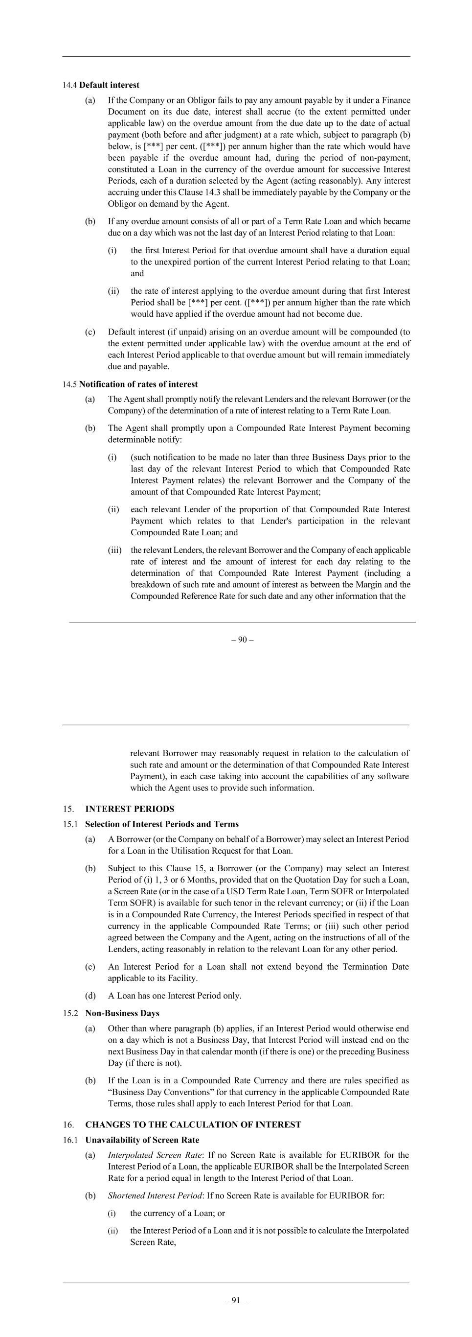 14.4 Default interest (a) If the Company or an Obligor fails to pay any amount payable by it under a Finance Document on its due date, interest shall accrue (to the extent permitted under applicable law) on the overdue amount from the due date up to the date of actual payment (both before and after judgment) at a rate which, subject to paragraph (b) below, is [***] per cent. ([***]) per annum higher than the rate which would have been payable if the overdue amount had, during the period of non-payment, constituted a Loan in the currency of the overdue amount for successive Interest Periods, each of a duration selected by the Agent (acting reasonably). Any interest accruing under this Clause 14.3 shall be immediately payable by the Company or the Obligor on demand by the Agent. (b) If any overdue amount consists of all or part of a Term Rate Loan and which became due on a day which was not the last day of an Interest Period relating to that Loan: (i) the first Interest Period for that overdue amount shall have a duration equal to the unexpired portion of the current Interest Period relating to that Loan; and (ii) the rate of interest applying to the overdue amount during that first Interest Period shall be [***] per cent. ([***]) per annum higher than the rate which would have applied if the overdue amount had not become due. (c) Default interest (if unpaid) arising on an overdue amount will be compounded (to the extent permitted under applicable law) with the overdue amount at the end of each Interest Period applicable to that overdue amount but will remain immediately due and payable. 14.5 Notification of rates of interest (a) The Agent shall promptly notify the relevant Lenders and the relevant Borrower (or the Company) of the determination of a rate of interest relating to a Term Rate Loan. (b) The Agent shall promptly upon a Compounded Rate Interest Payment becoming determinable notify: (i) (such notification to be made no later than three Business Days prior to the last day of the relevant Interest Period to which that Compounded Rate Interest Payment relates) the relevant Borrower and the Company of the amount of that Compounded Rate Interest Payment; (ii) each relevant Lender of the proportion of that Compounded Rate Interest Payment which relates to that Lender's participation in the relevant Compounded Rate Loan; and (iii) the relevant Lenders, the relevant Borrower and the Company of each applicable rate of interest and the amount of interest for each day relating to the determination of that Compounded Rate Interest Payment (including a breakdown of such rate and amount of interest as between the Margin and the Compounded Reference Rate for such date and any other information that the – 90 – – 90 – – 91 – relevant Borrower may reasonably request in relation to the calculation of such rate and amount or the determination of that Compounded Rate Interest Payment), in each case taking into account the capabilities of any software which the Agent uses to provide such information. 15. INTEREST PERIODS 15.1 Selection of Interest Periods and Terms (a) A Borrower (or the Company on behalf of a Borrower) may select an Interest Period for a Loan in the Utilisation Request for that Loan. (b) Subject to this Clause 15, a Borrower (or the Company) may select an Interest Period of (i) 1, 3 or 6 Months, provided that on the Quotation Day for such a Loan, a Screen Rate (or in the case of a USD Term Rate Loan, Term SOFR or Interpolated Term SOFR) is available for such tenor in the relevant currency; or (ii) if the Loan is in a Compounded Rate Currency, the Interest Periods specified in respect of that currency in the applicable Compounded Rate Terms; or (iii) such other period agreed between the Company and the Agent, acting on the instructions of all of the Lenders, acting reasonably in relation to the relevant Loan for any other period. (c) An Interest Period for a Loan shall not extend beyond the Termination Date applicable to its Facility. (d) A Loan has one Interest Period only. 15.2 Non-Business Days (a) Other than where paragraph (b) applies, if an Interest Period would otherwise end on a day which is not a Business Day, that Interest Period will instead end on the next Business Day in that calendar month (if there is one) or the preceding Business Day (if there is not). (b) If the Loan is in a Compounded Rate Currency and there are rules specified as “Business Day Conventions” for that currency in the applicable Compounded Rate Terms, those rules shall apply to each Interest Period for that Loan. 16. CHANGES TO THE CALCULATION OF INTEREST 16.1 Unavailability of Screen Rate (a) Interpolated Screen Rate: If no Screen Rate is available for EURIBOR for the Interest Period of a Loan, the applicable EURIBOR shall be the Interpolated Screen Rate for a period equal in length to the Interest Period of that Loan. (b) Shortened Interest Period: If no Screen Rate is available for EURIBOR for: (i) the currency of a Loan; or (ii) the Interest Period of a Loan and it is not possible to calculate the Interpolated Screen Rate,