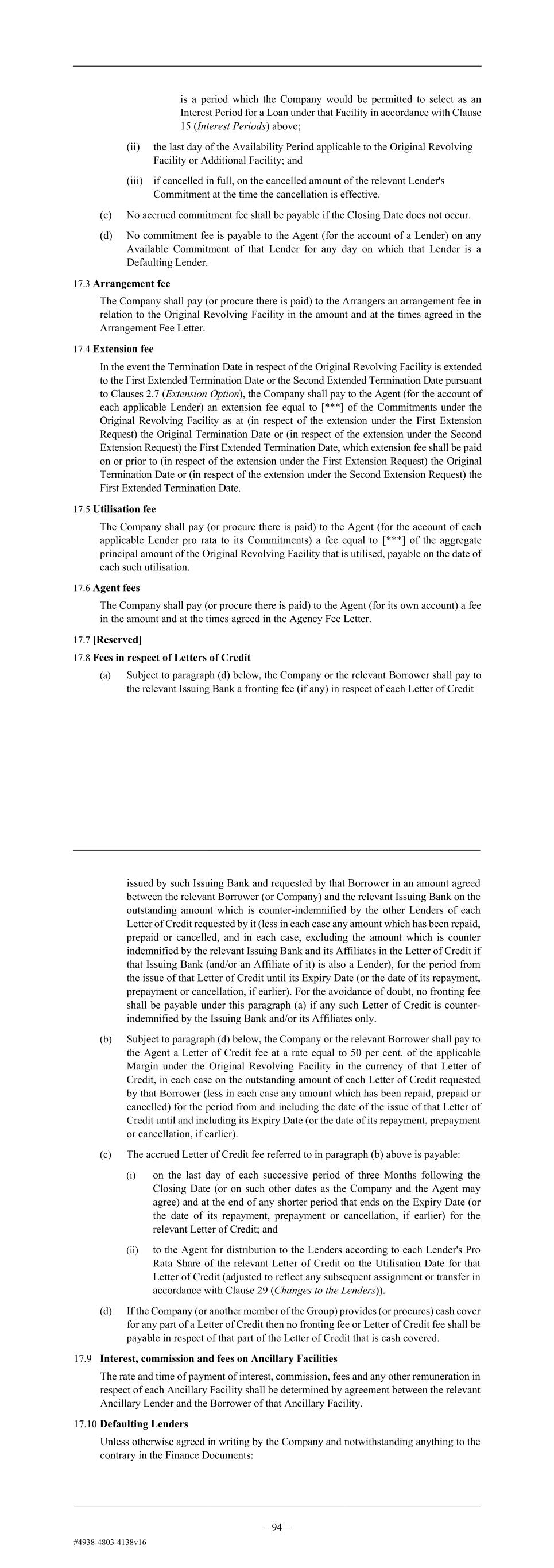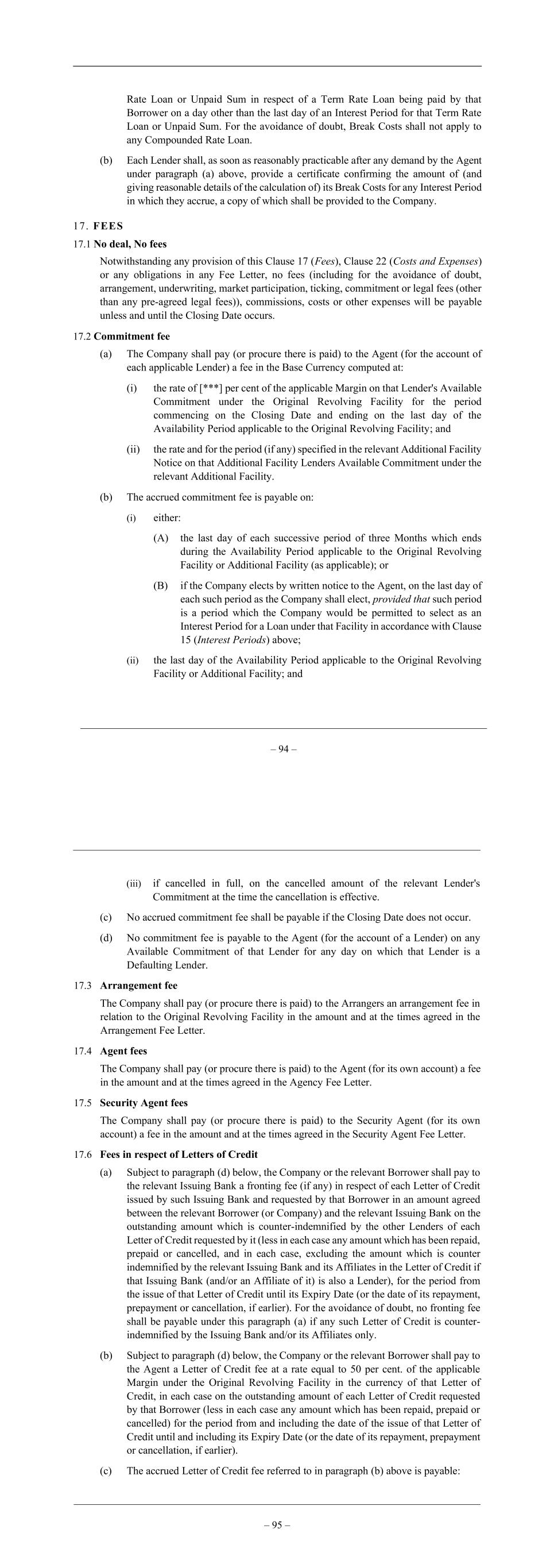 Rate Loan or Unpaid Sum in respect of a Term Rate Loan being paid by that Borrower on a day other than the last day of an Interest Period for that Term Rate Loan or Unpaid Sum. For the avoidance of doubt, Break Costs shall not apply to any Compounded Rate Loan. (b) Each Lender shall, as soon as reasonably practicable after any demand by the Agent under paragraph (a) above, provide a certificate confirming the amount of (and giving reasonable details of the calculation of) its Break Costs for any Interest Period in which they accrue, a copy of which shall be provided to the Company. 17. FEES 17.1 No deal, No fees Notwithstanding any provision of this Clause 17 (Fees), Clause 22 (Costs and Expenses) or any obligations in any Fee Letter, no fees (including for the avoidance of doubt, arrangement, underwriting, market participation, ticking, commitment or legal fees (other than any pre-agreed legal fees)), commissions, costs or other expenses will be payable unless and until the Closing Date occurs. 17.2 Commitment fee (a) The Company shall pay (or procure there is paid) to the Agent (for the account of each applicable Lender) a fee in the Base Currency computed at: (i) the rate of [***] per cent of the applicable Margin on that Lender's Available Commitment under the Original Revolving Facility for the period commencing on the Closing Date and ending on the last day of the Availability Period applicable to the Original Revolving Facility; and (ii) the rate and for the period (if any) specified in the relevant Additional Facility Notice on that Additional Facility Lenders Available Commitment under the relevant Additional Facility. (b) The accrued commitment fee is payable on: (i) either: (A) the last day of each successive period of three Months which ends during the Availability Period applicable to the Original Revolving Facility or Additional Facility (as applicable); or (B) if the Company elects by written notice to the Agent, on the last day of each such period as the Company shall elect, provided that such period is a period which the Company would be permitted to select as an Interest Period for a Loan under that Facility in accordance with Clause 15 (Interest Periods) above; (ii) the last day of the Availability Period applicable to the Original Revolving Facility or Additional Facility; and – 94 – – 95 – (iii) if cancelled in full, on the cancelled amount of the relevant Lender's Commitment at the time the cancellation is effective. (c) No accrued commitment fee shall be payable if the Closing Date does not occur. (d) No commitment fee is payable to the Agent (for the account of a Lender) on any Available Commitment of that Lender for any day on which that Lender is a Defaulting Lender. 17.3 Arrangement fee The Company shall pay (or procure there is paid) to the Arrangers an arrangement fee in relation to the Original Revolving Facility in the amount and at the times agreed in the Arrangement Fee Letter. 17.4 Agent fees The Company shall pay (or procure there is paid) to the Agent (for its own account) a fee in the amount and at the times agreed in the Agency Fee Letter. 17.5 Security Agent fees The Company shall pay (or procure there is paid) to the Security Agent (for its own account) a fee in the amount and at the times agreed in the Security Agent Fee Letter. 17.6 Fees in respect of Letters of Credit (a) Subject to paragraph (d) below, the Company or the relevant Borrower shall pay to the relevant Issuing Bank a fronting fee (if any) in respect of each Letter of Credit issued by such Issuing Bank and requested by that Borrower in an amount agreed between the relevant Borrower (or Company) and the relevant Issuing Bank on the outstanding amount which is counter-indemnified by the other Lenders of each Letter of Credit requested by it (less in each case any amount which has been repaid, prepaid or cancelled, and in each case, excluding the amount which is counter indemnified by the relevant Issuing Bank and its Affiliates in the Letter of Credit if that Issuing Bank (and/or an Affiliate of it) is also a Lender), for the period from the issue of that Letter of Credit until its Expiry Date (or the date of its repayment, prepayment or cancellation, if earlier). For the avoidance of doubt, no fronting fee shall be payable under this paragraph (a) if any such Letter of Credit is counter- indemnified by the Issuing Bank and/or its Affiliates only. (b) Subject to paragraph (d) below, the Company or the relevant Borrower shall pay to the Agent a Letter of Credit fee at a rate equal to 50 per cent. of the applicable Margin under the Original Revolving Facility in the currency of that Letter of Credit, in each case on the outstanding amount of each Letter of Credit requested by that Borrower (less in each case any amount which has been repaid, prepaid or cancelled) for the period from and including the date of the issue of that Letter of Credit until and including its Expiry Date (or the date of its repayment, prepayment or cancellation, if earlier). (c) The accrued Letter of Credit fee referred to in paragraph (b) above is payable: